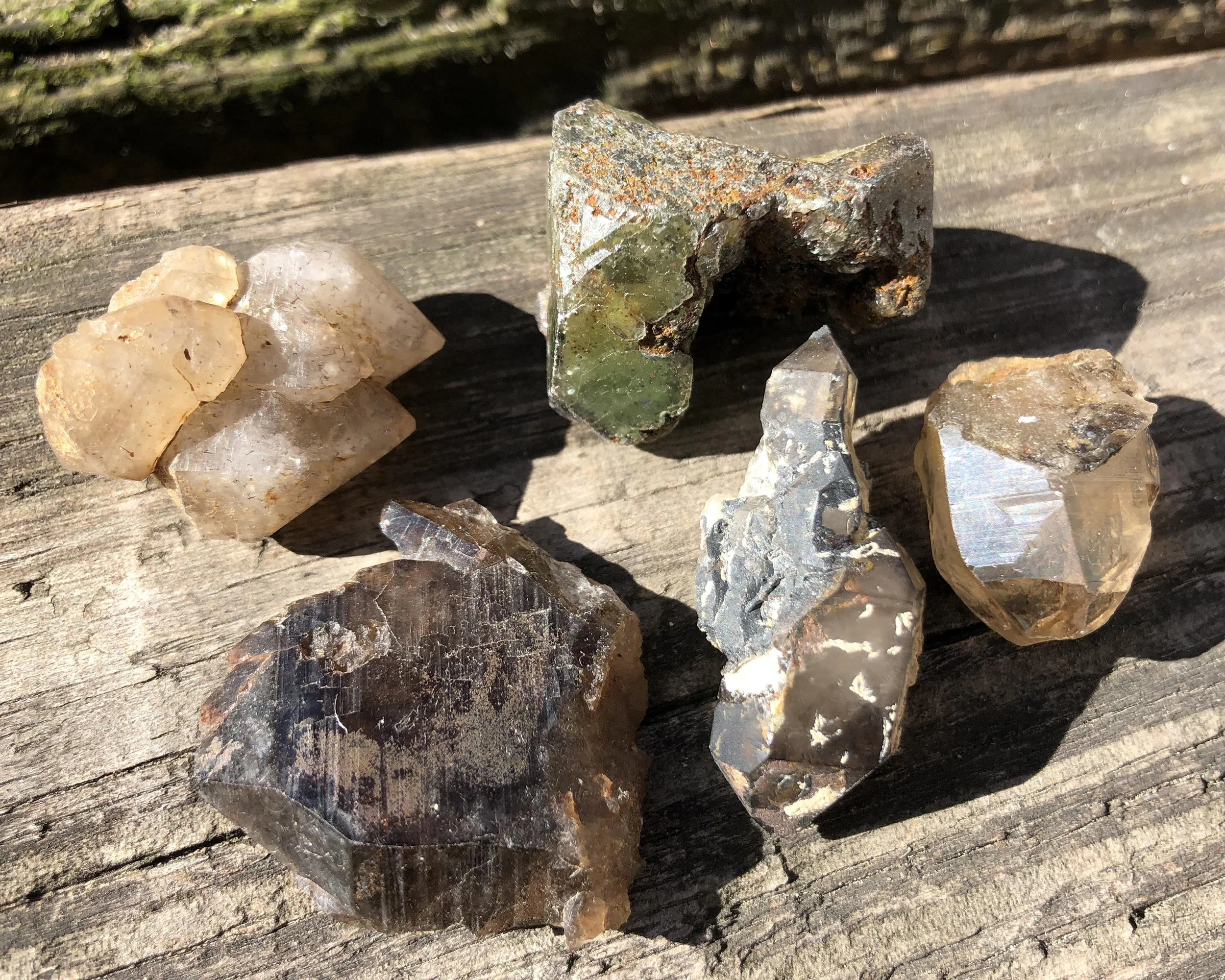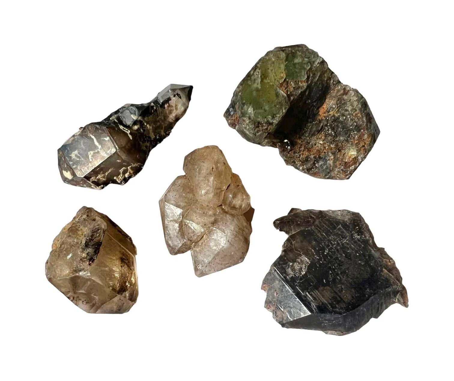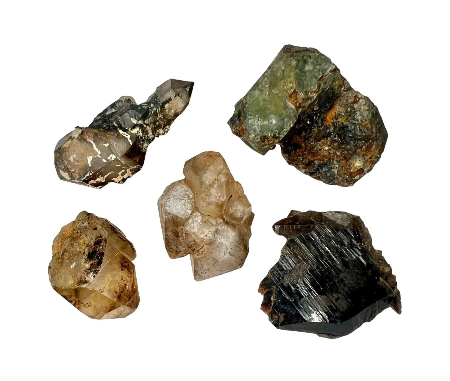 Crystal Set of Namibian Minerals: Green Fluorite, Elestial Smoky Quartz, Harlequin Quartz, Erongo Region Namibia, Mineral Specimens