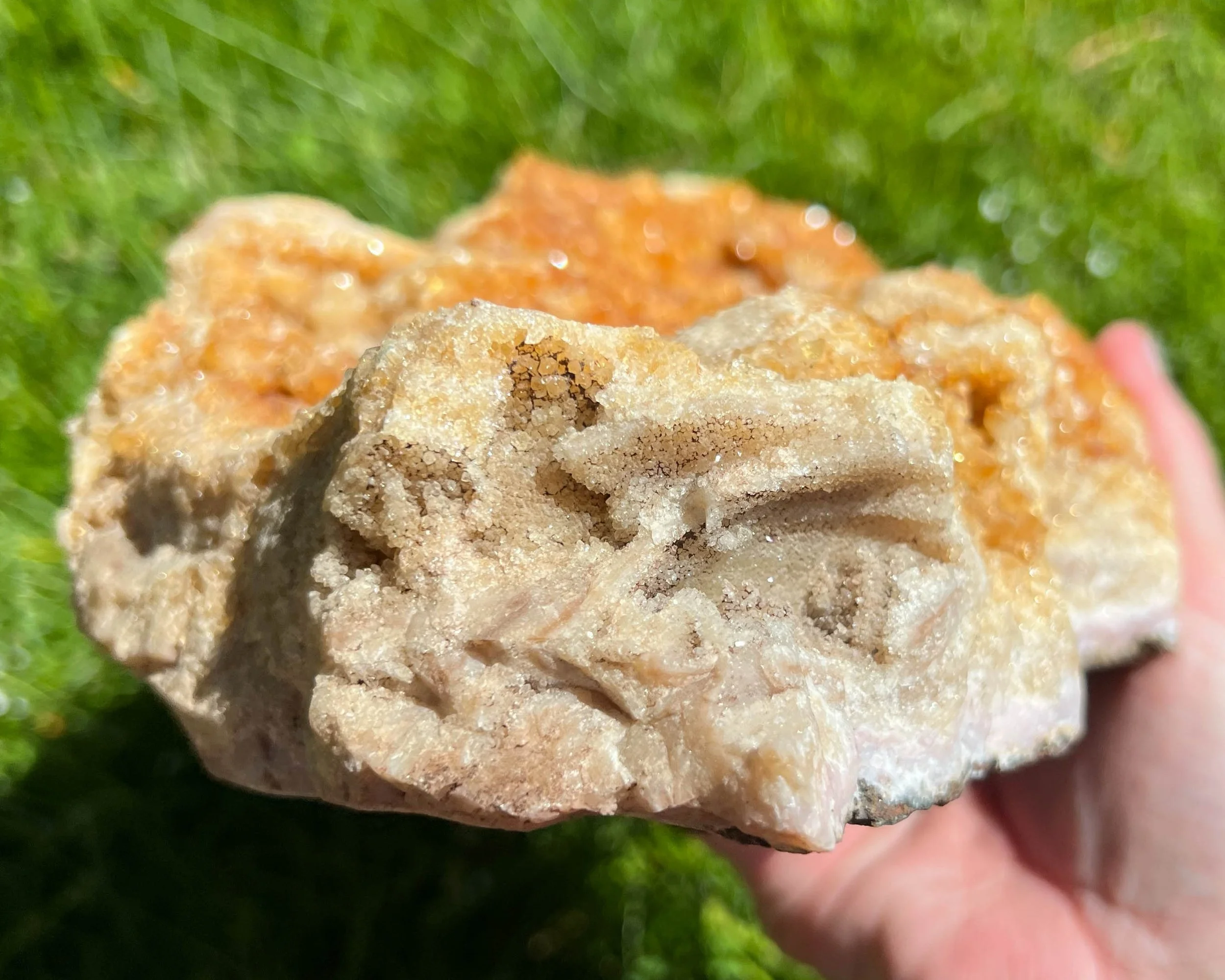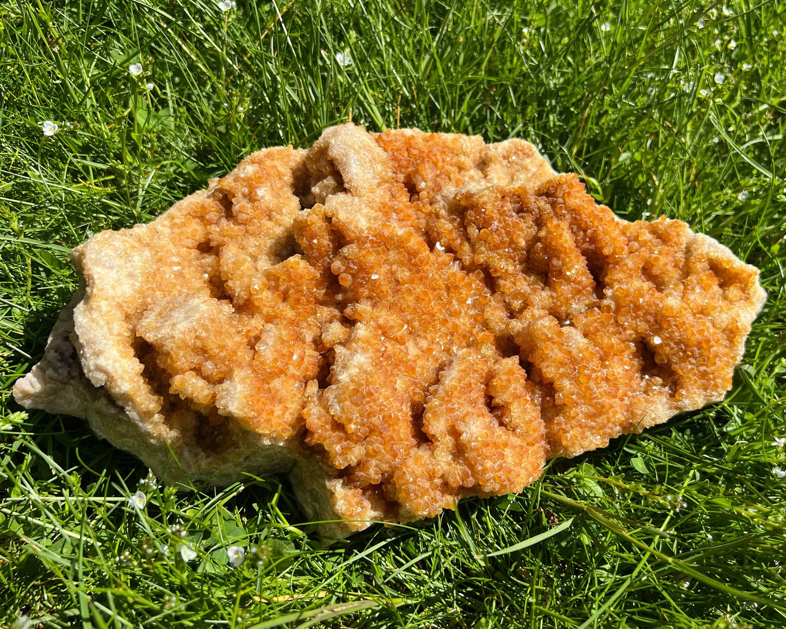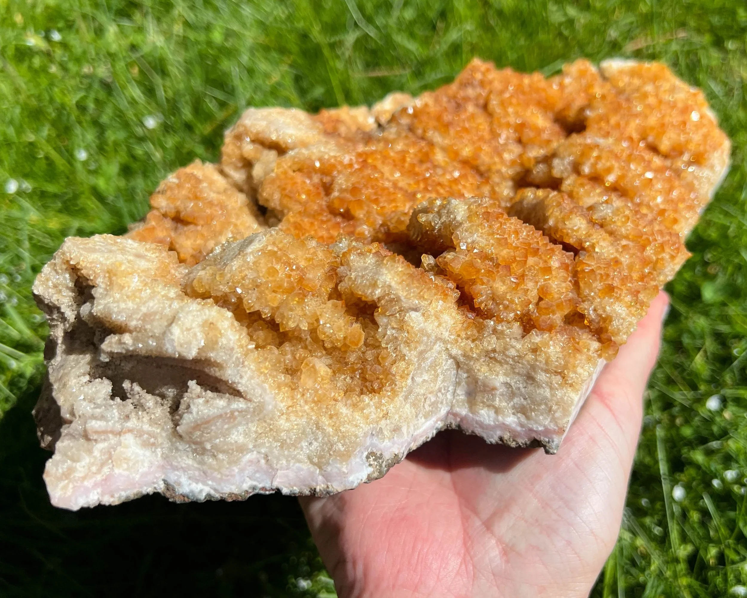 This is a large vibrant orange Citrine cluster with small sparkling crystals bright orange in color. There are stalactite and flower/ rosette formations. They are on top of a layer of banded pink Agate.