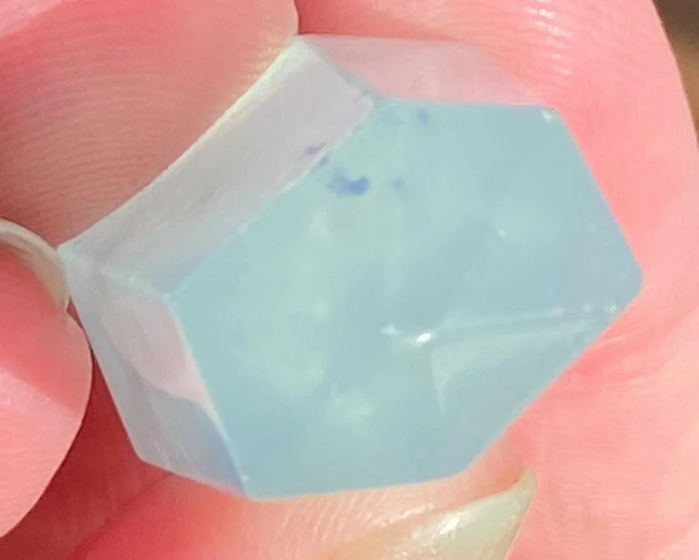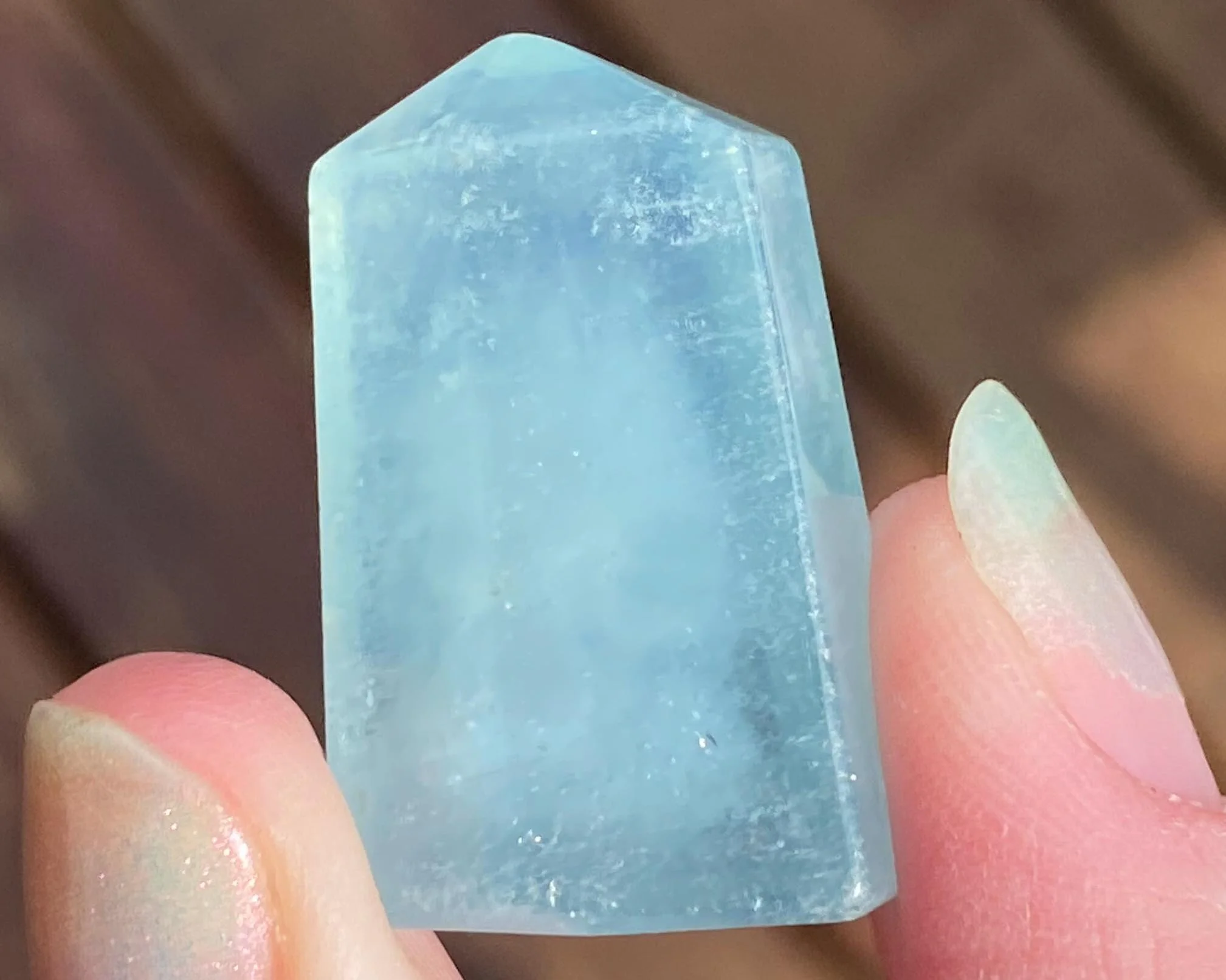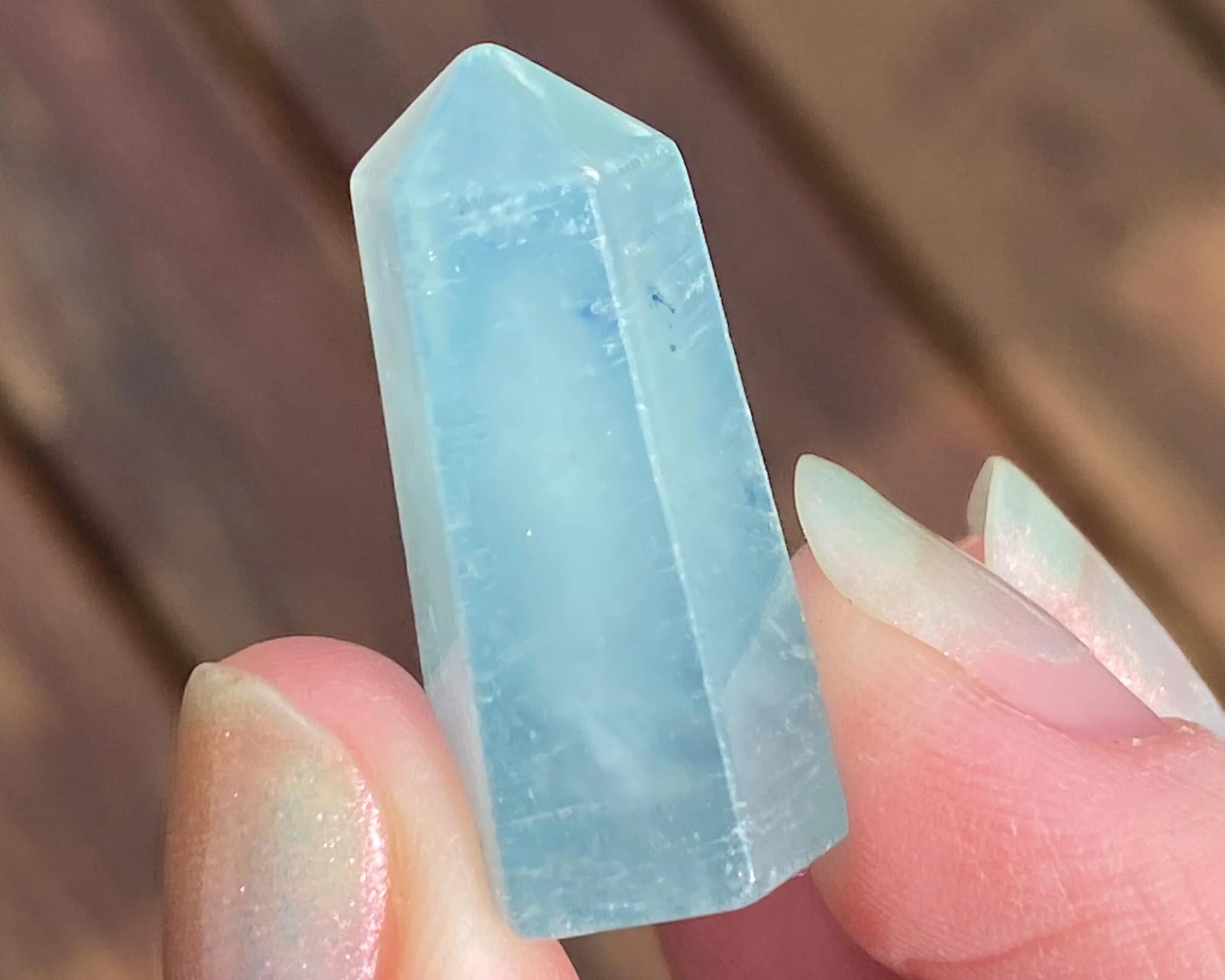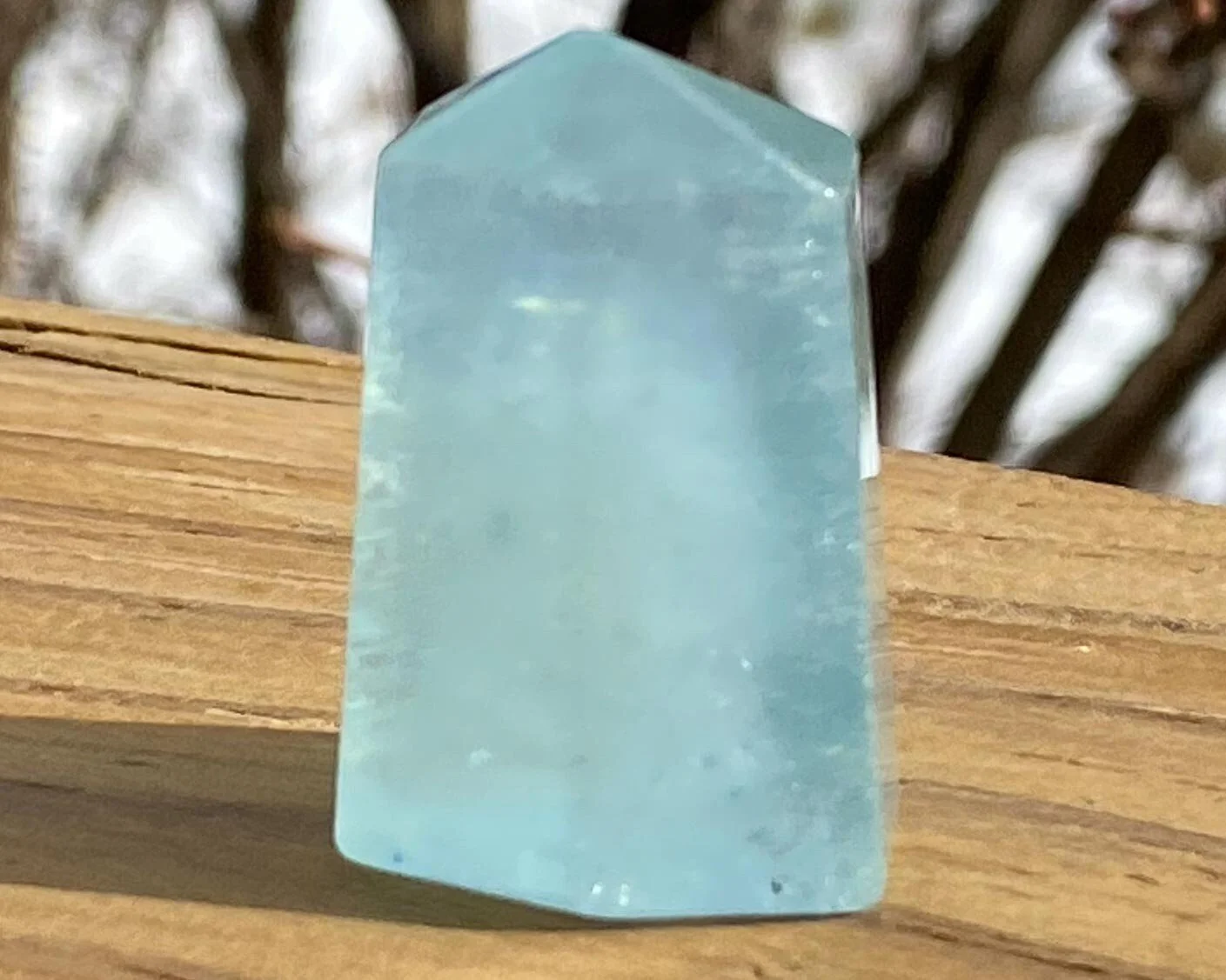 This is a beautiful little tower of Aquamarine with some Black Tourmaline in it. It has a lovely blue color and is cut and polished into a self standing point. Very pretty :)