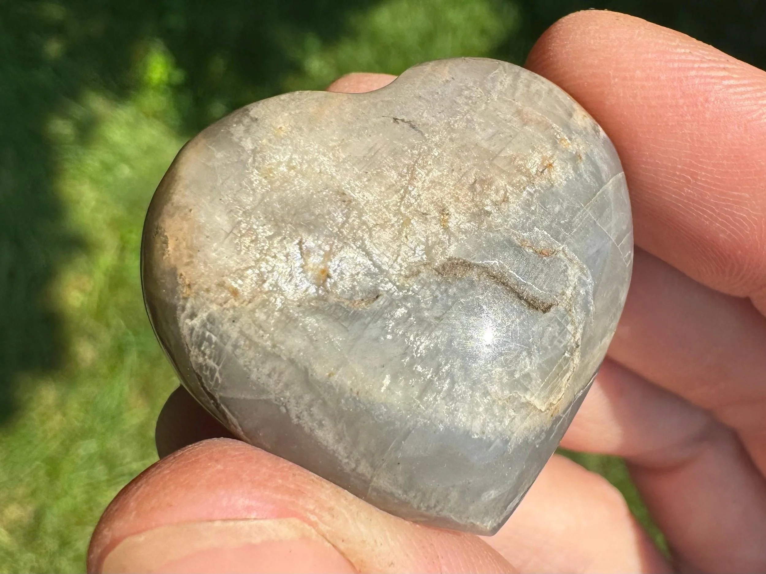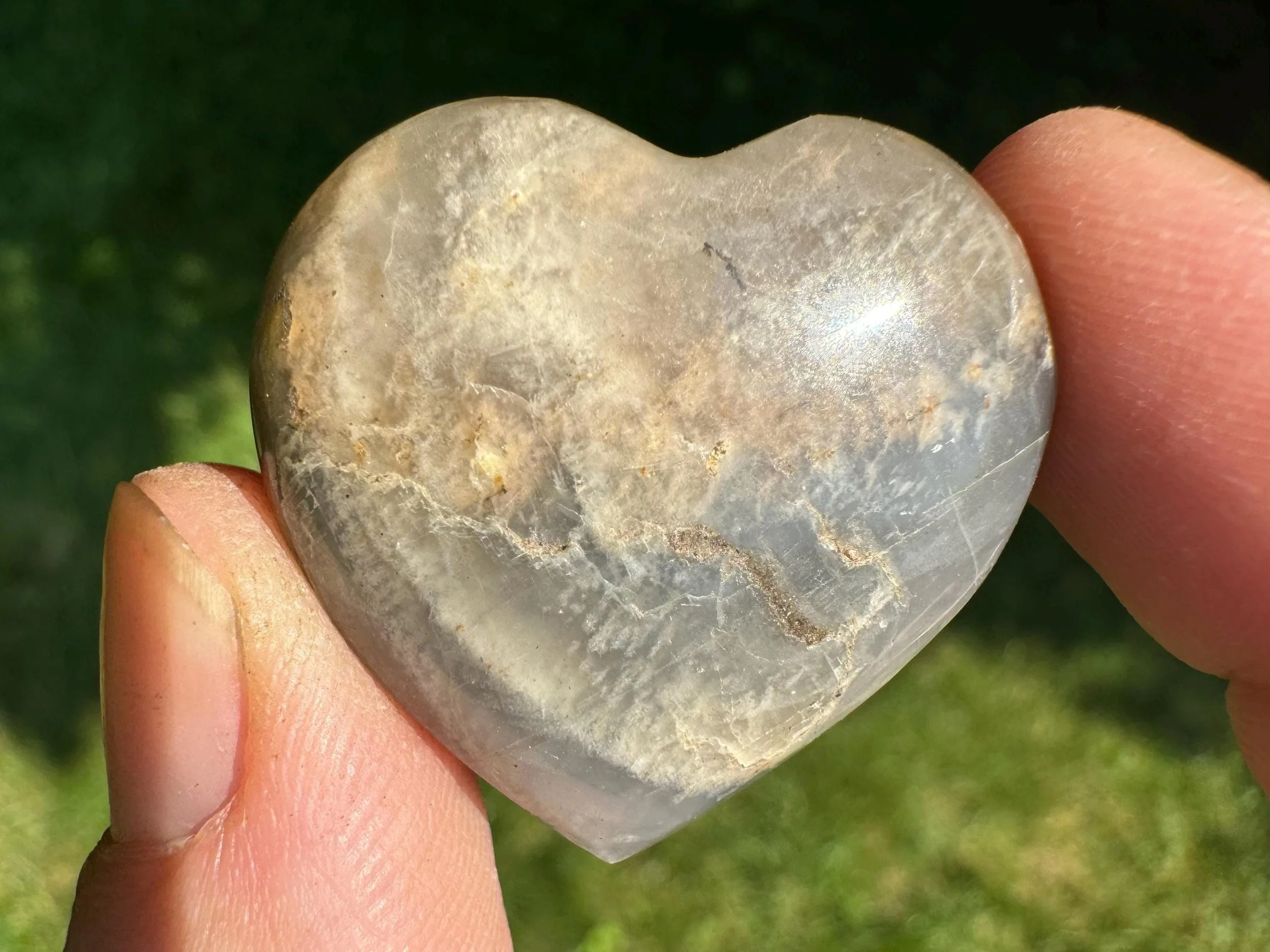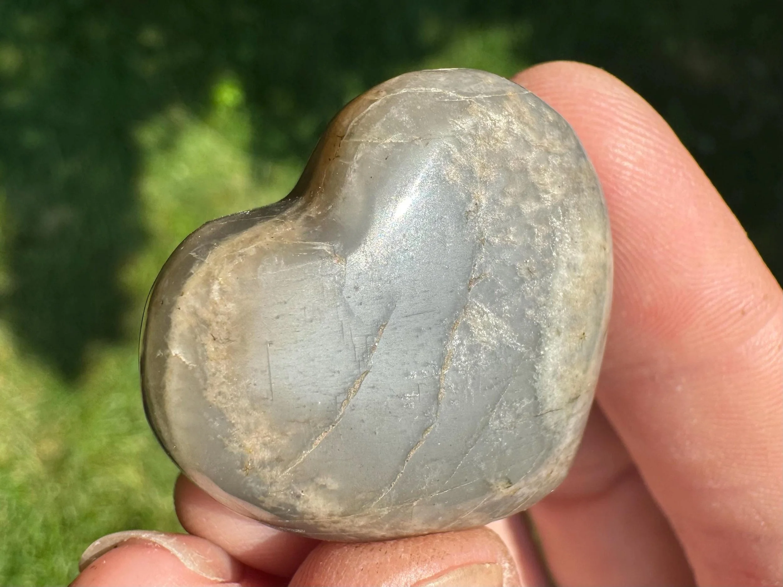 This is a little Black Moonstone heart that has a silvery blue sheen or flash that runs through it in the light. It is extra mini, perfect for pockets, purse, bra or wherever you'd like to keep it. Black Moonstone is a feldspar stone. It is a natural stone cut and polished into a heart shape. Overall color is gray with some almost peachy cream. The silver blue sheen is beautiful.
