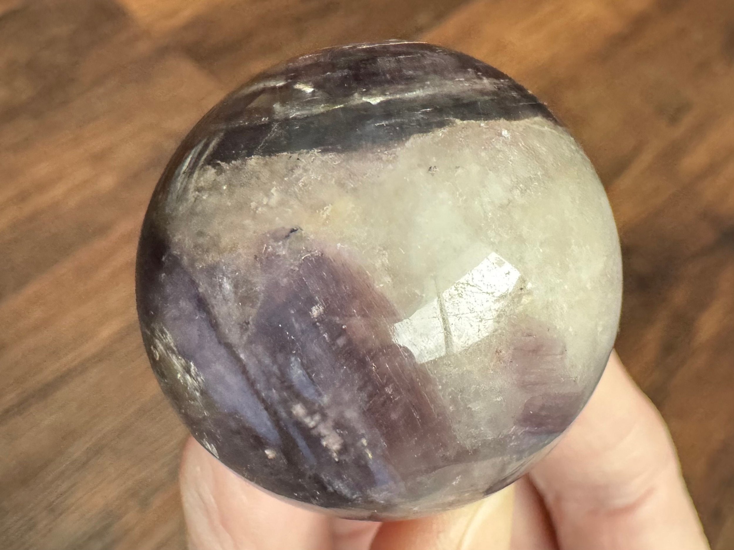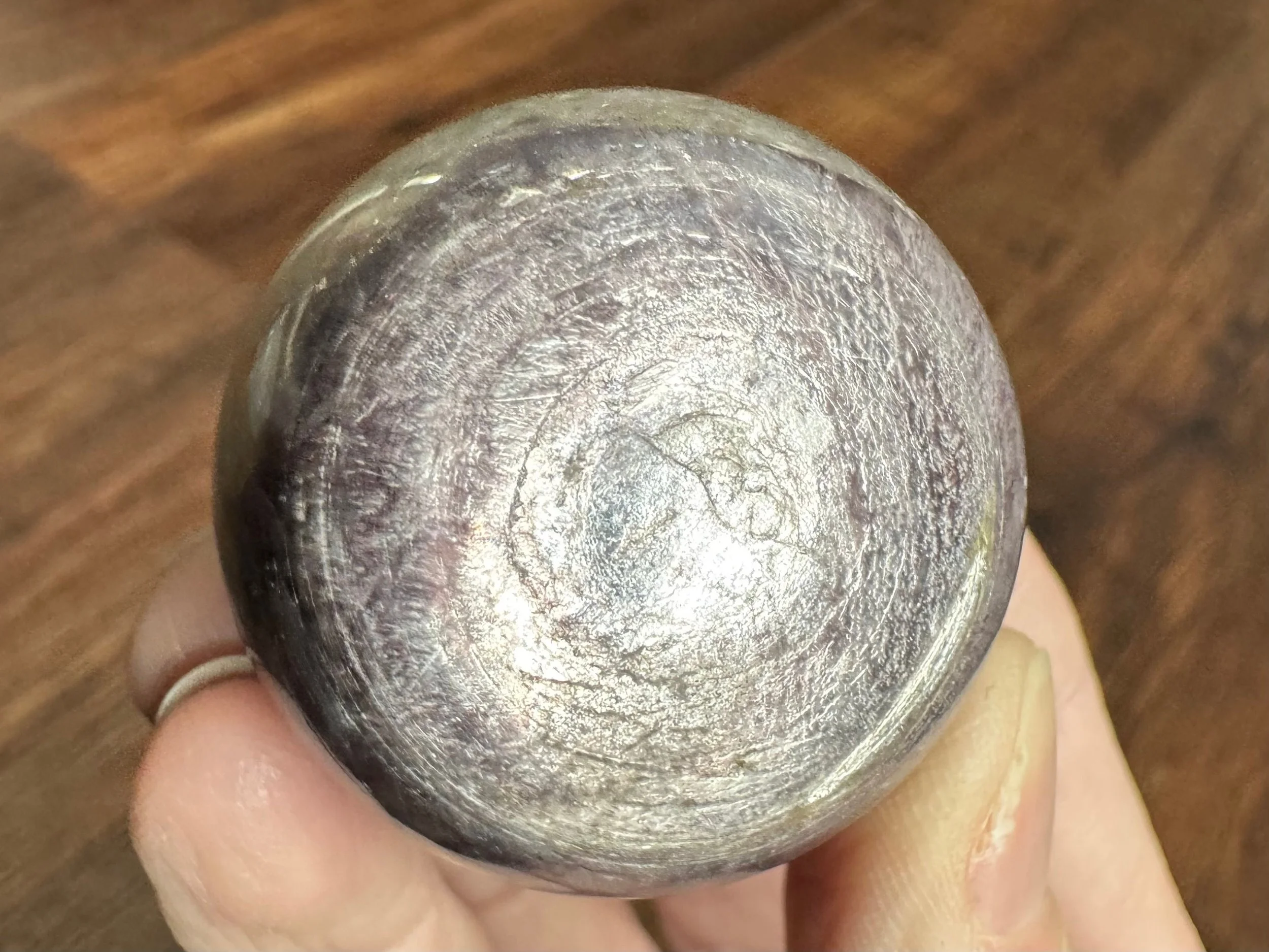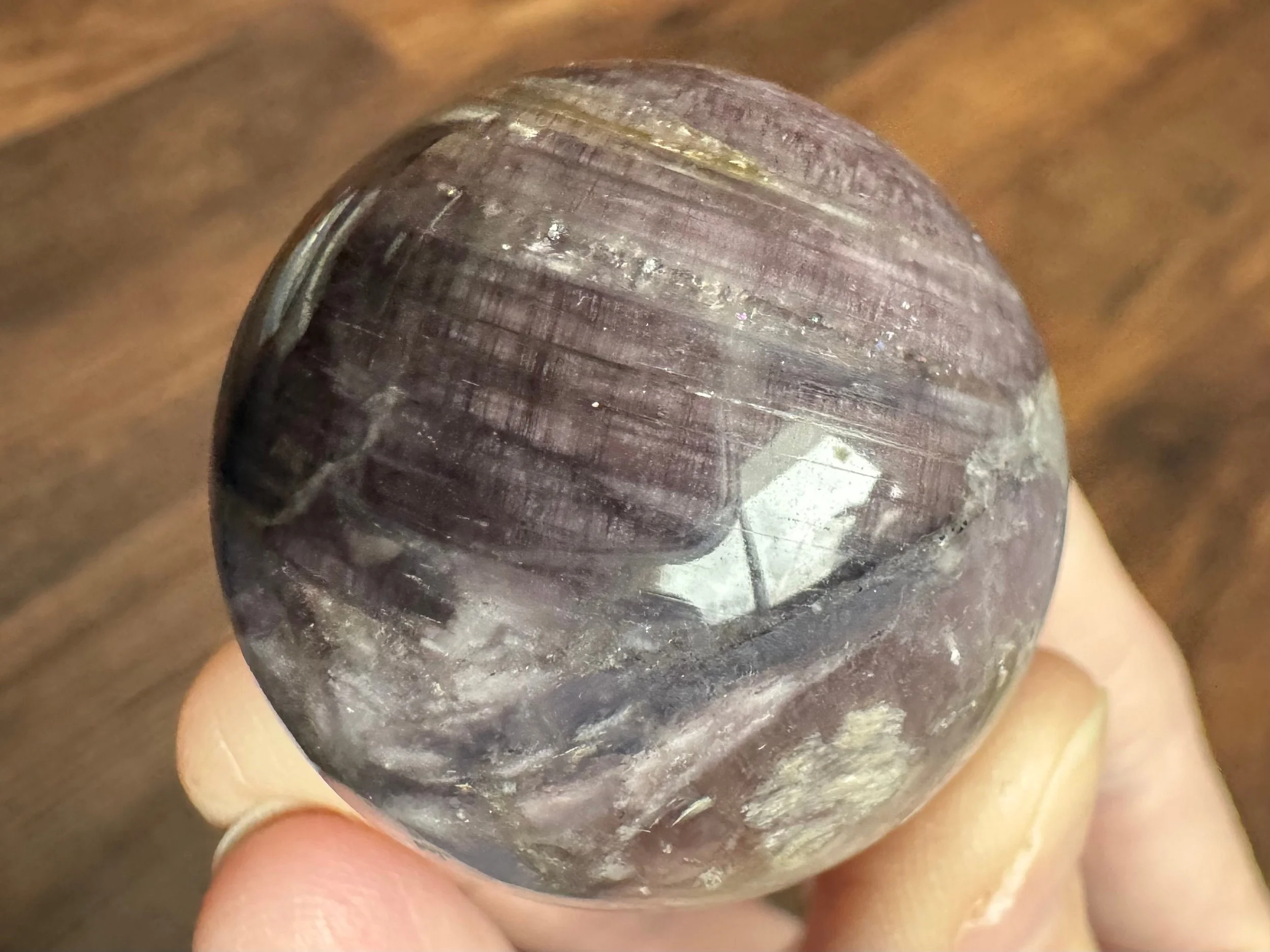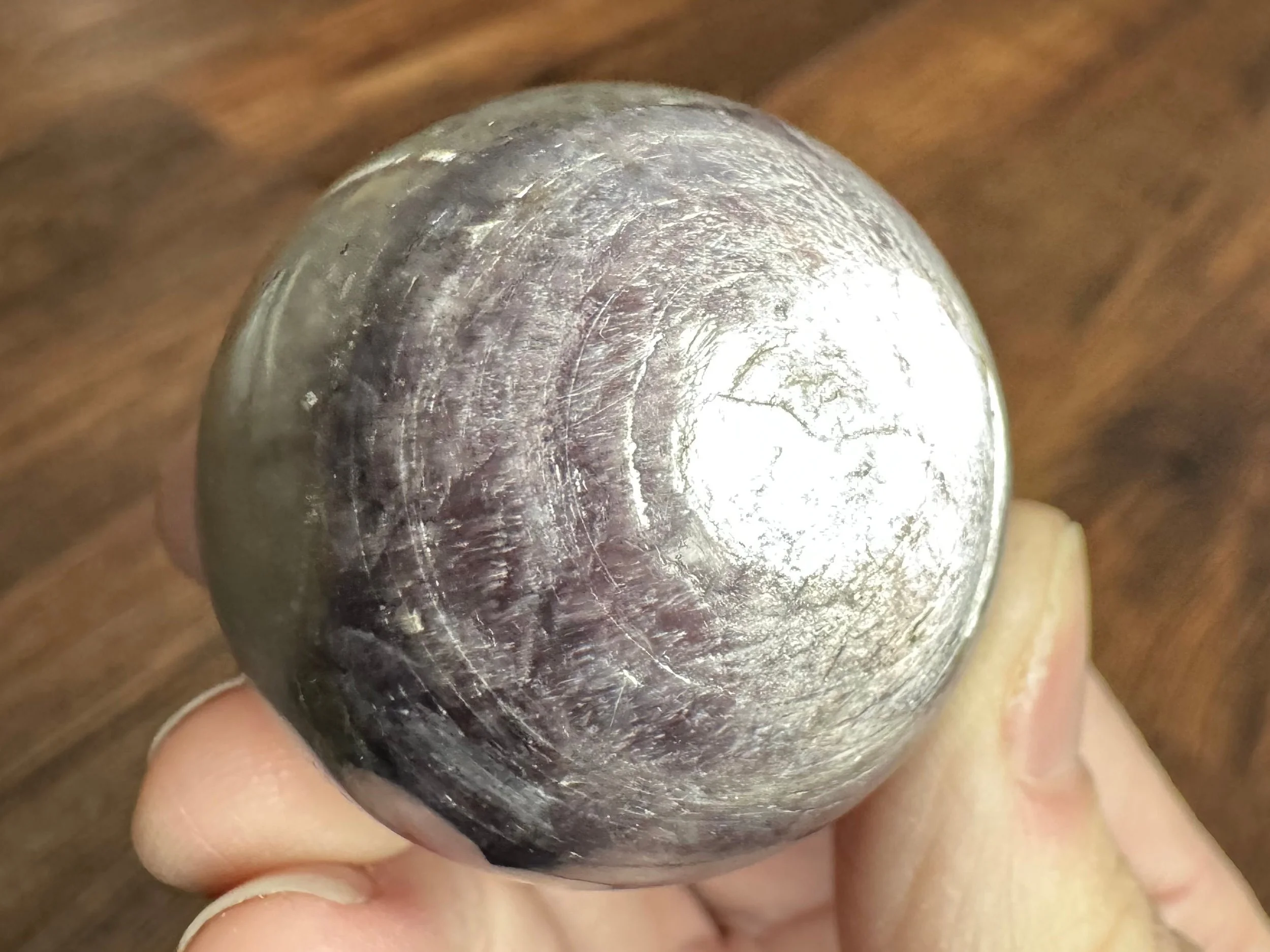 This is a gemmy Lepidolite sphere. Lepidolite is a purple to pink Mica. This sphere also has some Quartz. It is very reflective and shiny, with dark purple color that is lighter looking from the sides that it reflects more light. At the very center of the shiny part, it is slightly flat. It is smoothly polished.
