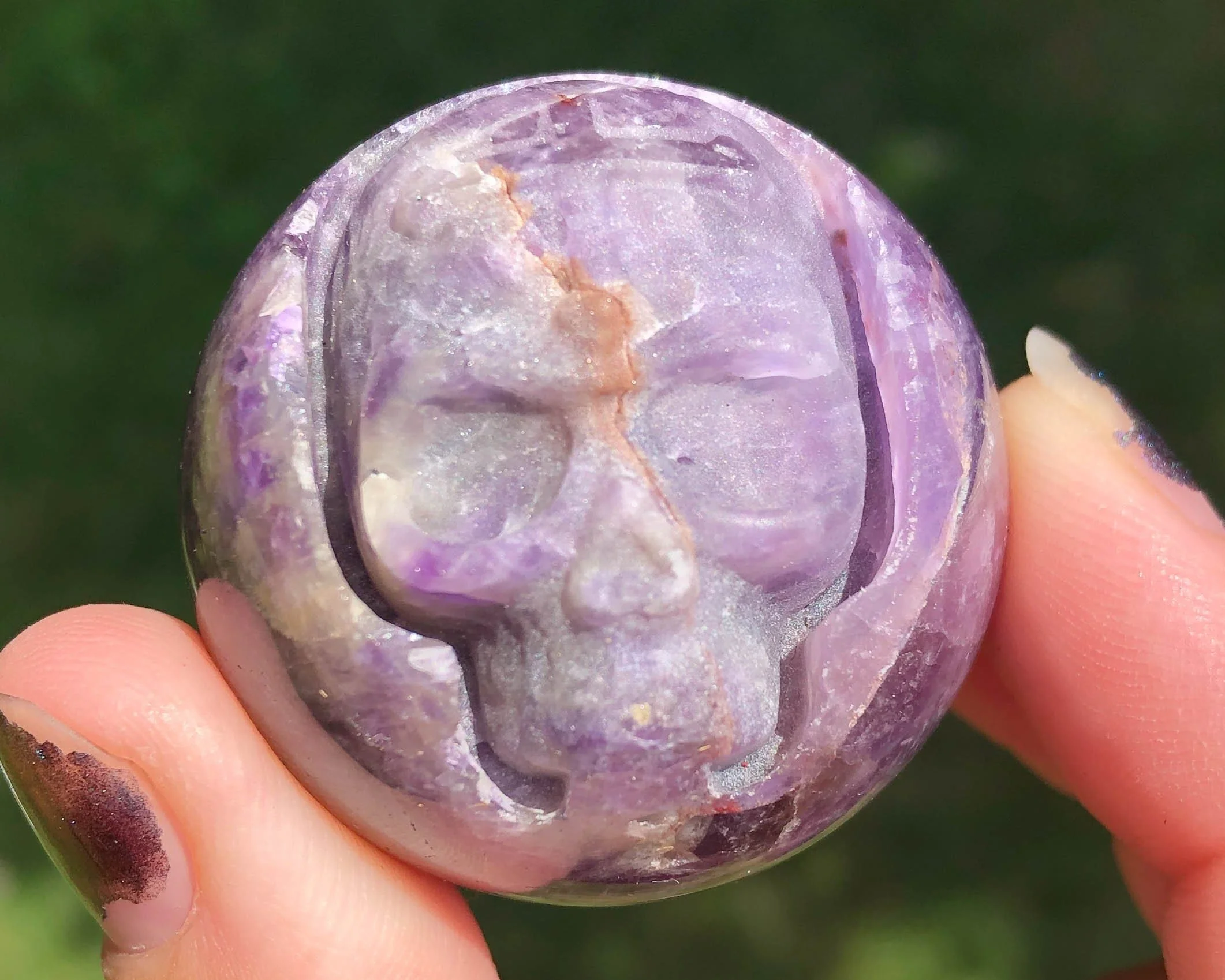 This is a gemstone sphere made of natural deep purple Chevron Amethyst with a skull carved into one side of it. It has some nice banding patterns in it too.