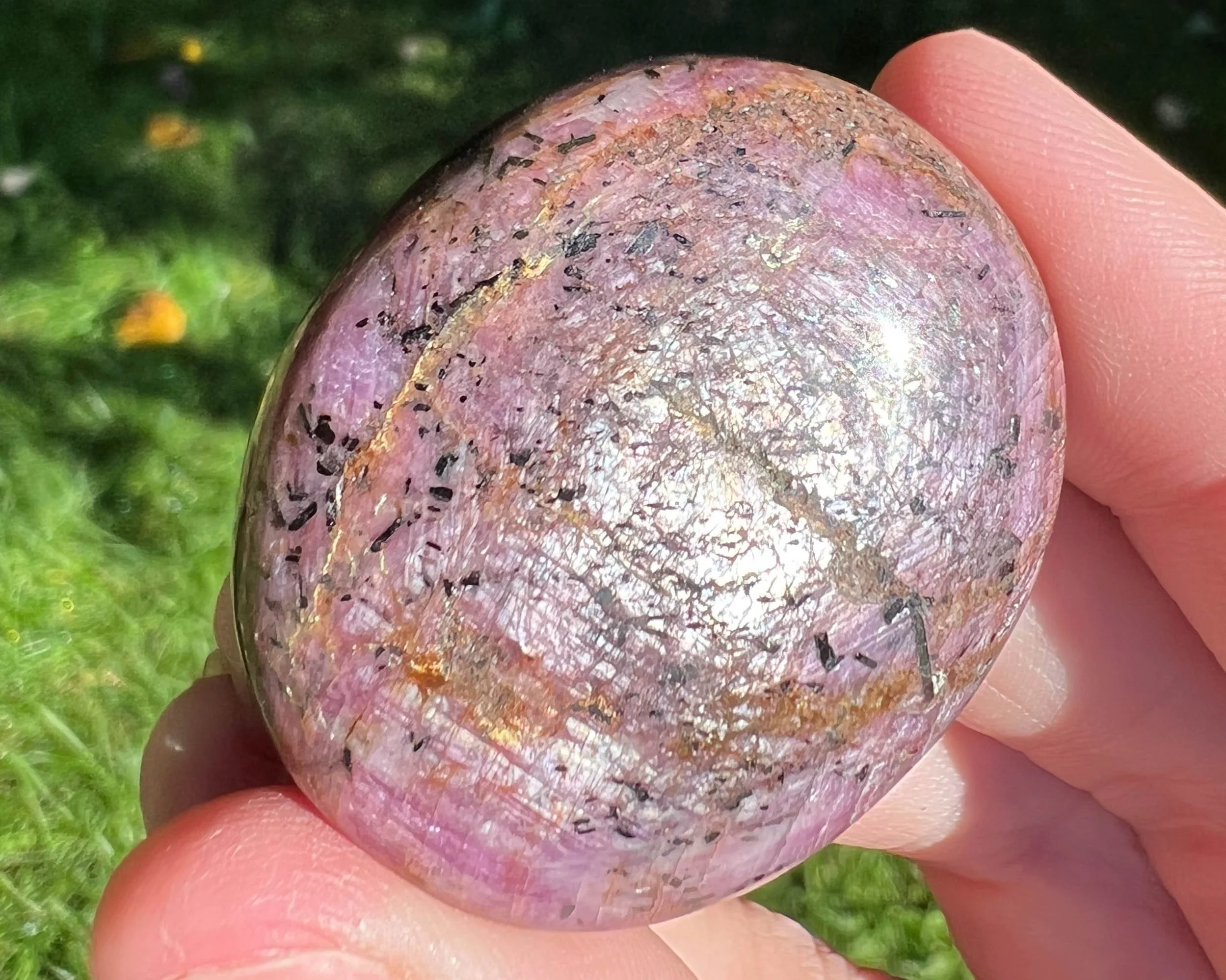 This is a gorgeous star Ruby cut and polished into a palm stone. It is chatoyant with the hexagonal pattern shining in it, and star lines that move through it with the light. A nice smooth stone great for holding in the palm.