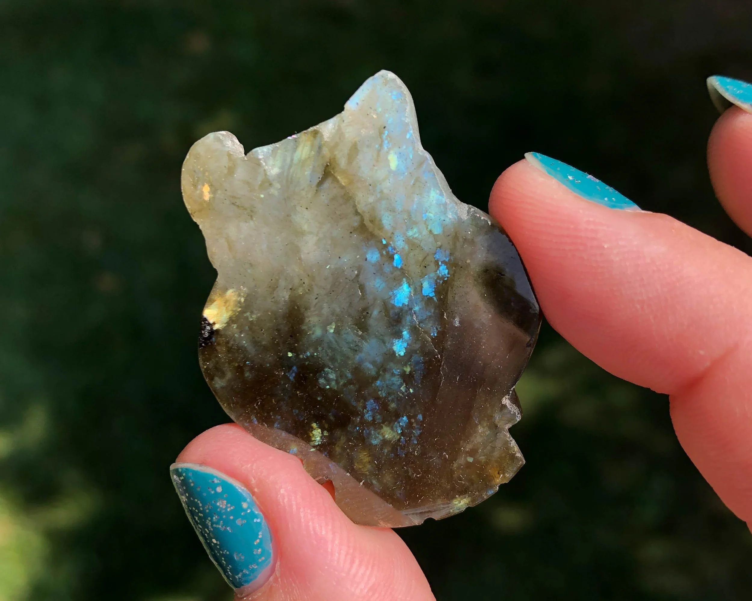 This is an owl carved out of flashy Labradorite. It is a cabochon, with a flat back. It has nice details and color. He is quite cute too! <3