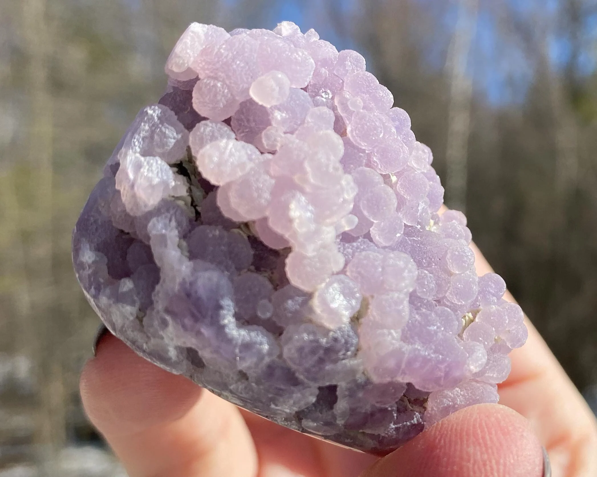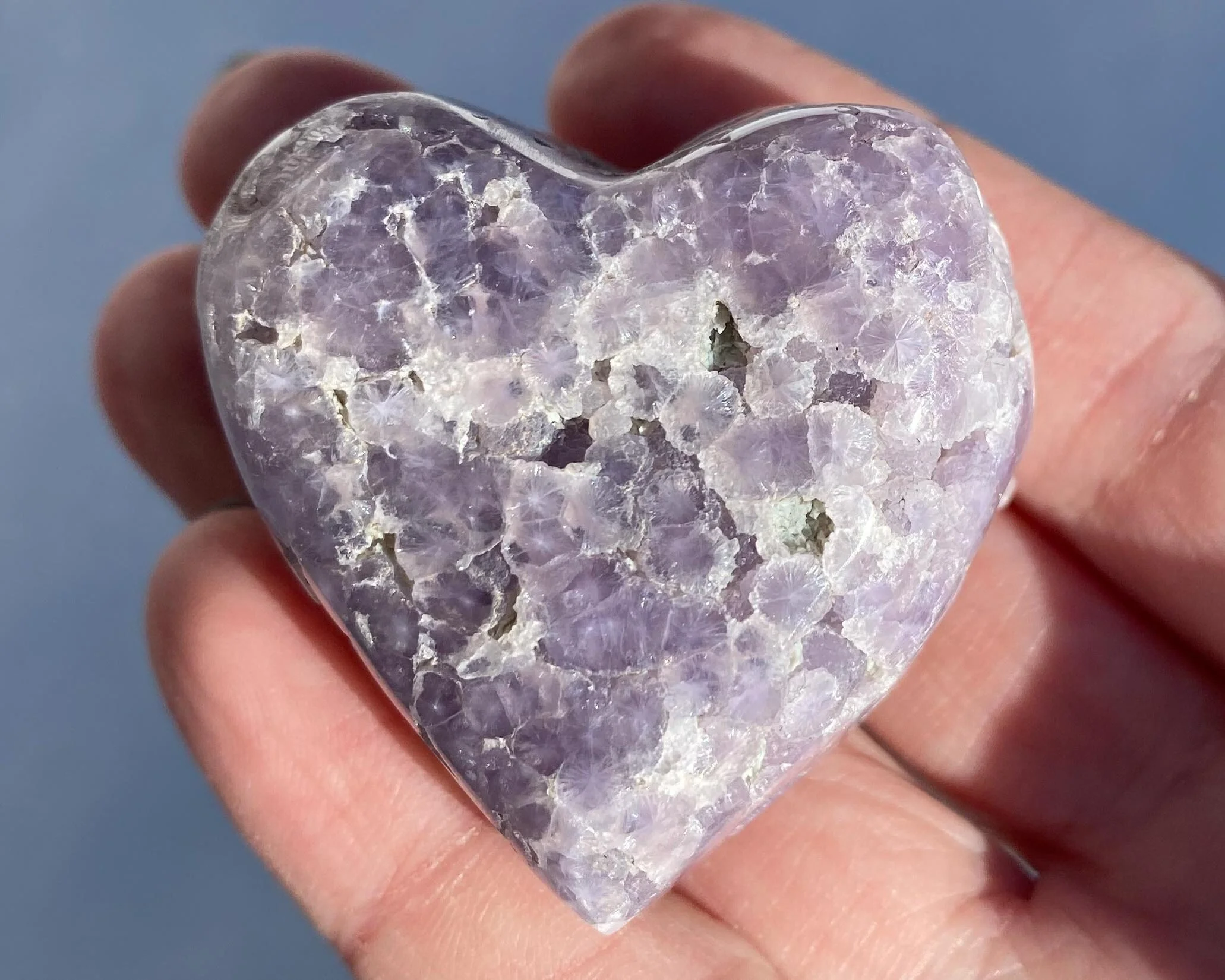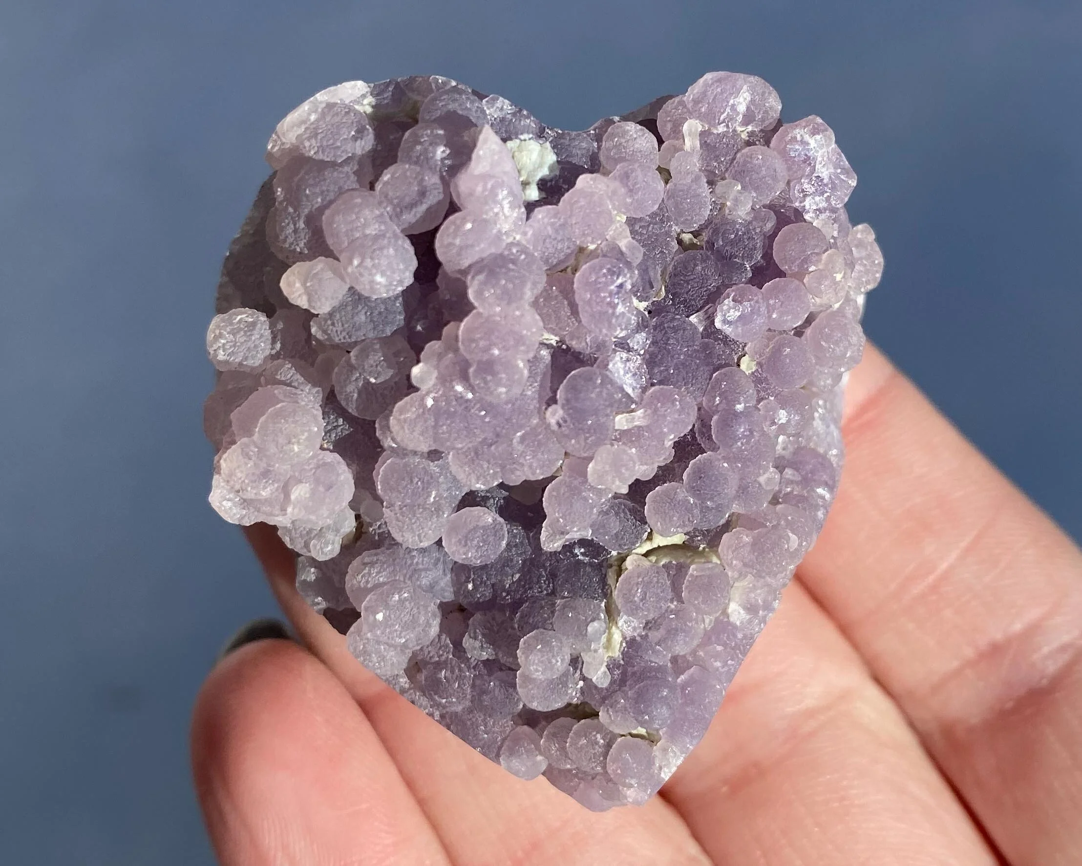 This is a beautiful semi-polished sparkly Grape Agate heart, also known as purple Botryoidal Chalcedony with Druzy Quartz. It comes from Indonesia and is not enhanced or dyed. The druzy can be very sparkly, and some has a shiny, velvety look to it. The polished area has very cool patterns with beautiful colors. Gorgeous all around!