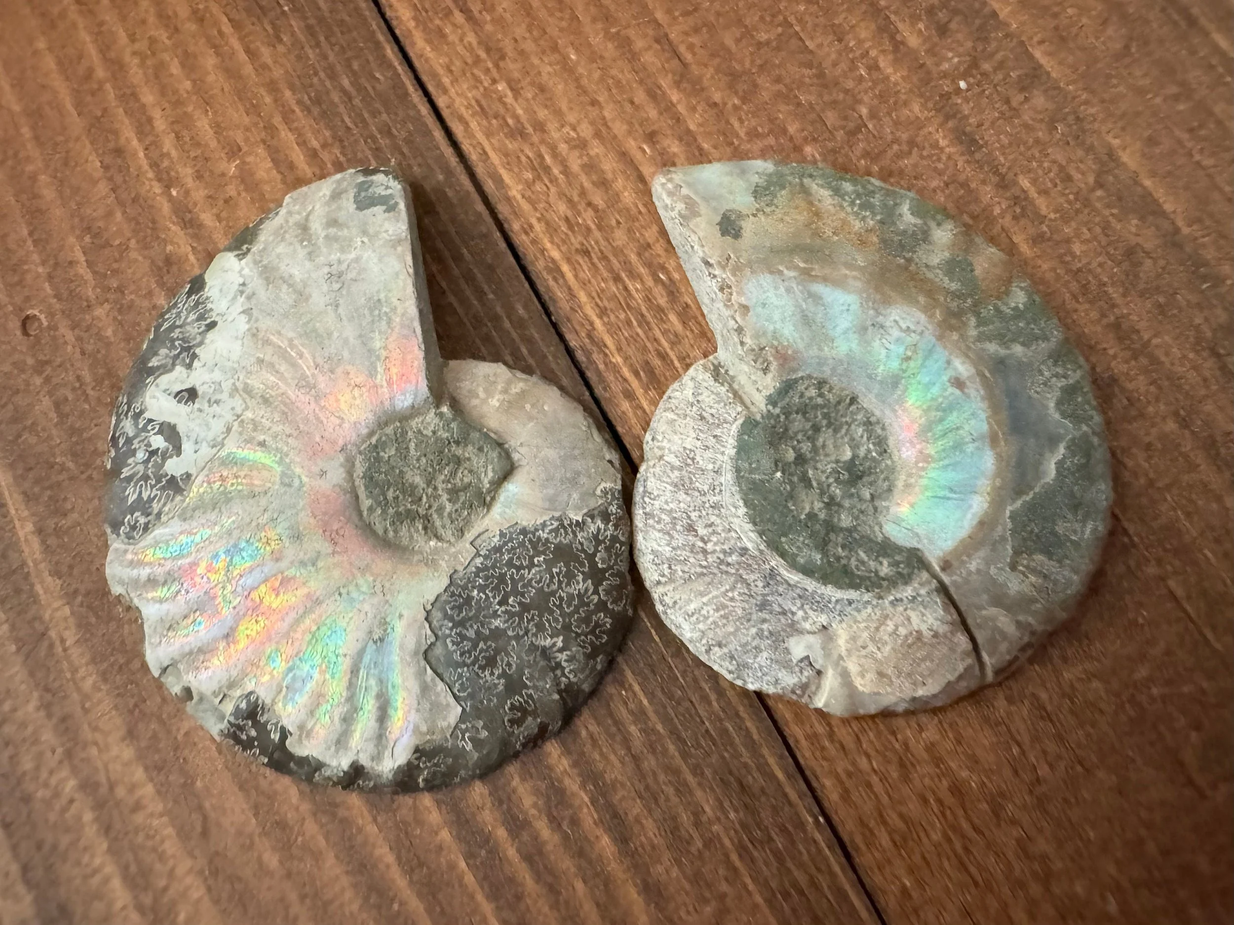 1.8" Ammonite Pair with Calcite #2 Desmoceras Fossil, Sliced Polished Matching Set, Iridescent Minerals, Science Gift for Him, Her, for Kids