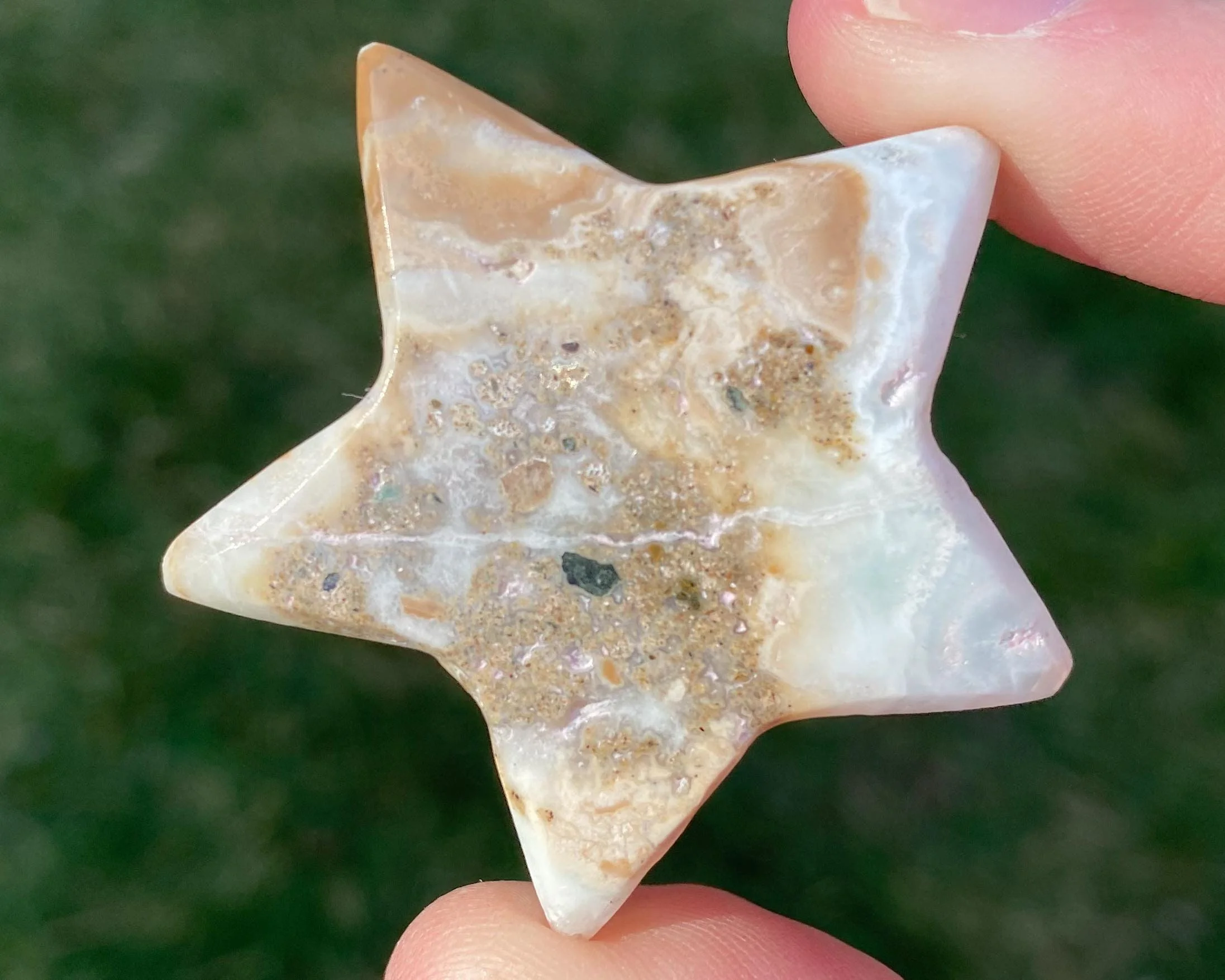 This is a star carved from beautiful aqua blue Caribbean Calcite with banded blue, white and tan reminiscent of the ocean hitting the beach. Cute star carving with natural open area of druzy. Perfect of astronomy or astrology lovers.