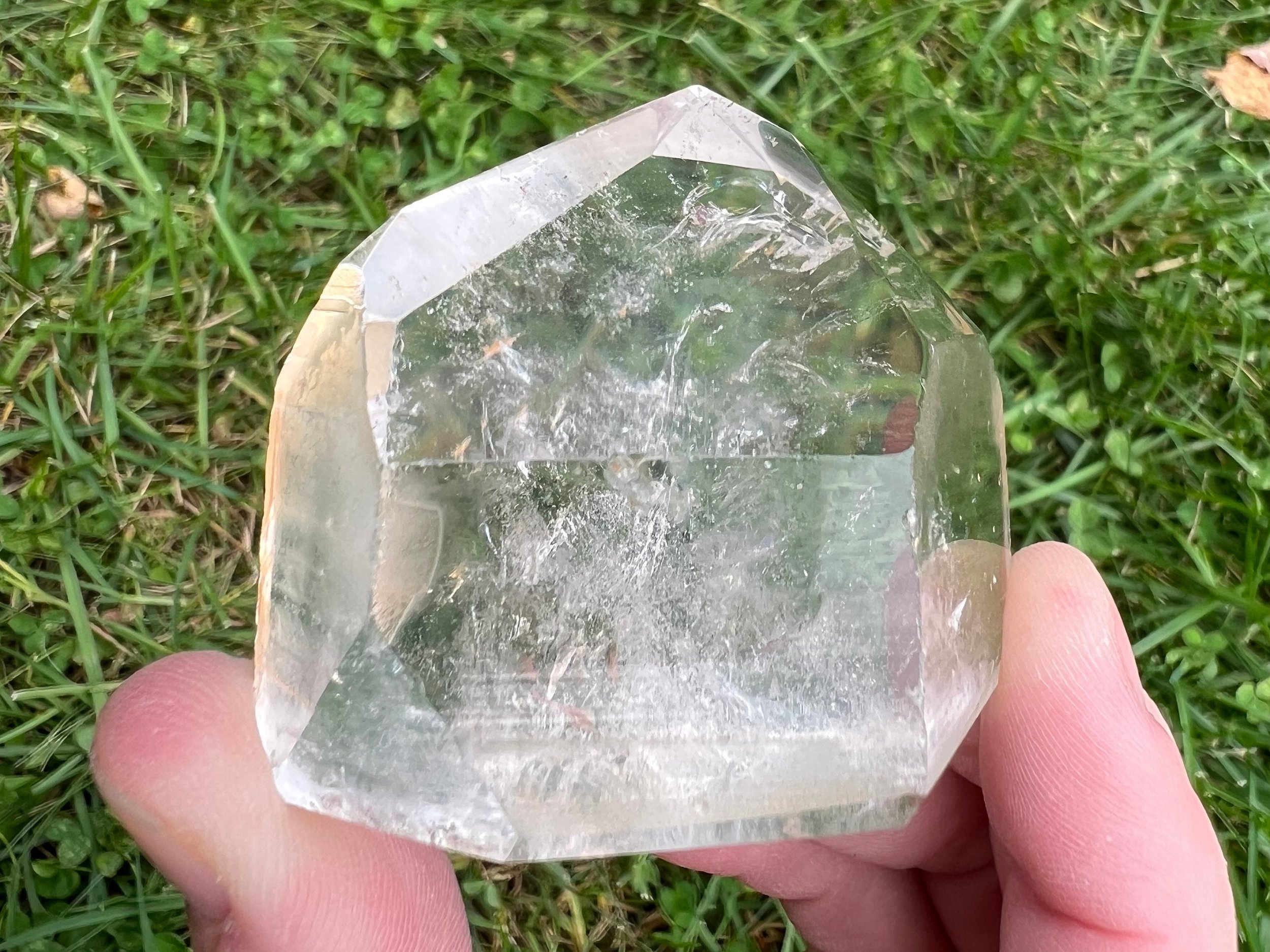 This is a gorgeous semi polished Lemurian Quartz crystal tower from Serra do Cabral in Brazil. It is self standing with some sides left natural / raw with the "ladder lines" aka striations still there. The bottom is cut and polished to stand upright. Amazing clarity too! This one has some orange hematite, also called a "Tangerine" Lemurian Quartz.