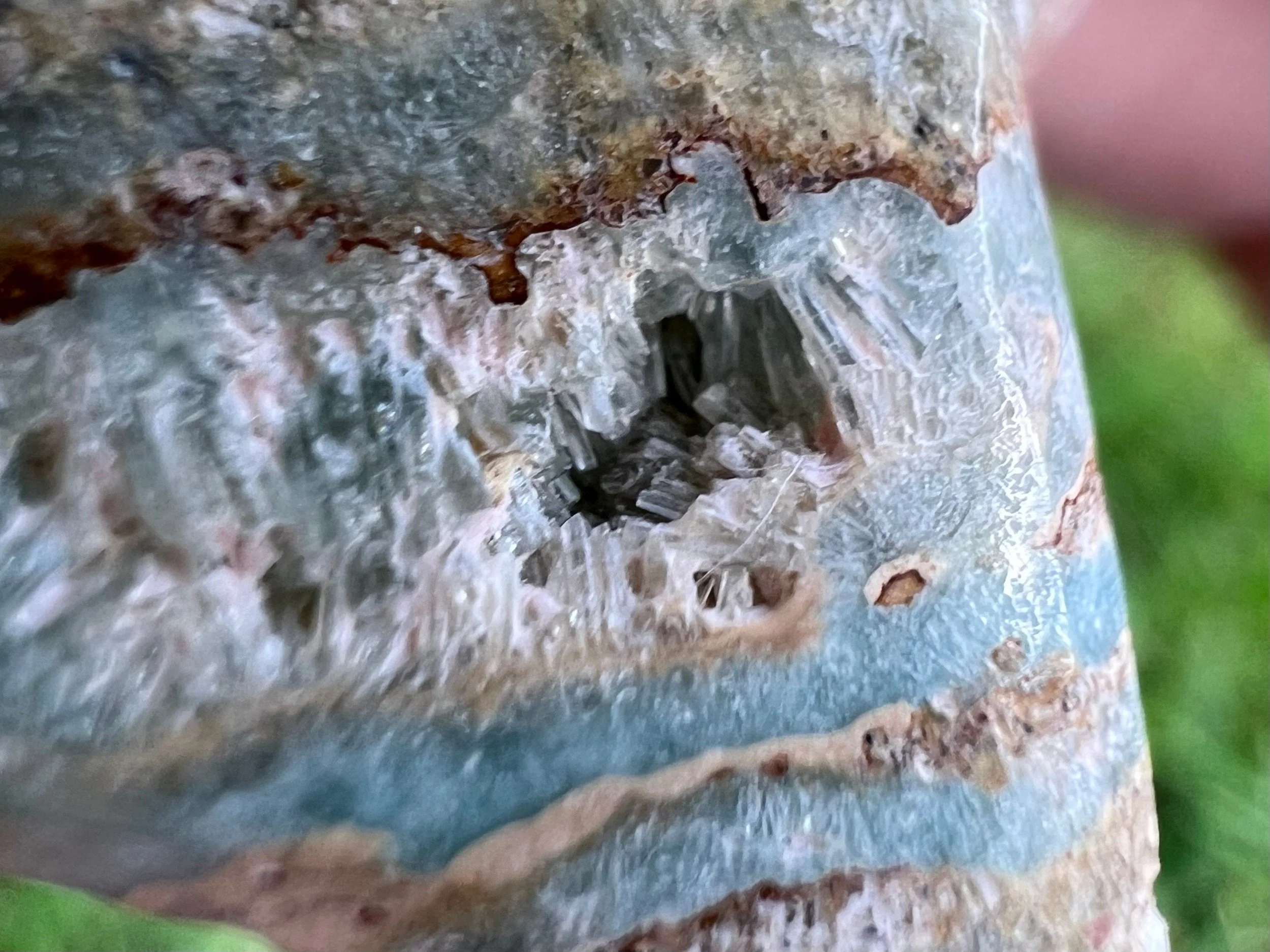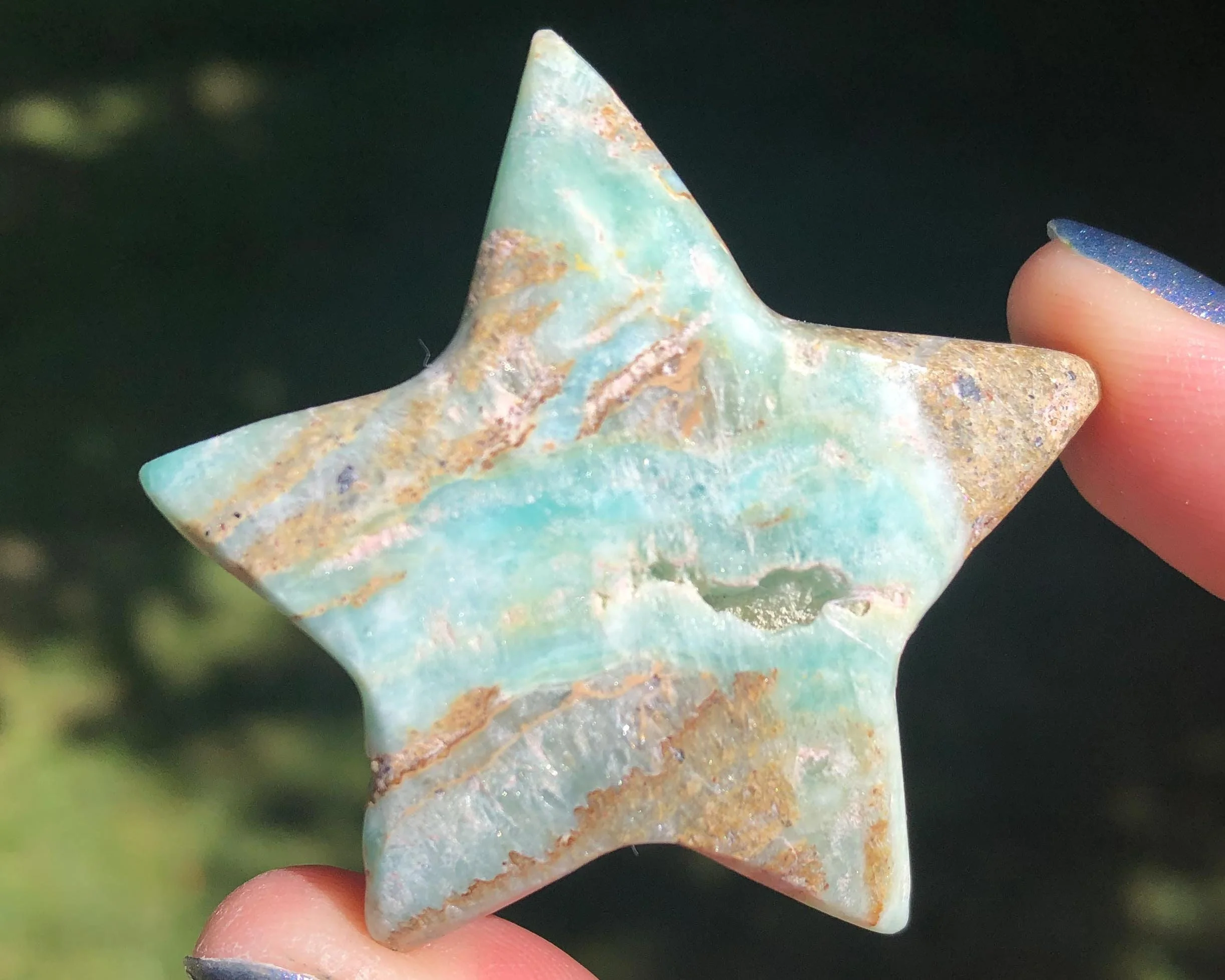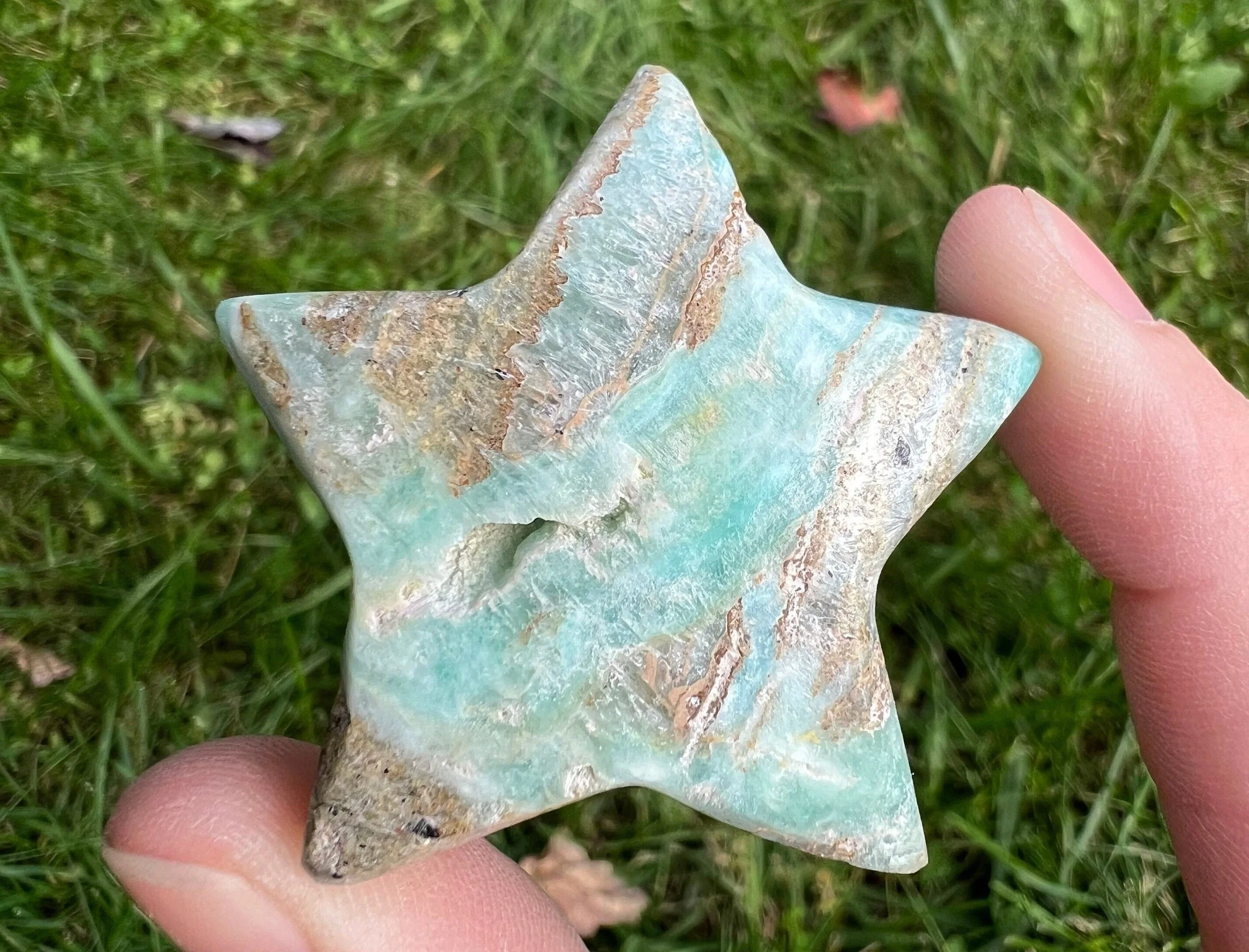 This is a crystal star carved from natural aqua blue Aragonite with an open pocket of druzy crystals. A cute star carving with pretty coloring of banded blue, white and tan. Also called Caribbean Calcite. A great gift for any crystal, astrology or astronomy lover. Very cute!