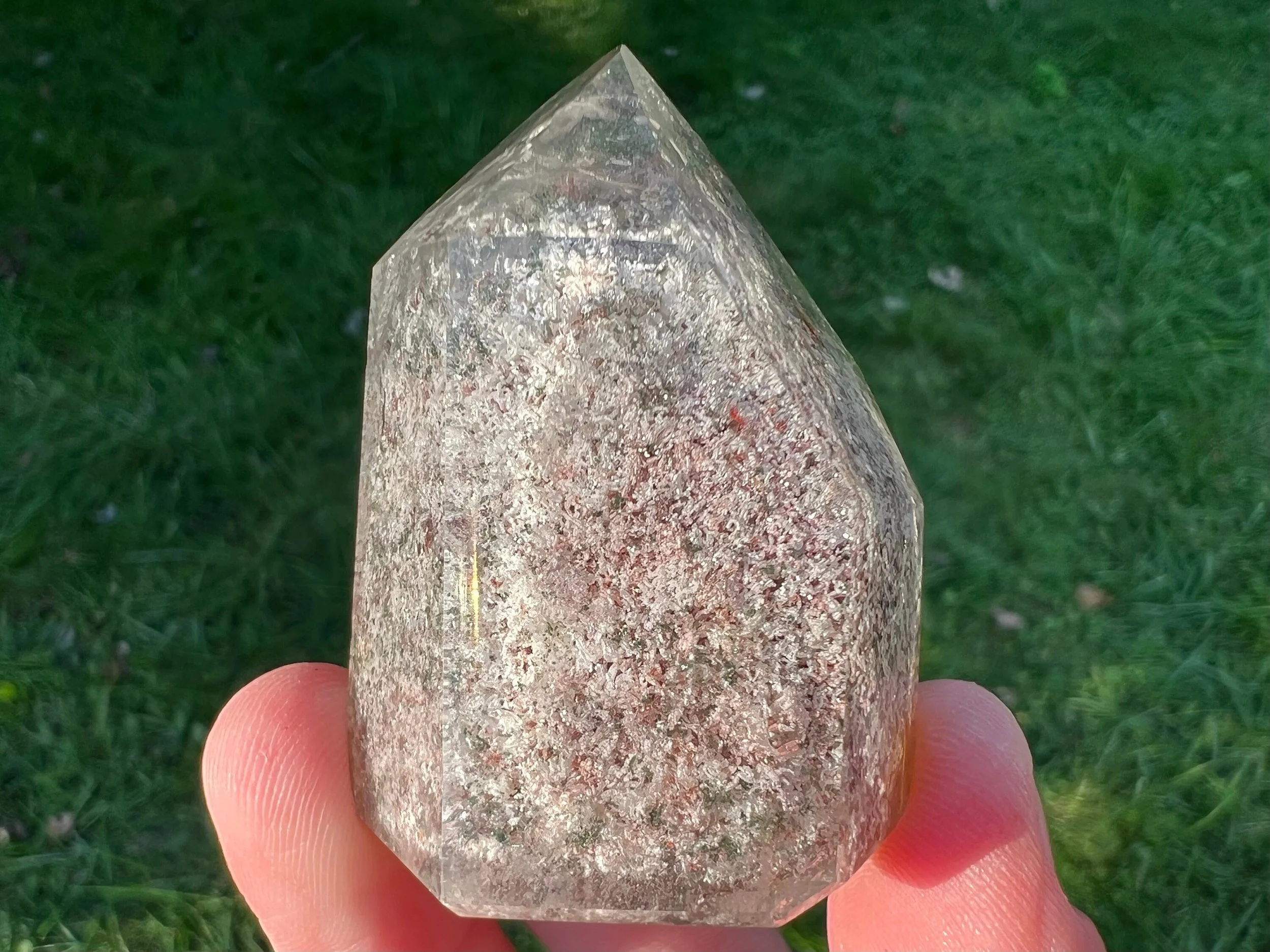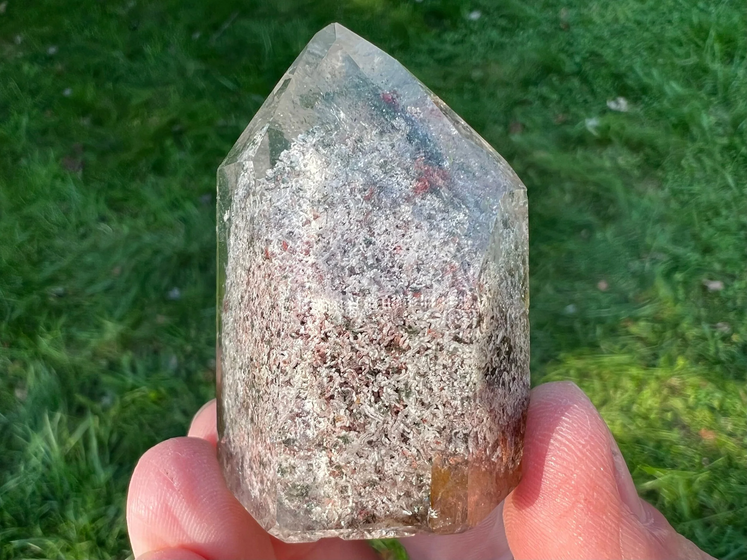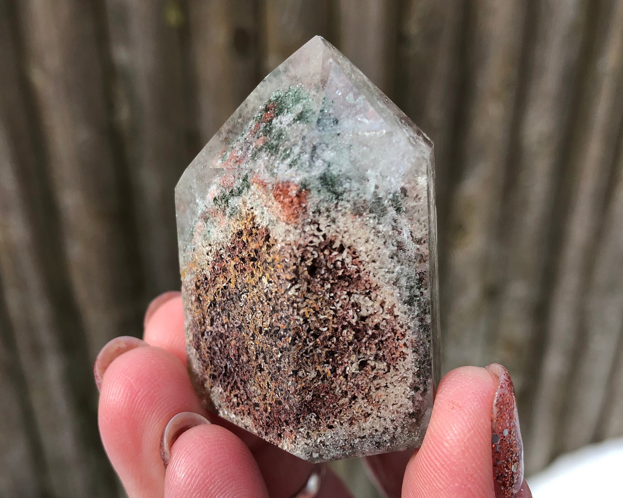 1.9" Small Polished Lodolite Quartz Point #16 Inclusion Crystal Tower, Purple Green Pink Scenic Quartz, Gemstone Decor, Gift for Her for Him