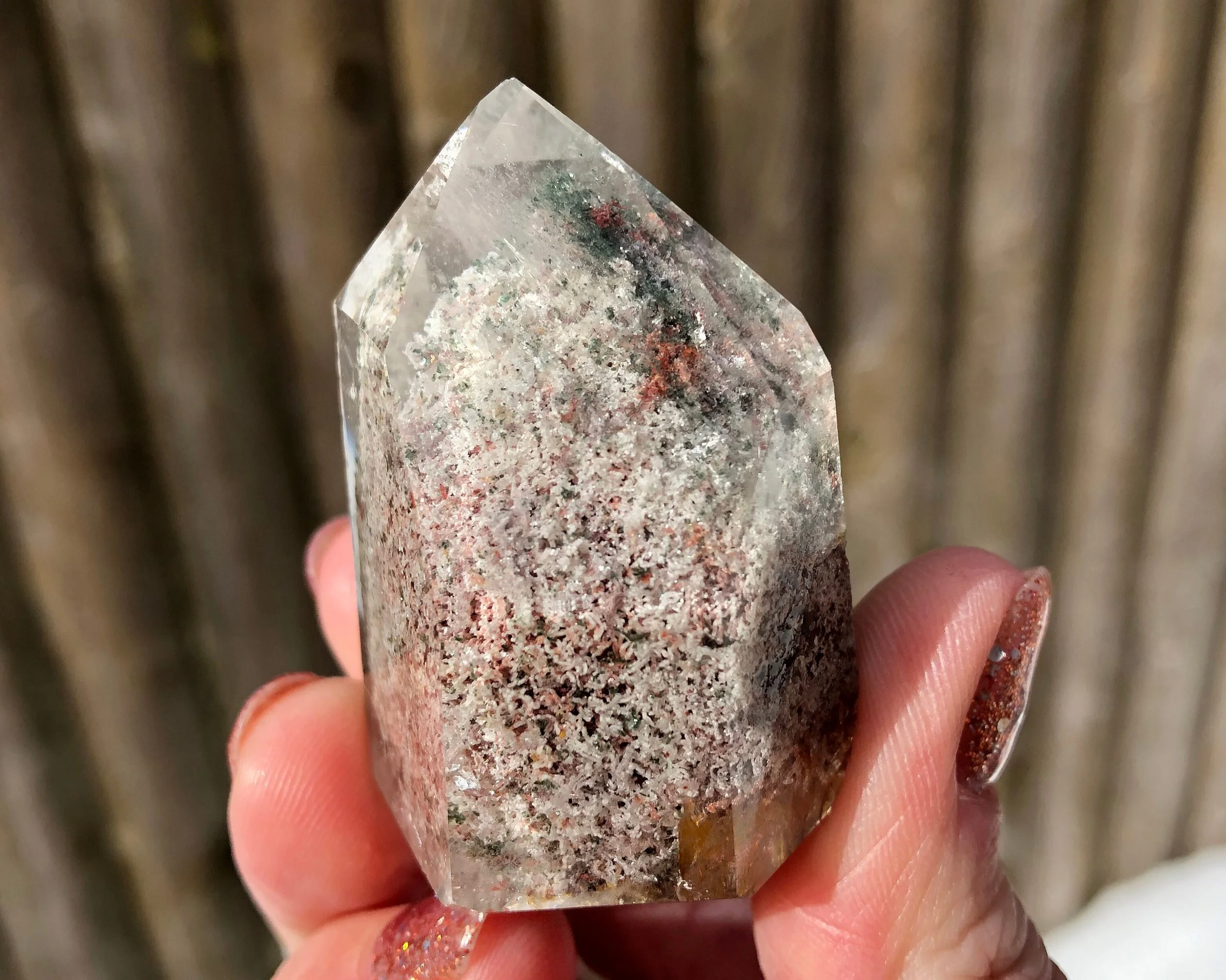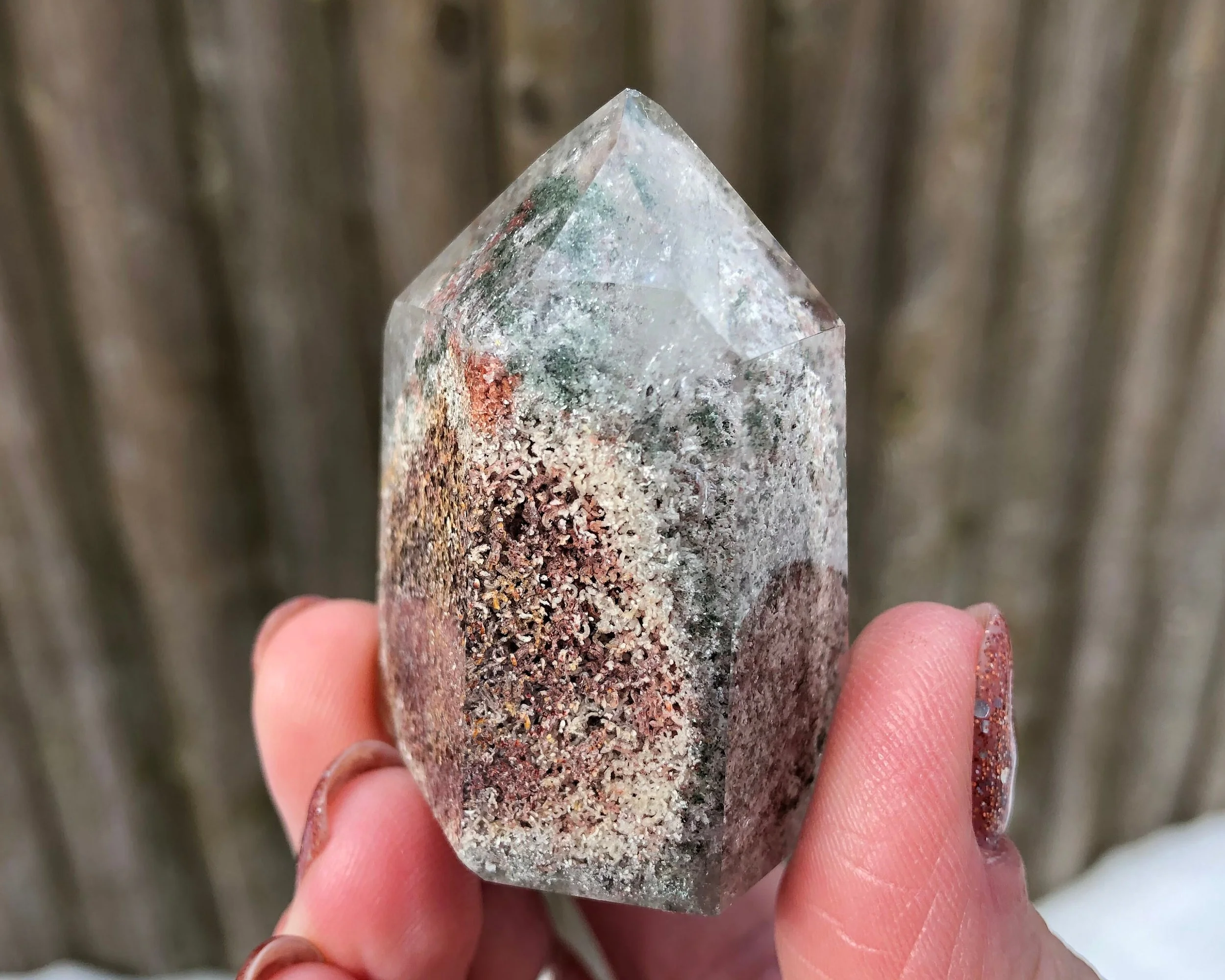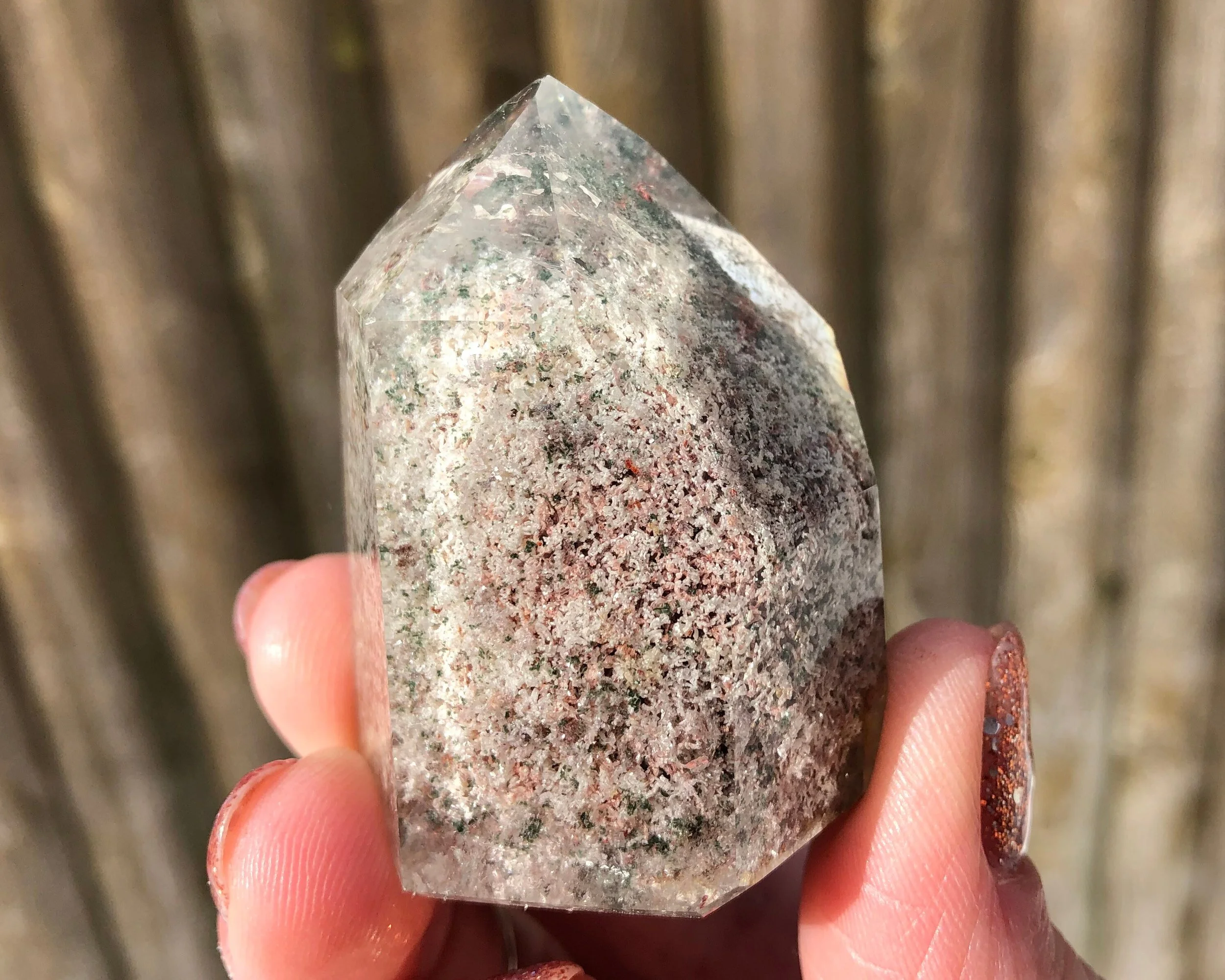 1.9" Small Polished Lodolite Quartz Point #16 Inclusion Crystal Tower, Purple Green Pink Scenic Quartz, Gemstone Decor, Gift for Her for Him