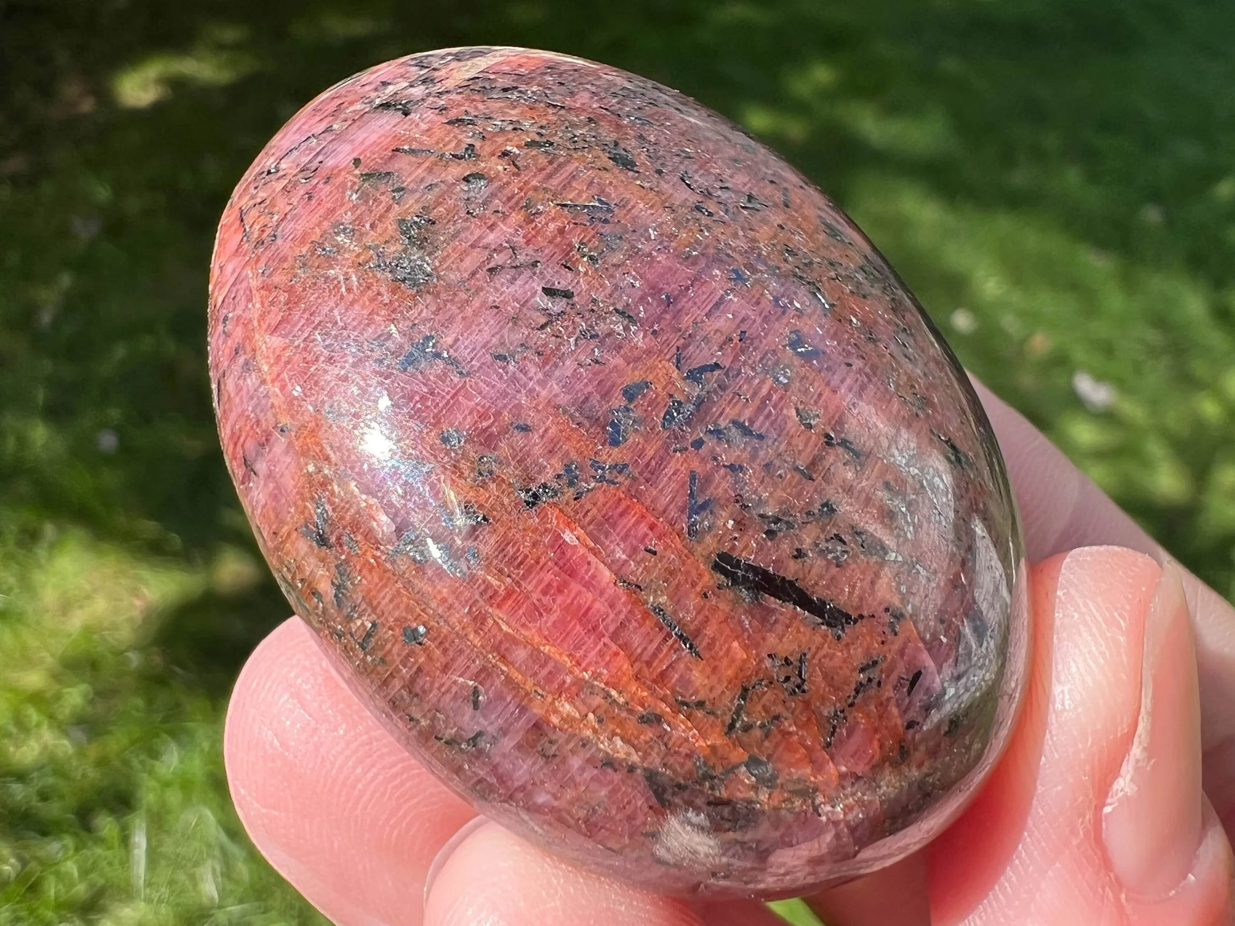 This is a gorgeous Star Ruby cut and polished into an oval crystal palm stone. It is chatoyant with shimmer that moves through it with the light (aka asterism) A nice smooth little stone perfectly sized for your pocket or bag. Ruby is UV reactive, fluorescent pink.