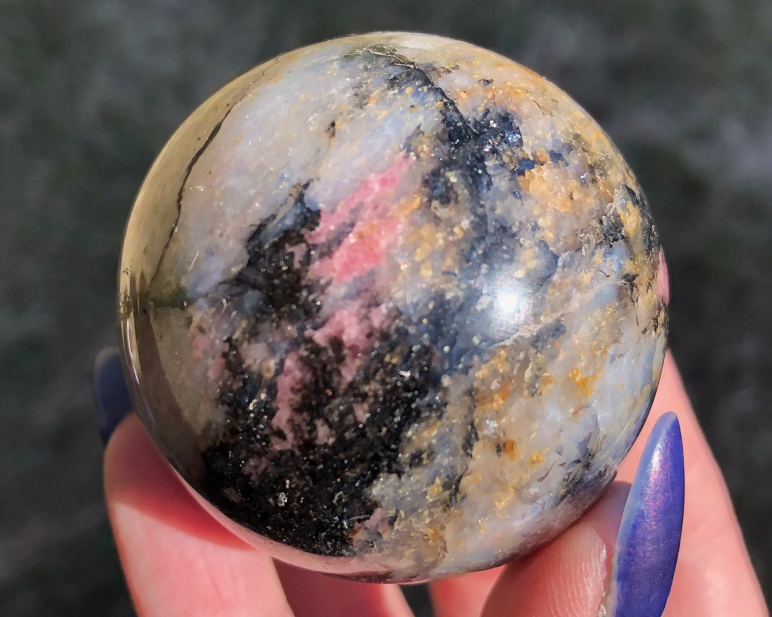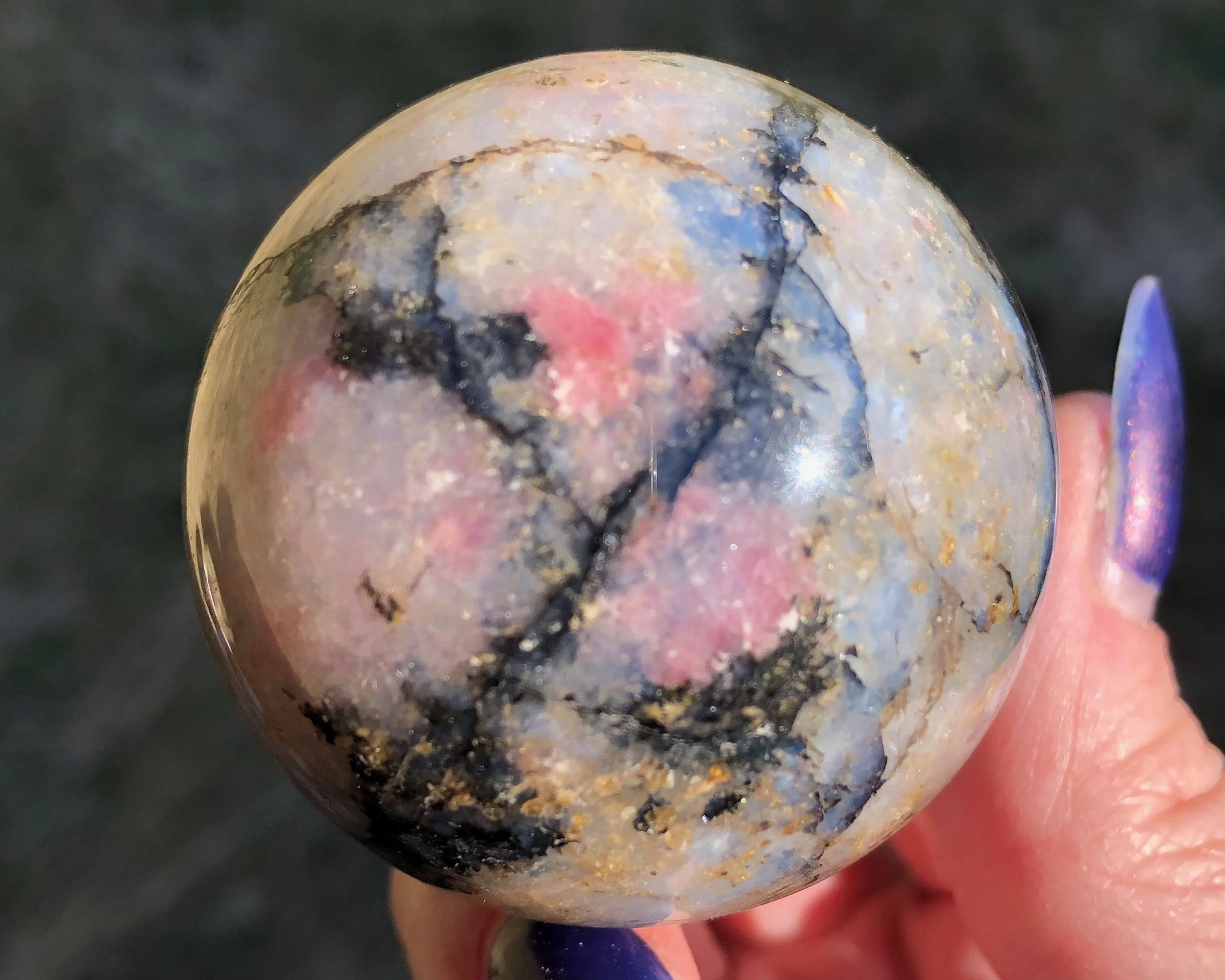 2" Gemmy Cherry Blossom Rhodonite Sphere with Blue Flash #5 Crystal Ball, Gemstone Home Decor, Witchy Gift for Her, Pink Rhodonite in Quartz