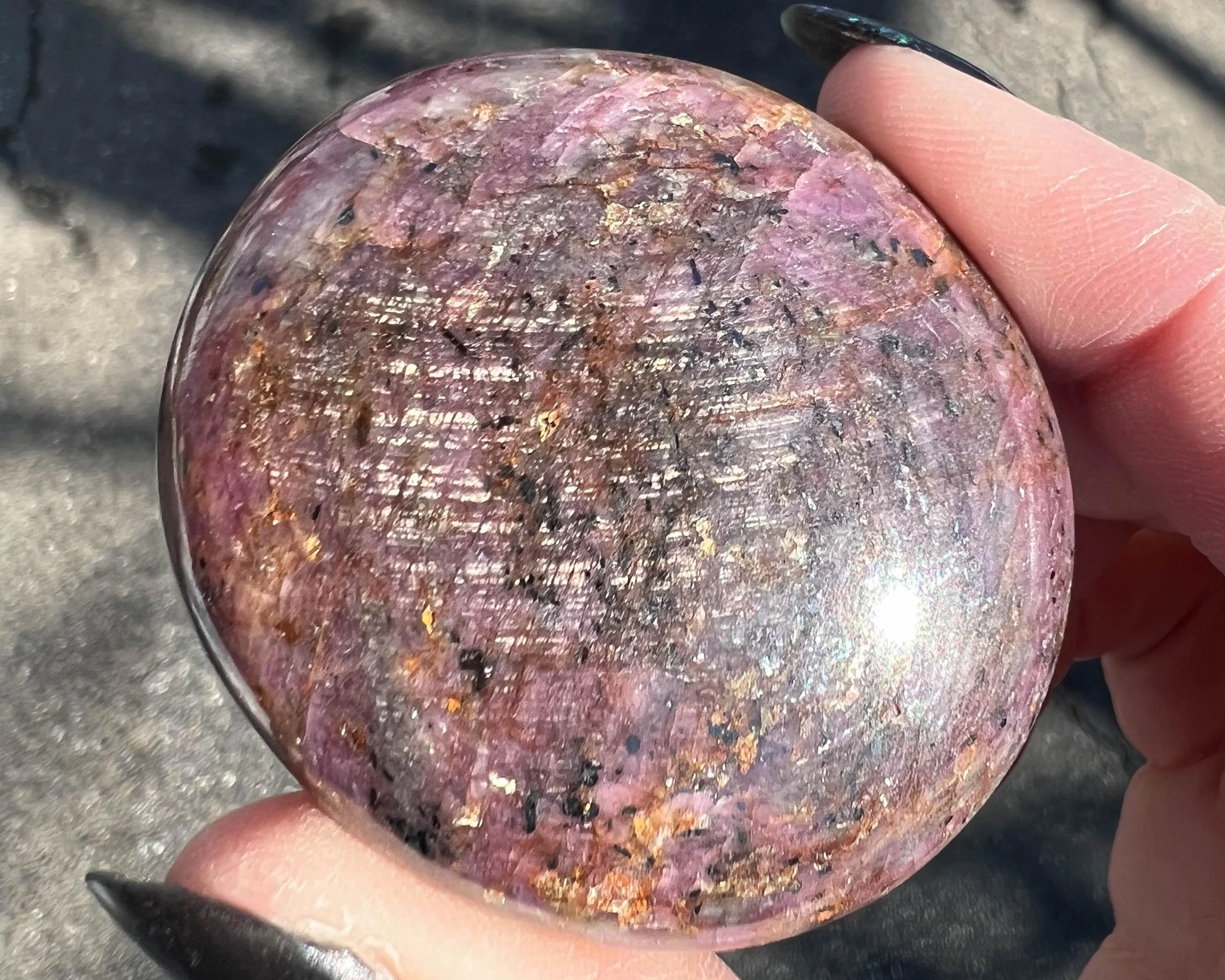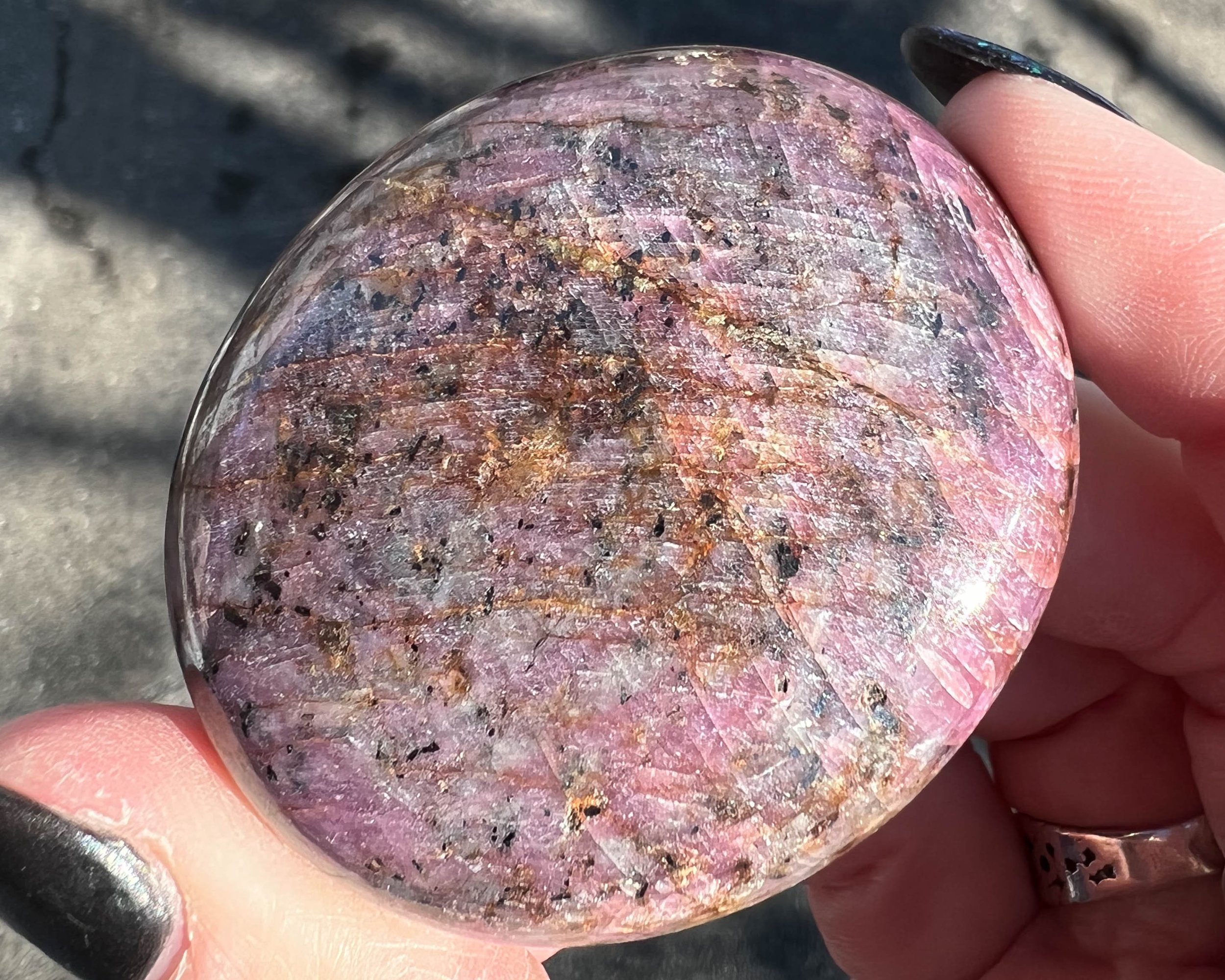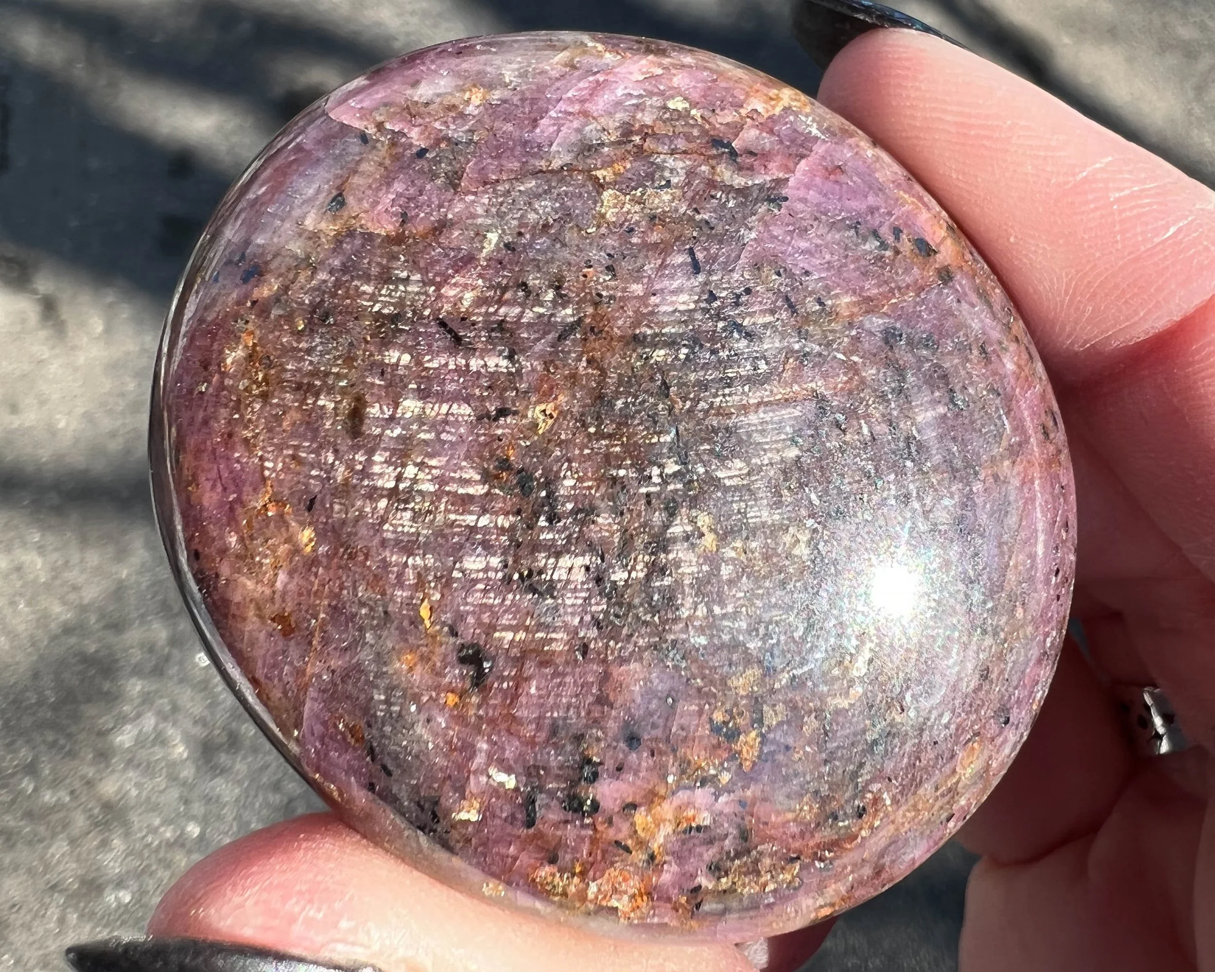 This is a gorgeous star Ruby carved and polished into a palm stone. It is chatoyant with the hexagonal pattern shining in it, and star lines that move through it with the light. A large smooth stone great for holding in the palm.