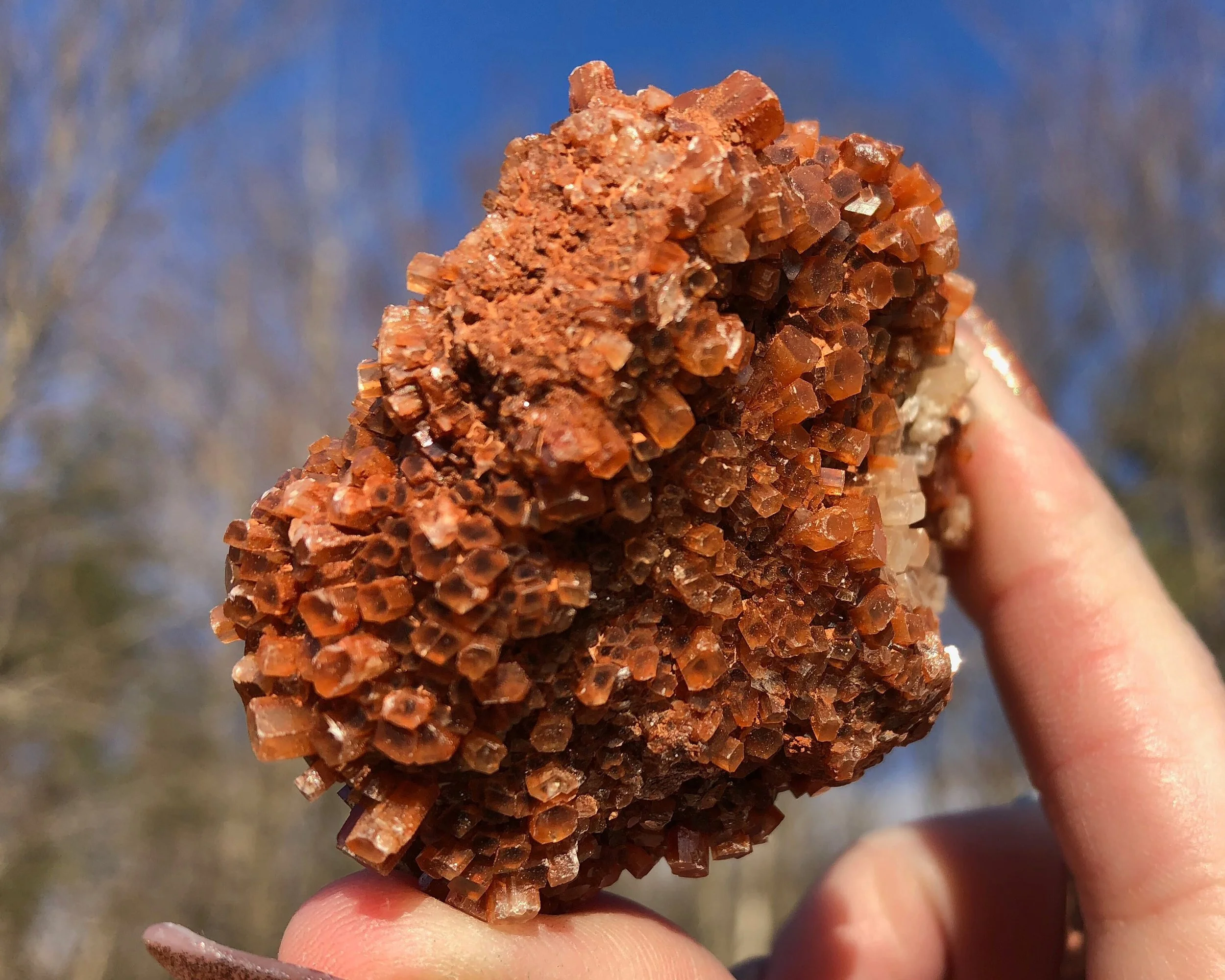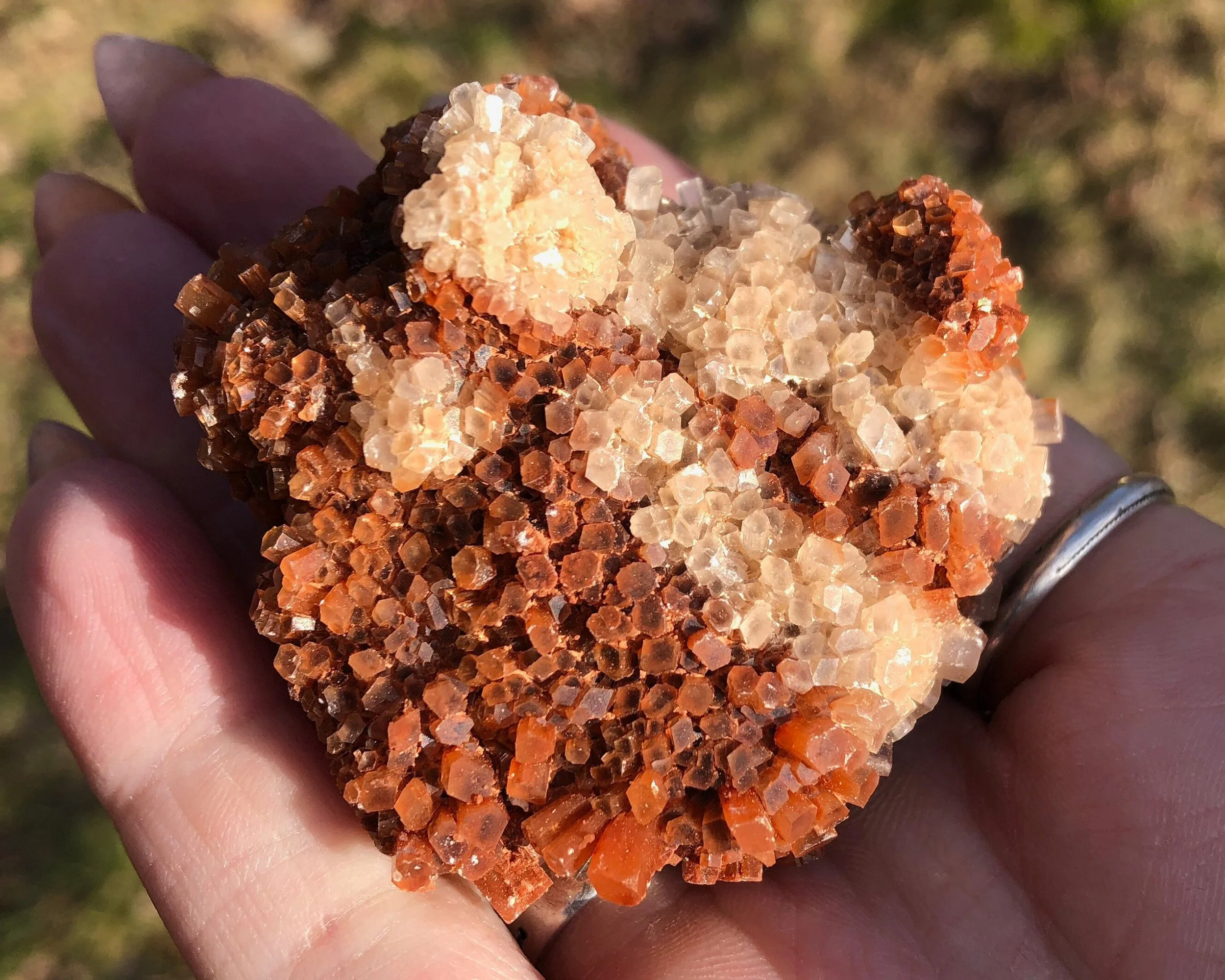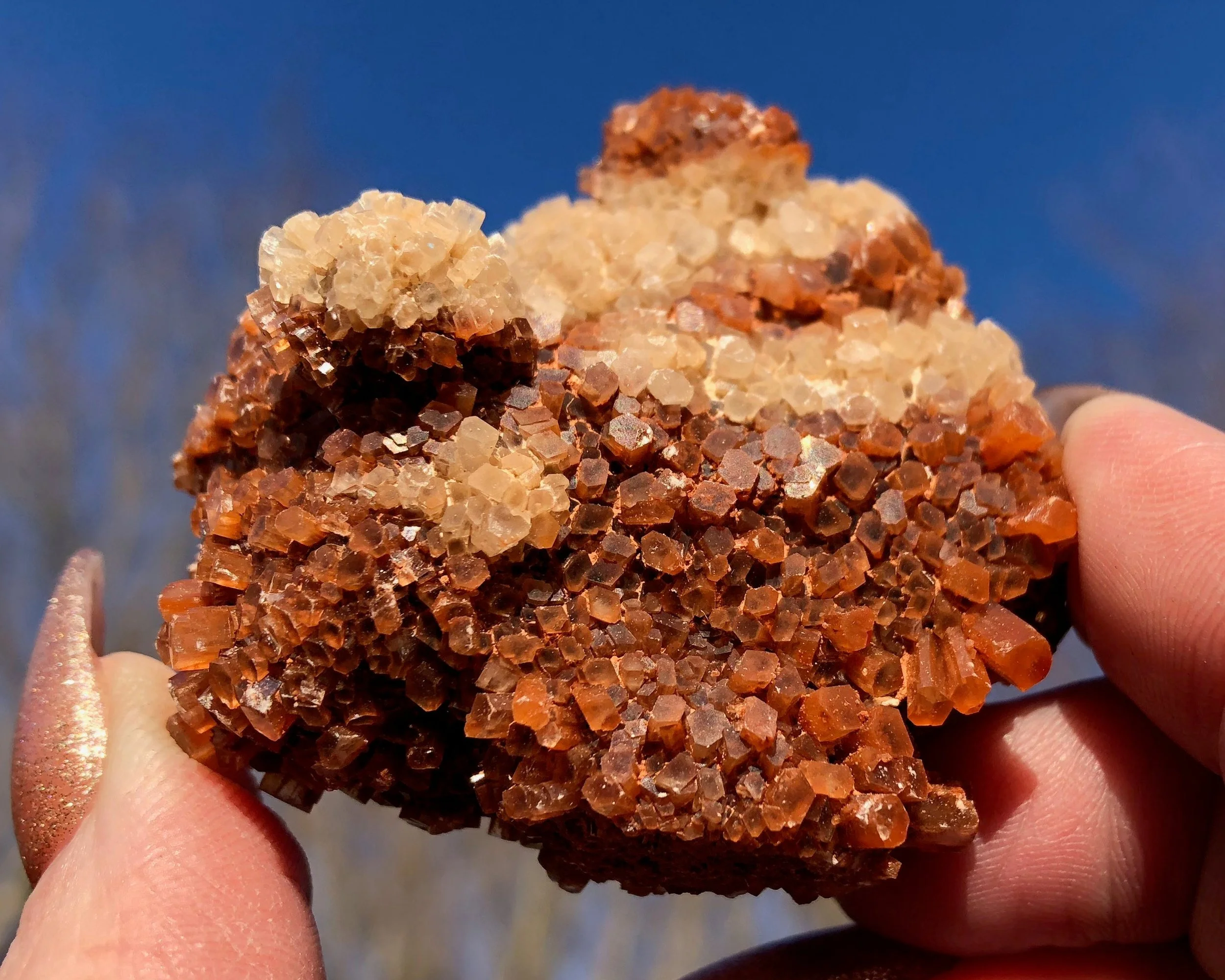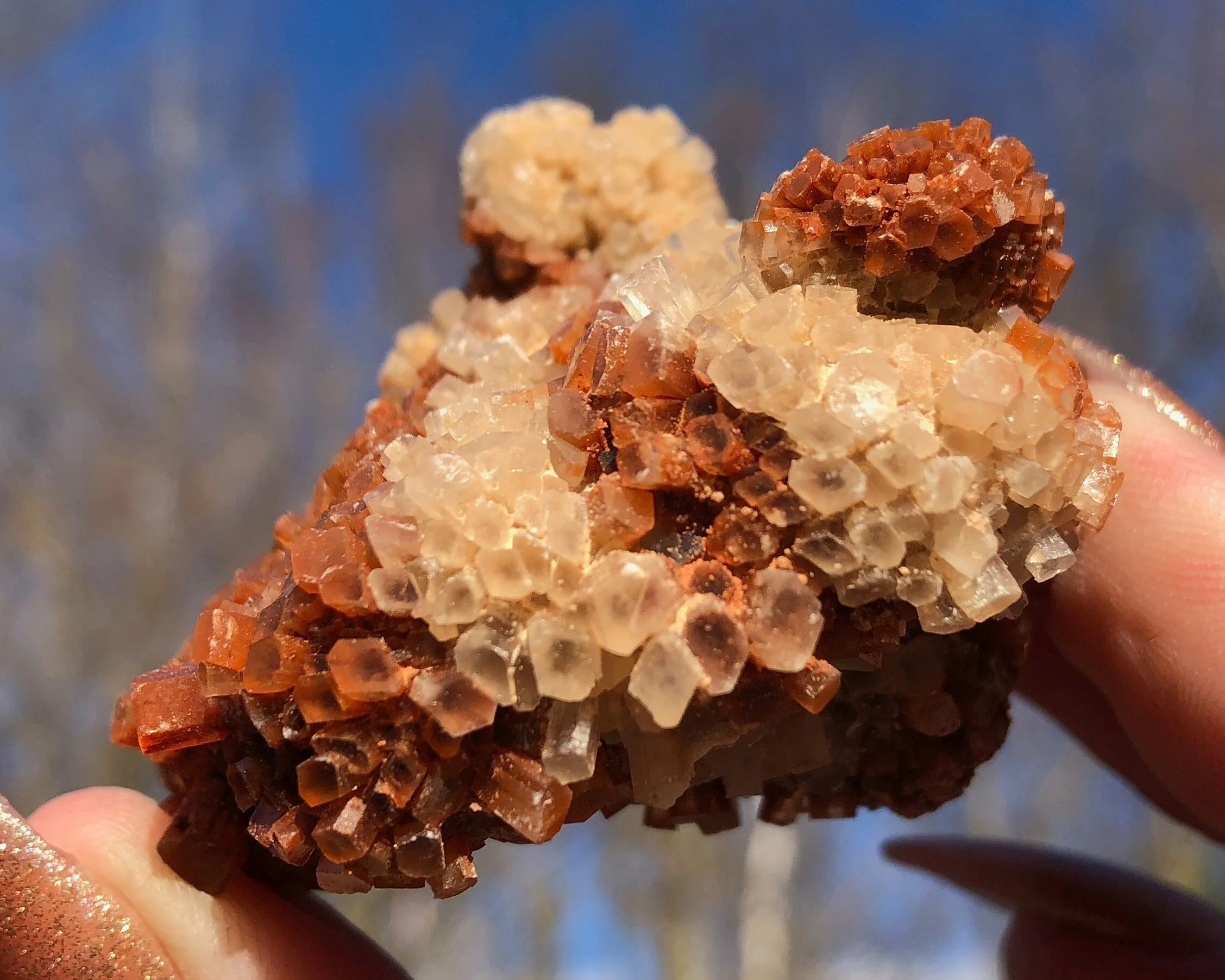 This is a beautiful, bicolor Aragonite druzy cluster from Morocco. It has nice luster, a warm reddish orange coloring mixed with clear/white crystals and the smaller crystals make it look extra sparkly! This one is in really great shape and makes for an excellent piece for your collection or display!