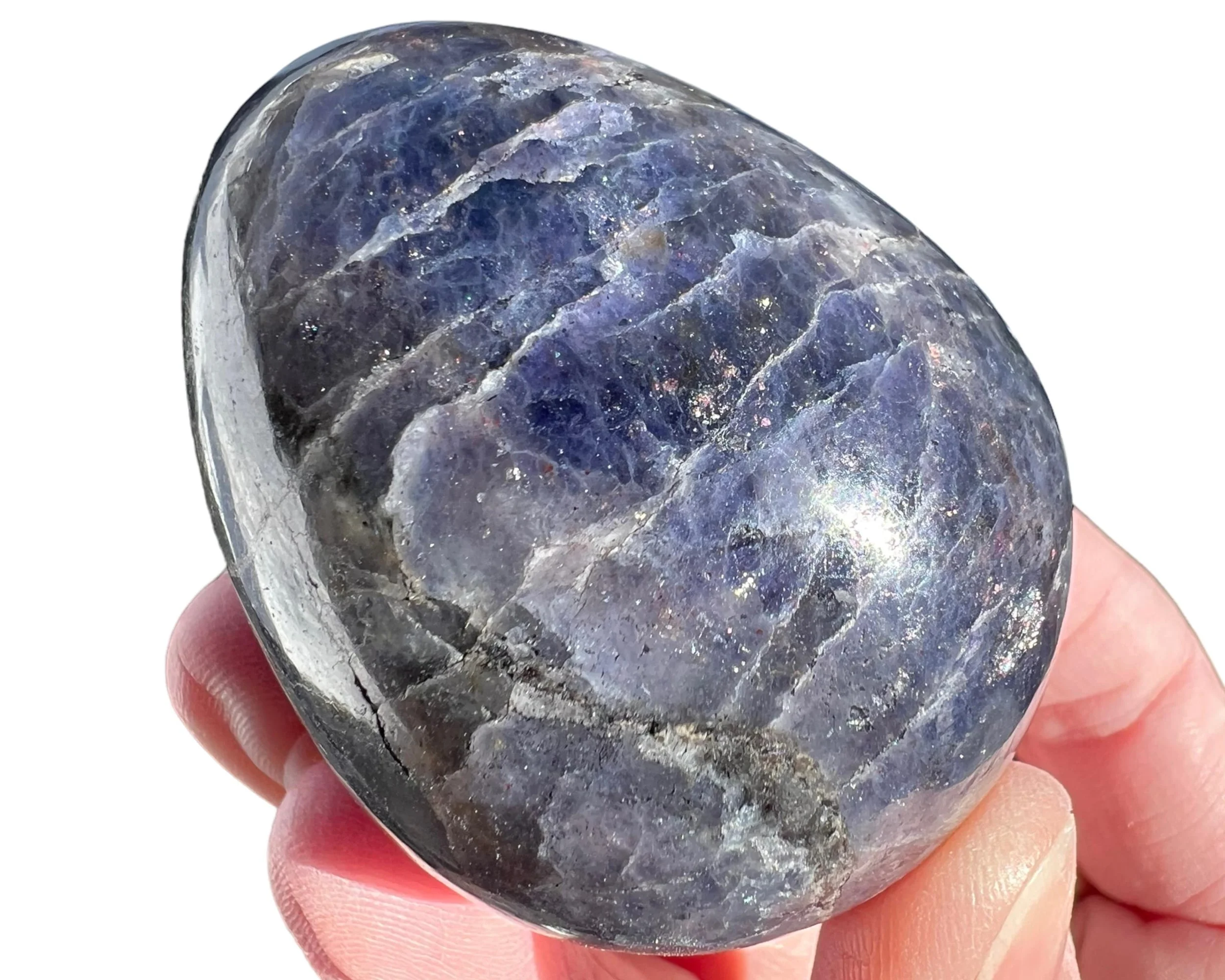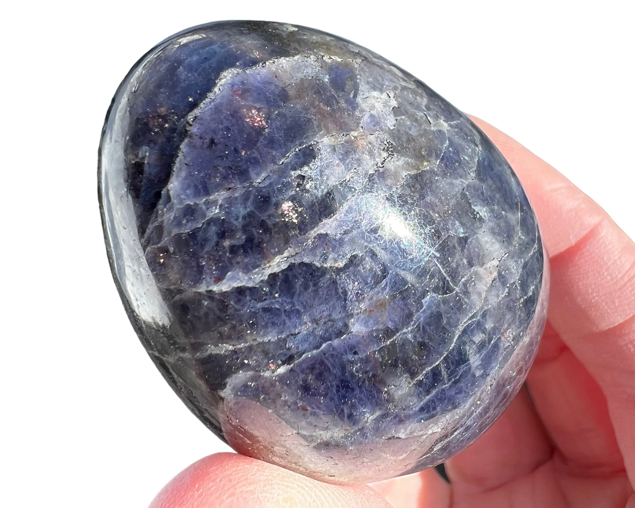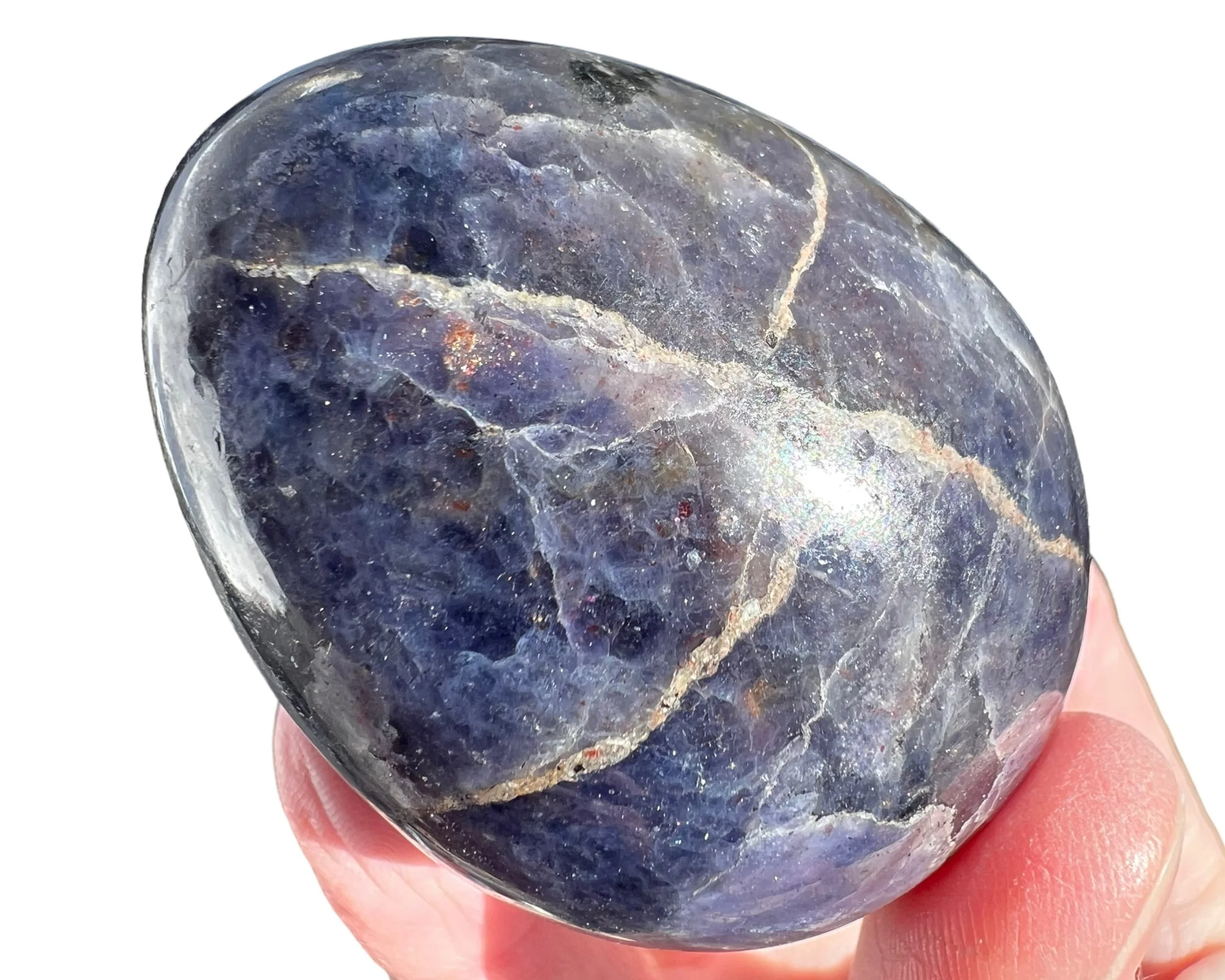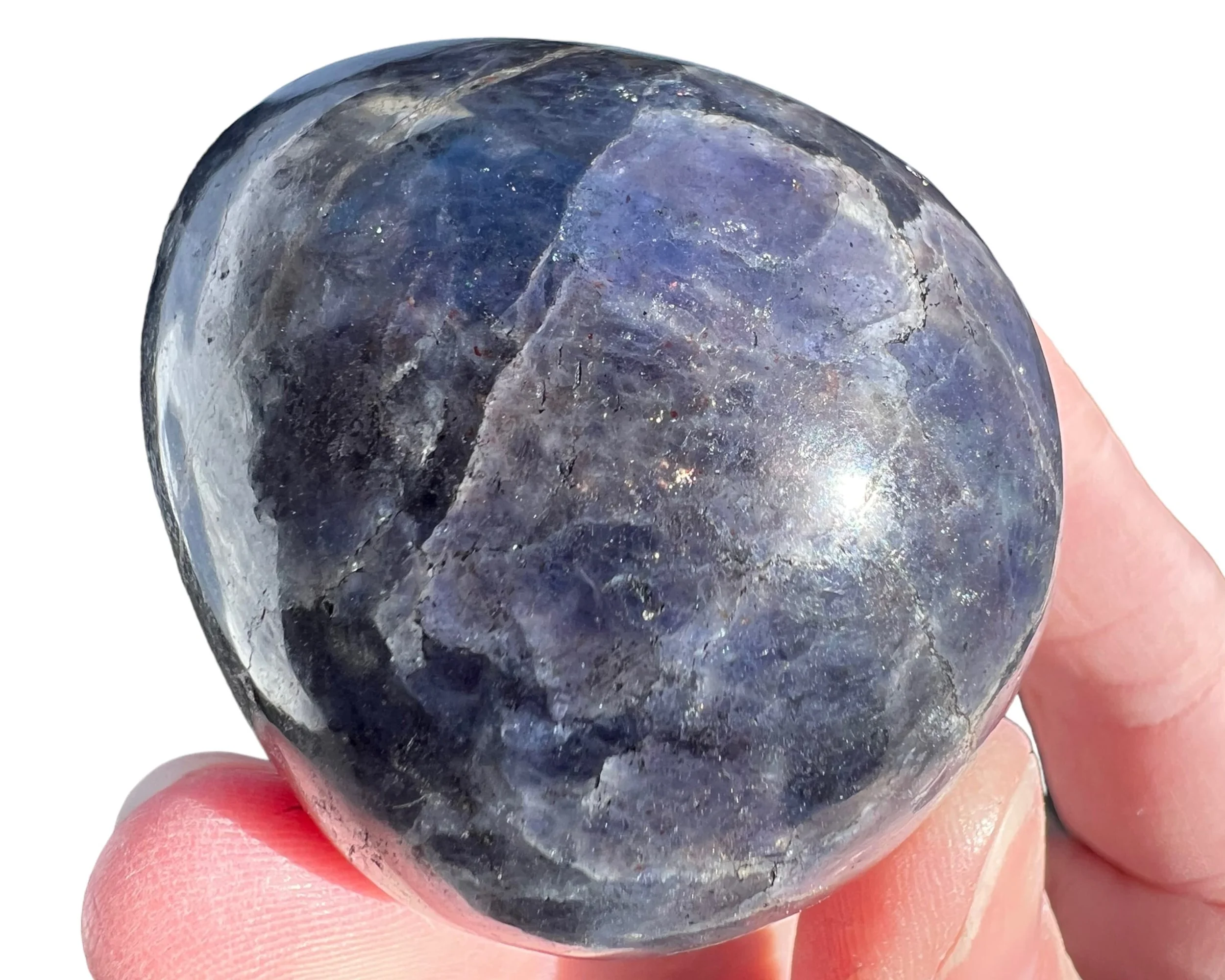 This is a lovely natural Bloodshot Iolite, or Sunstone Iolite - Iolite with Confetti Sunstone in it, including the specks of shiny Hematite - cut and polished into an egg shape. This one looks just like a life size chicken egg shape and size. Cute Easter gift or home decor.