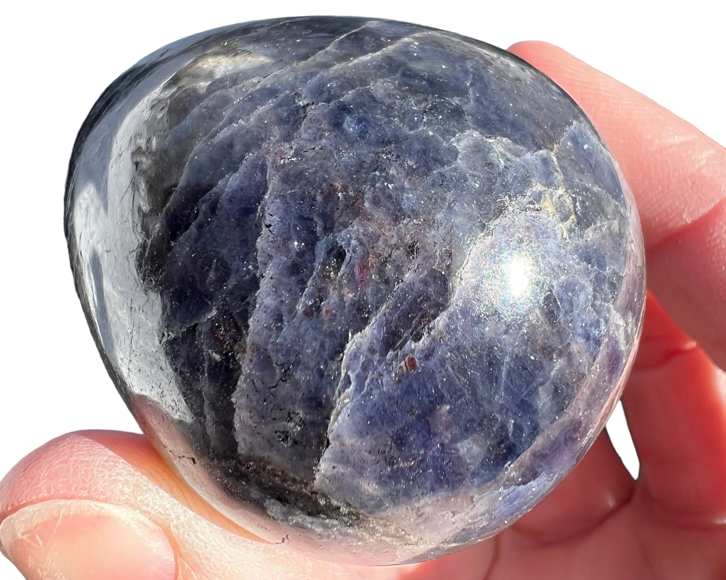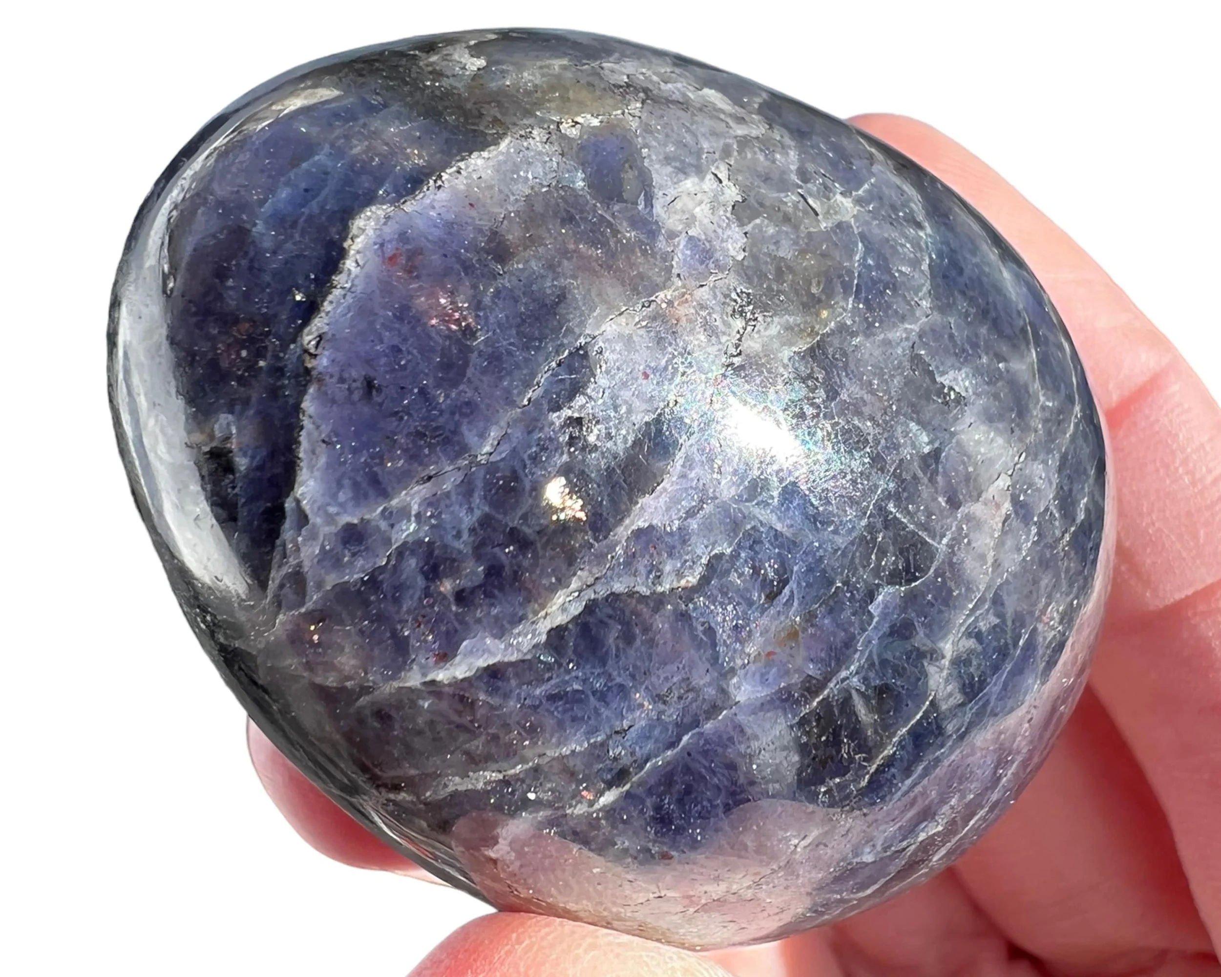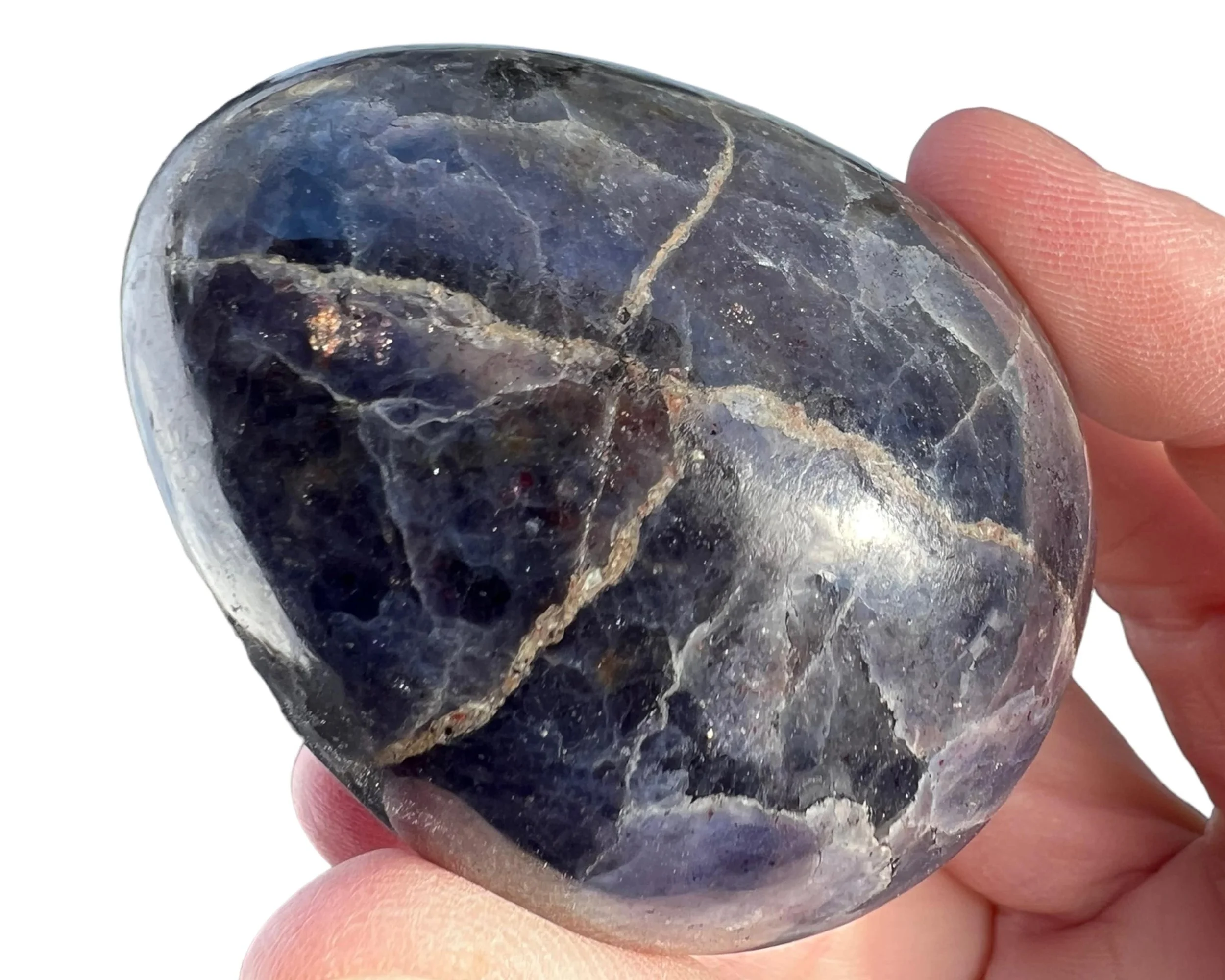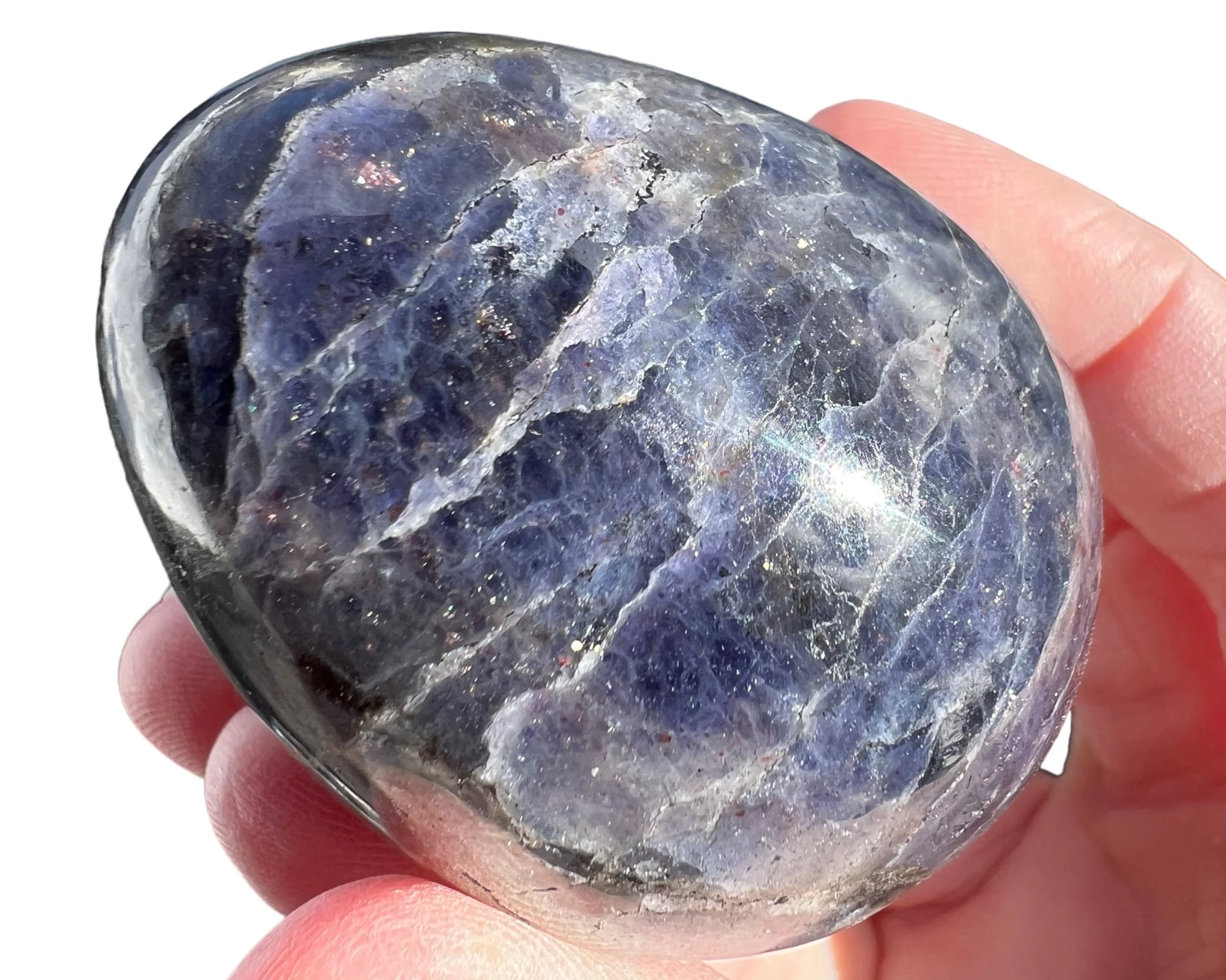 This is a lovely natural Bloodshot Iolite, or Sunstone Iolite - Iolite with Confetti Sunstone in it, including the specks of shiny Hematite - cut and polished into an egg shape. This one looks just like a life size chicken egg shape and size. Cute Easter gift or home decor.