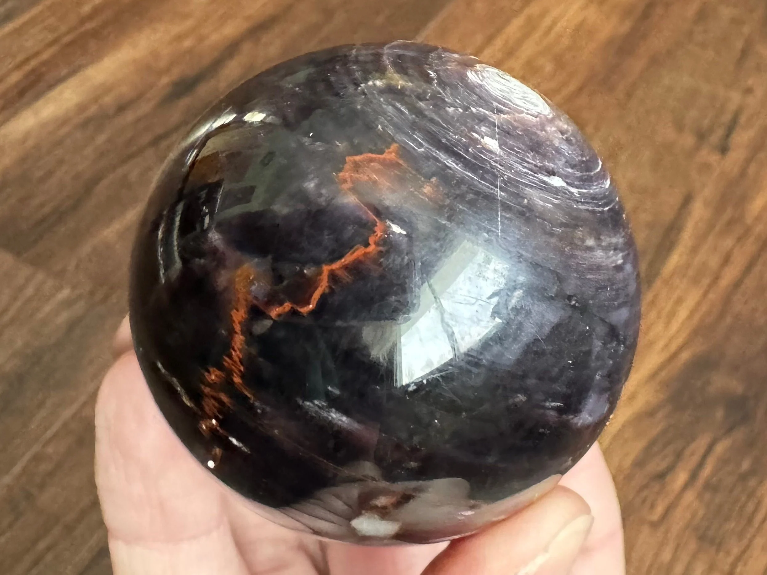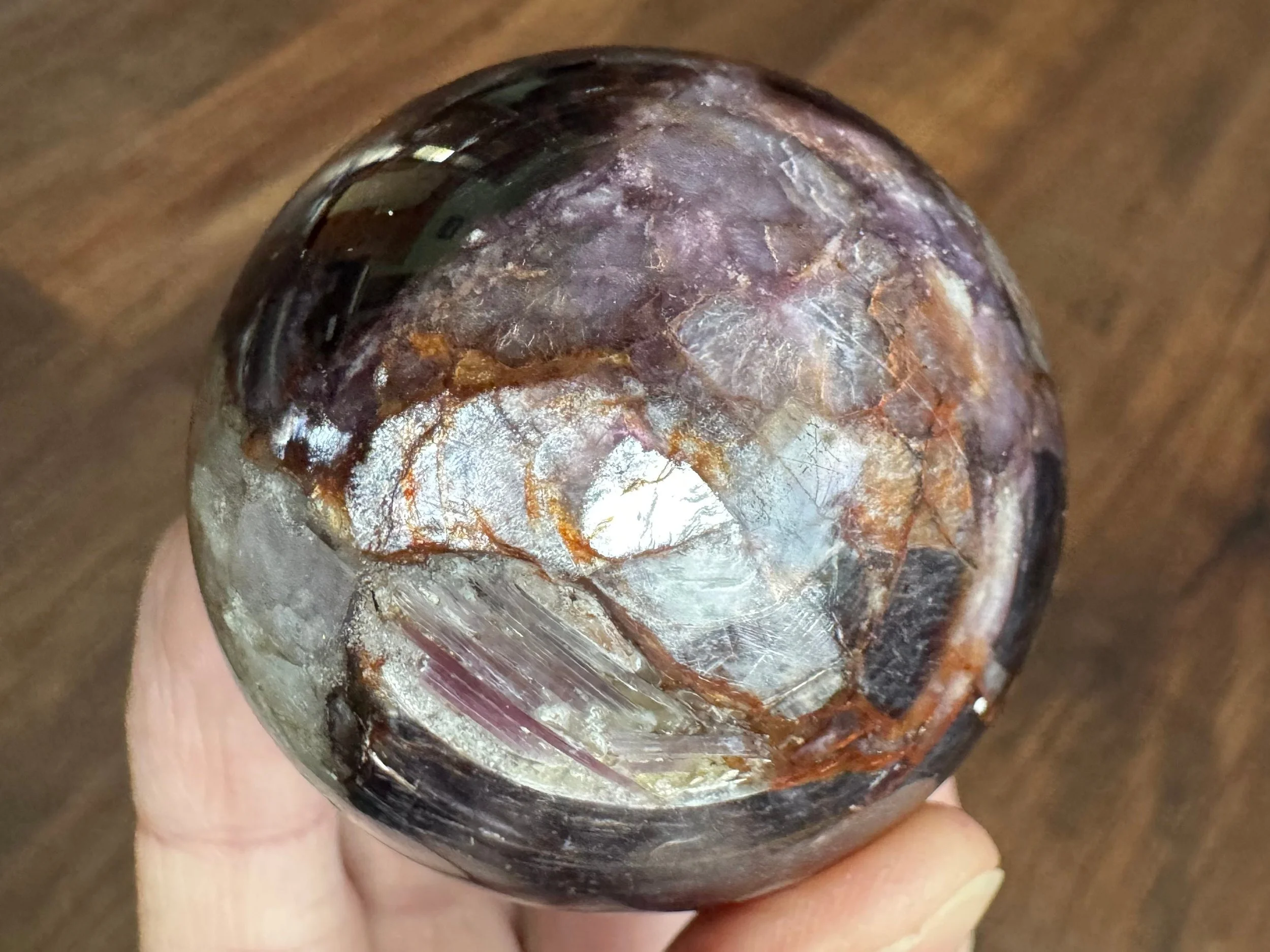 This is a gemmy Lepidolite sphere. Lepidolite is a purple to pink Mica. This sphere also has some Quartz. It is very reflective and shiny, with dark purple color that is lighter looking from the sides that it reflects more light. All around very pretty crystal ball with lots going on.