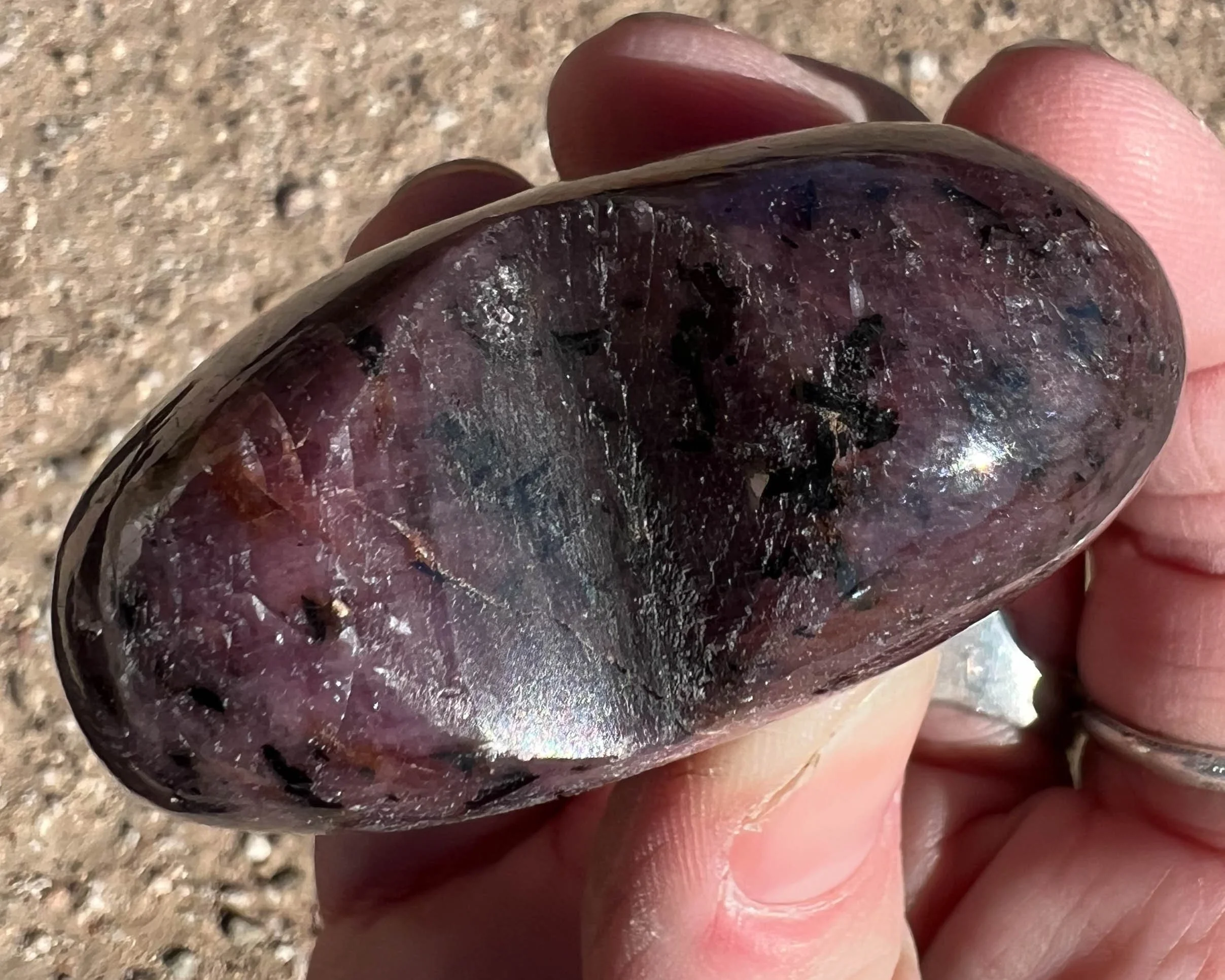 This is a Star Ruby with beautiful chatoyance on both sides and lovely star lines that move with the light. It has beautiful dark pink and red color, lots of light, nicely polished and is thick and sturdy.