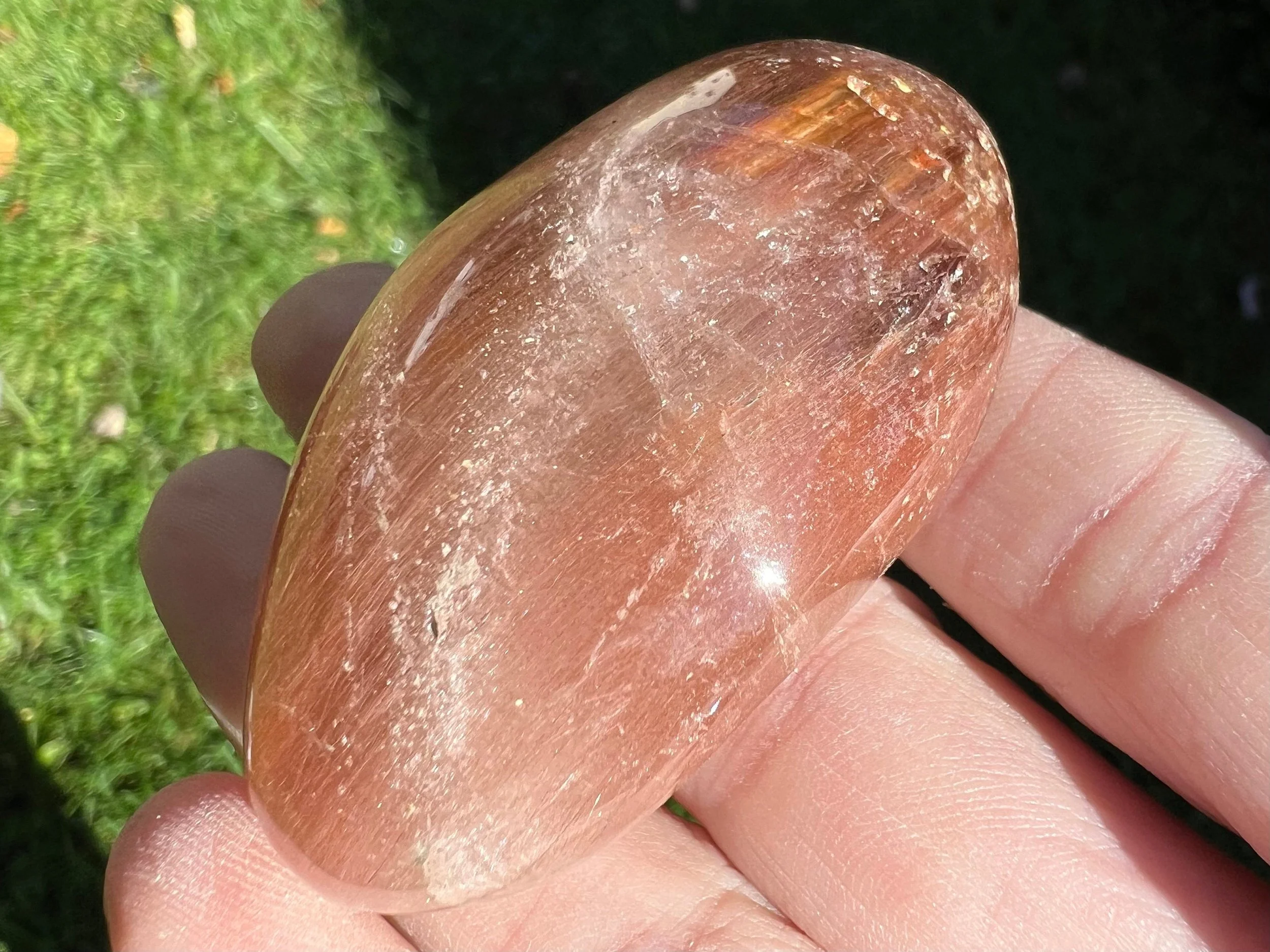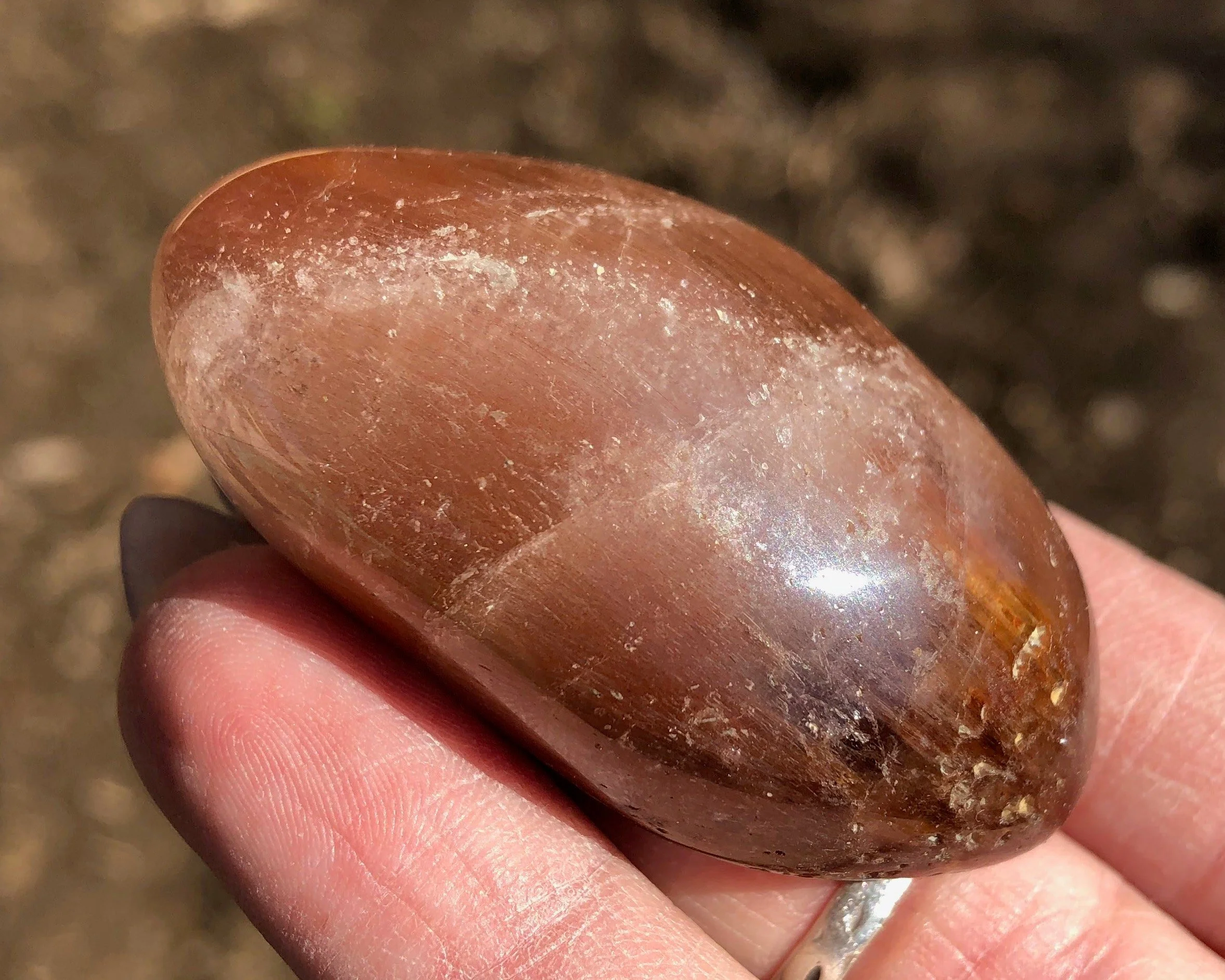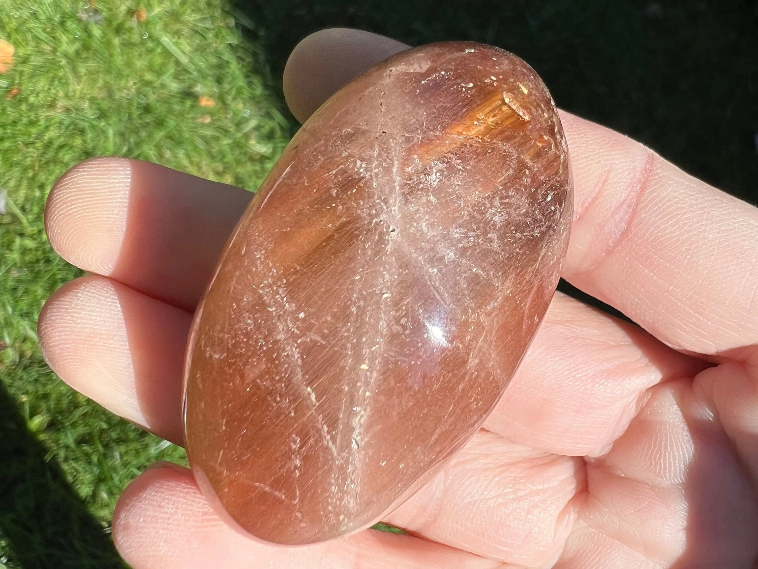 This is a beautiful polished round Amphibole Quartz lens from Brazil. It is full of thin, silky pink and red fibrous strands of amphibole minerals in polished clear Quartz crystal. It's so much better in person because a camera can't quite catch all the details. So pretty! :D