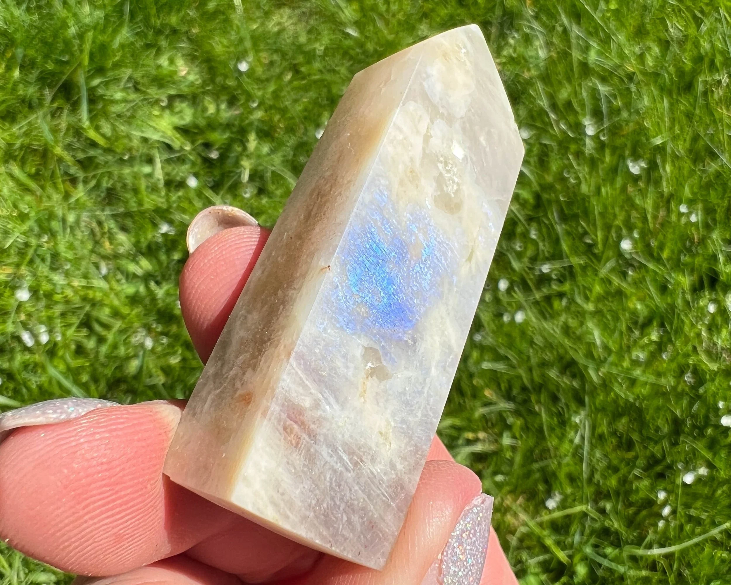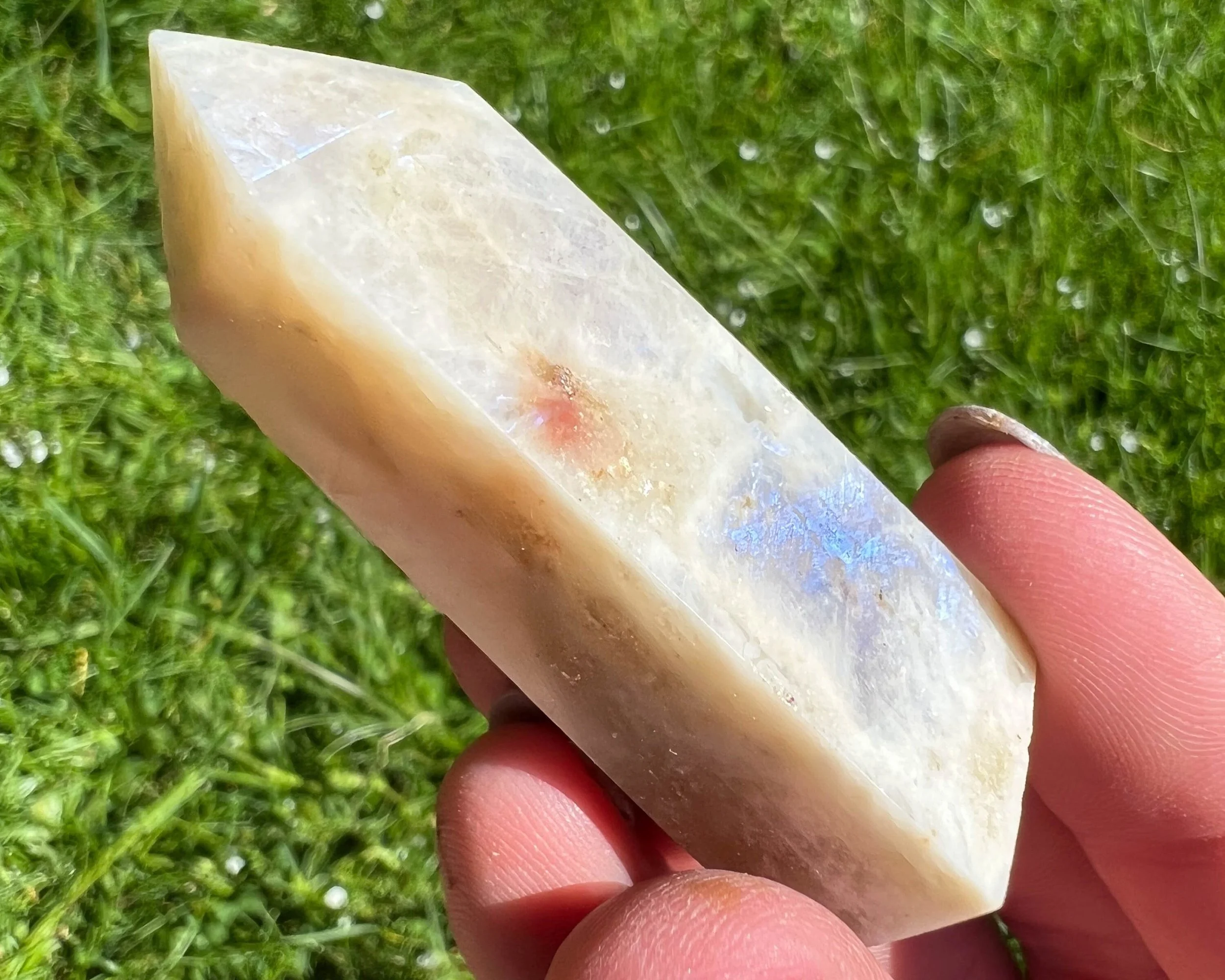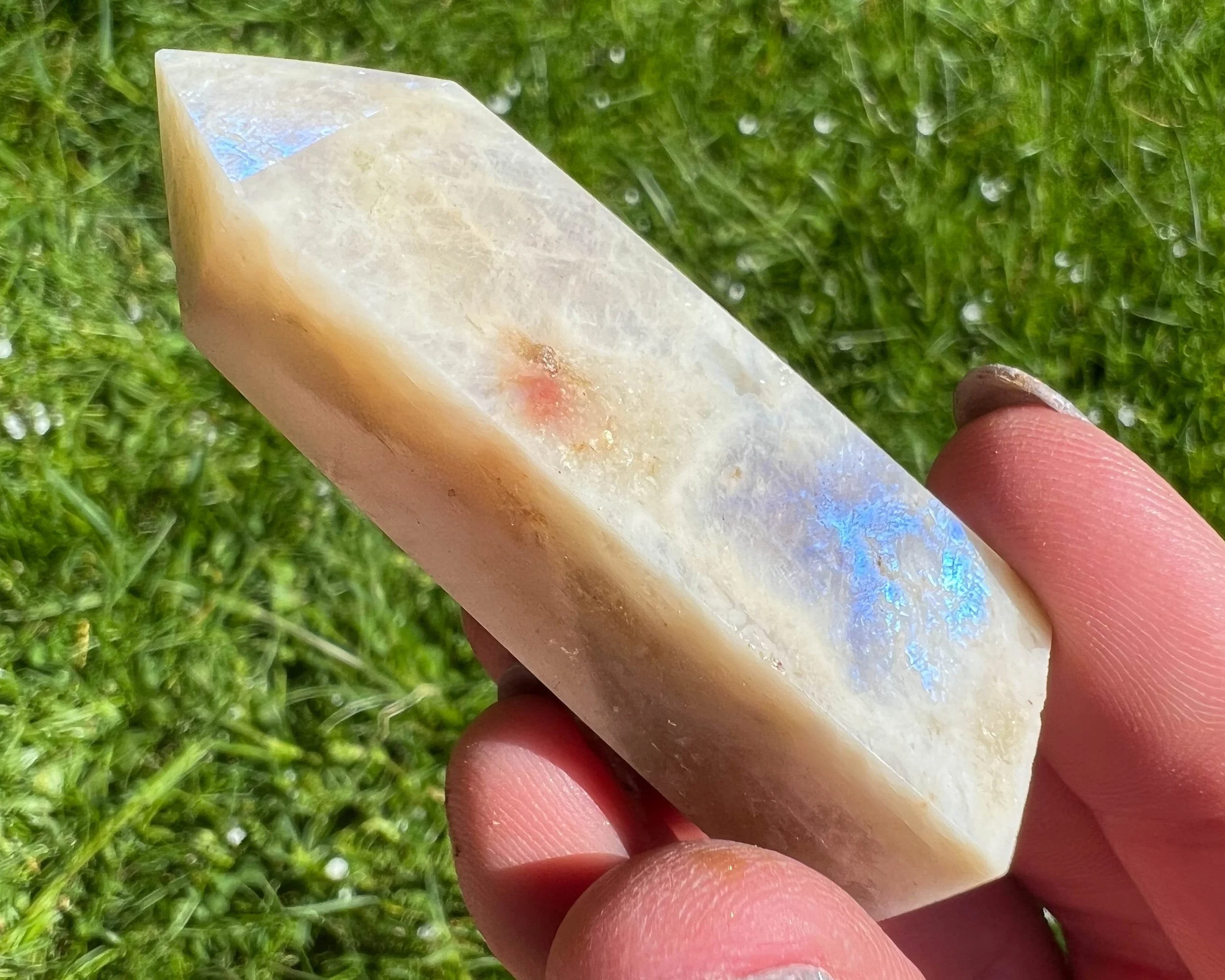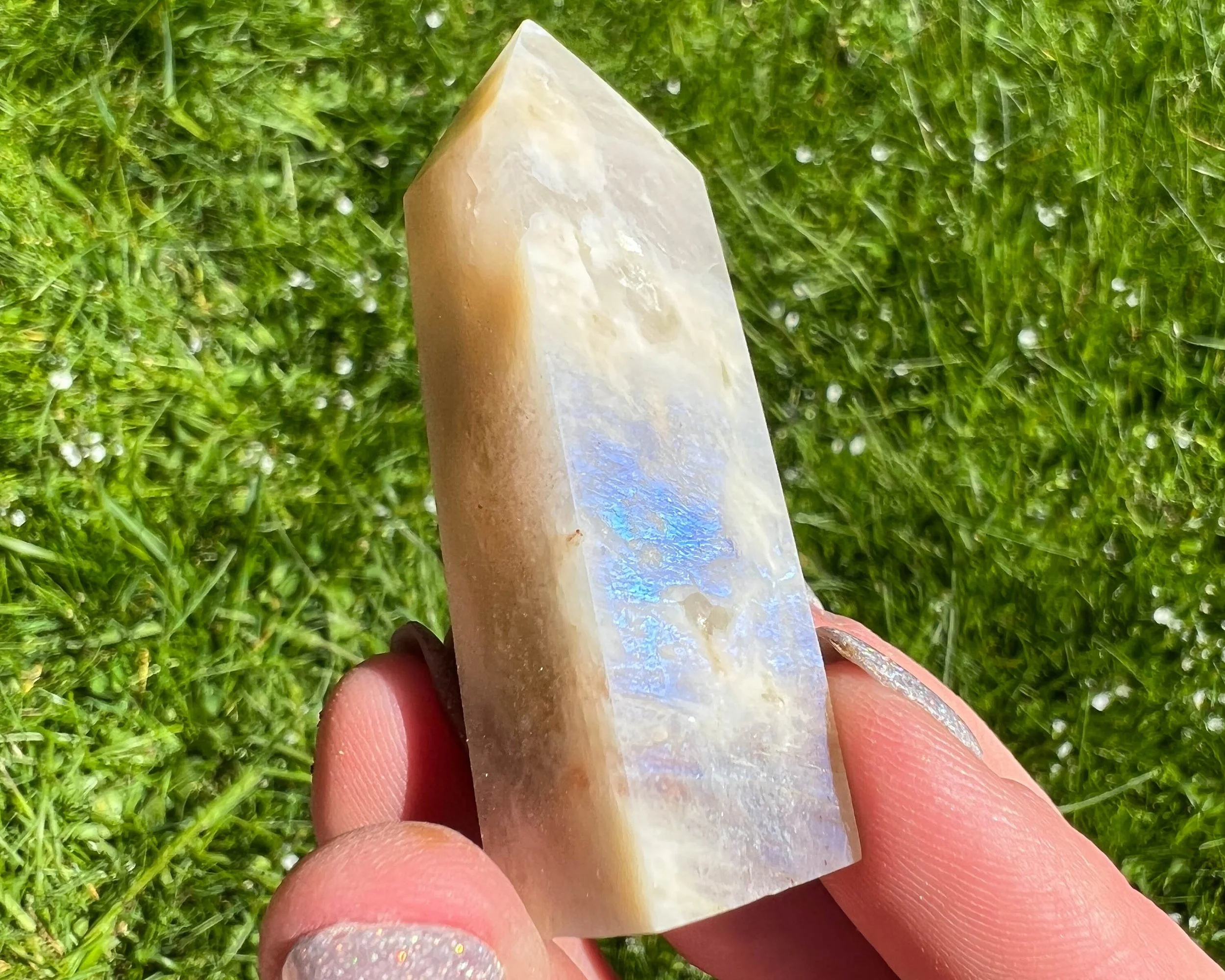 2.2" Belomorite Moonstone Sunstone Tower, Flashy Moonstone and Sunstone, Small Crystal Points, Blue Flash Confetti Sunstone, #2