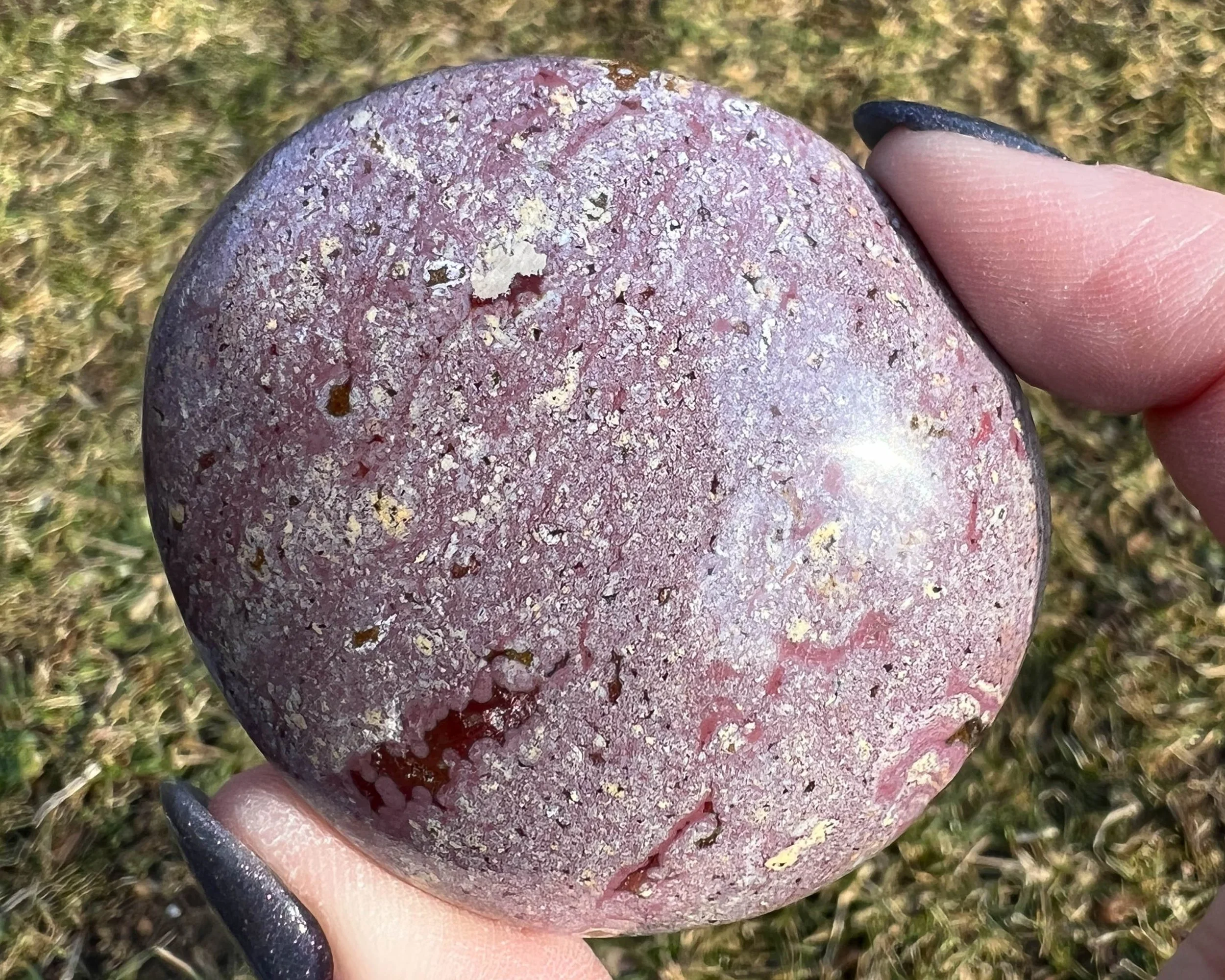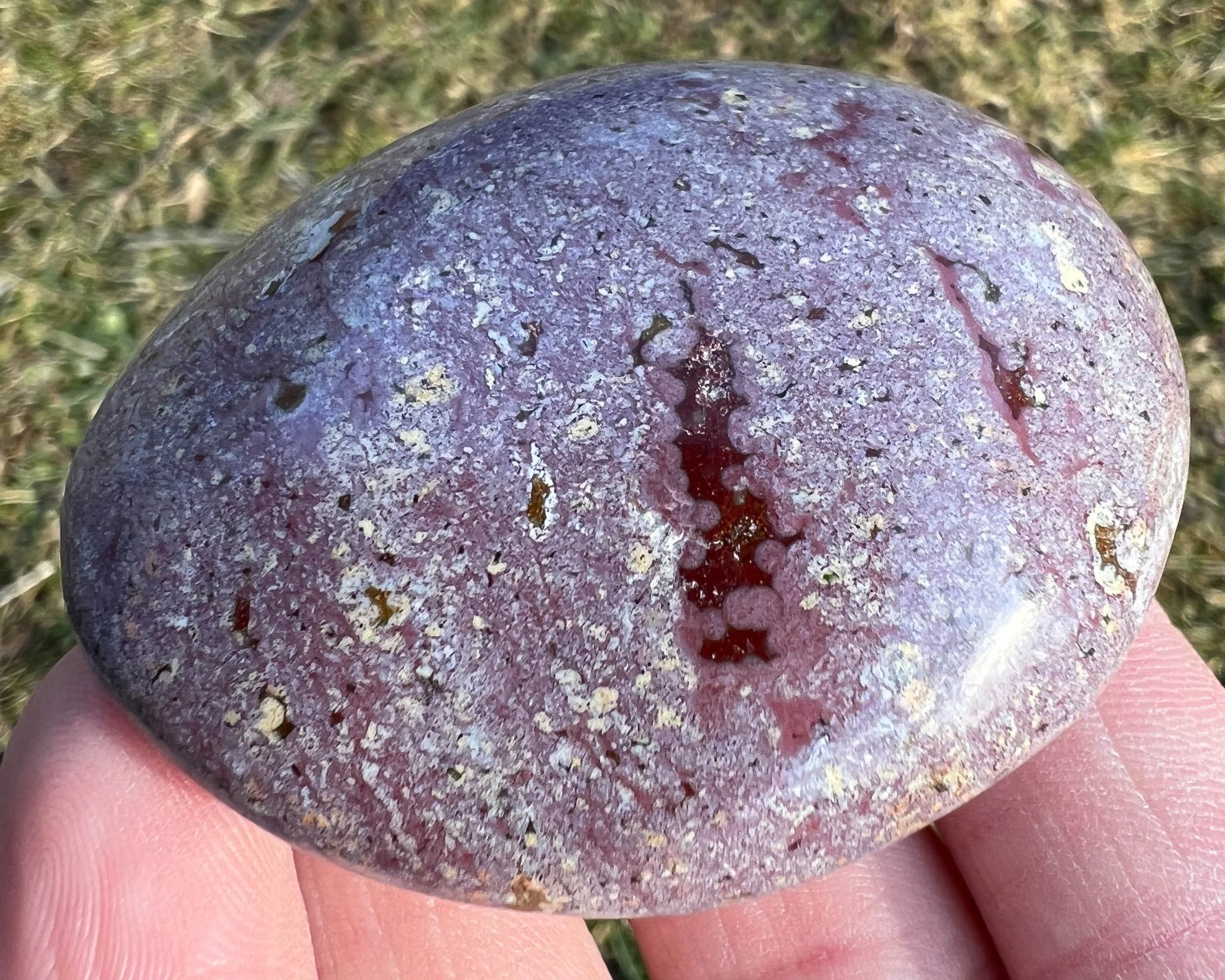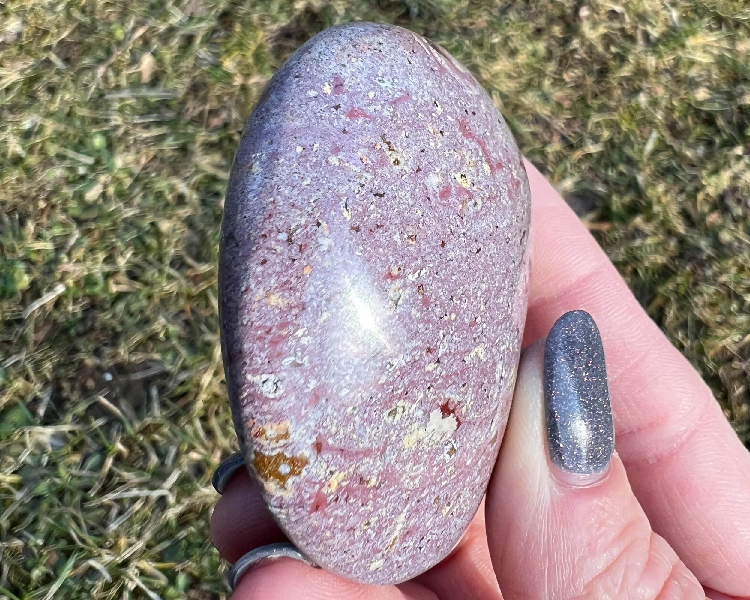 This is a wonderful piece of orbicular Ocean Jasper with pretty purple and pink and reds. Beautiful coloring which is now rare in Ocean Jasper. It is polished into a smooth palm stone.