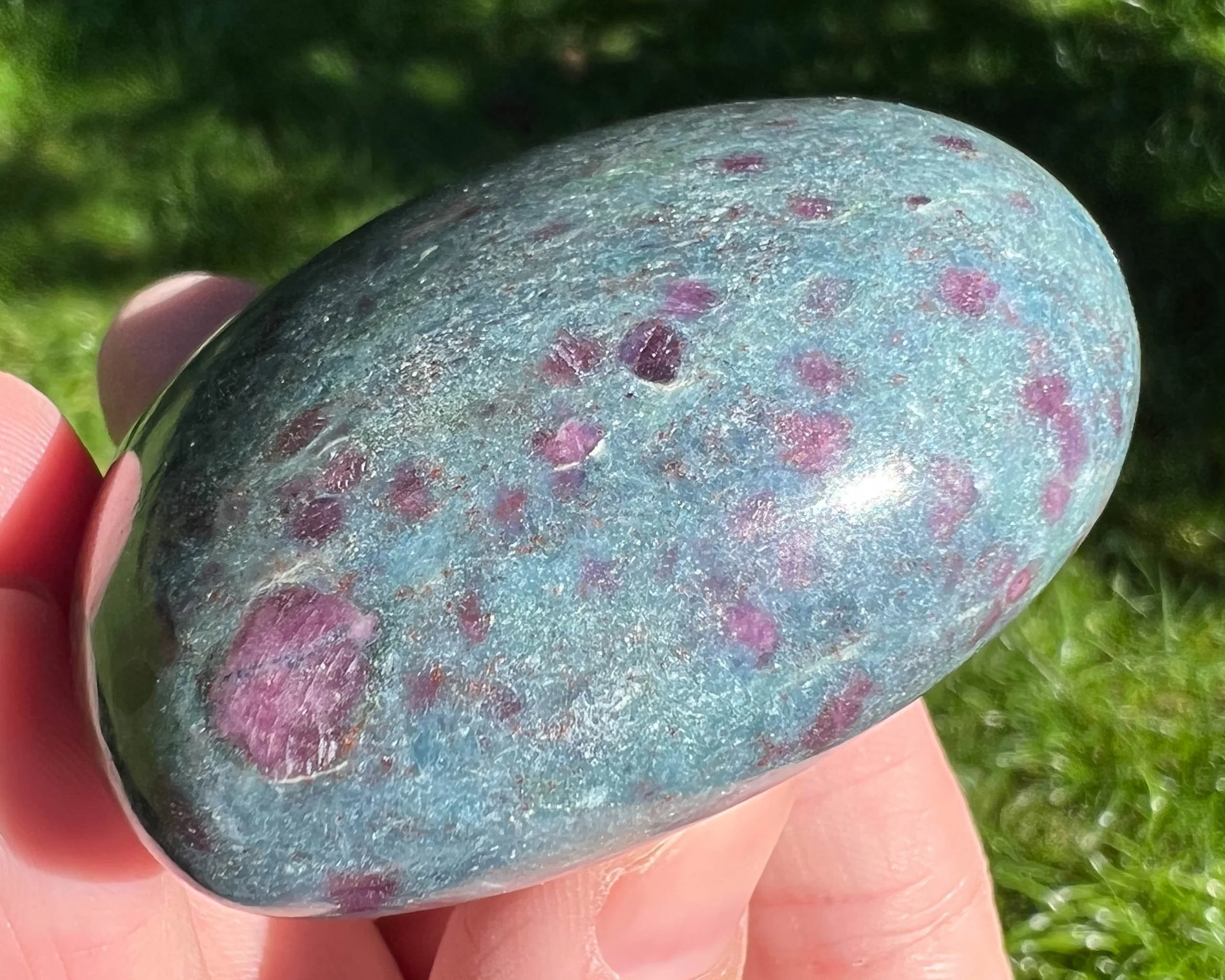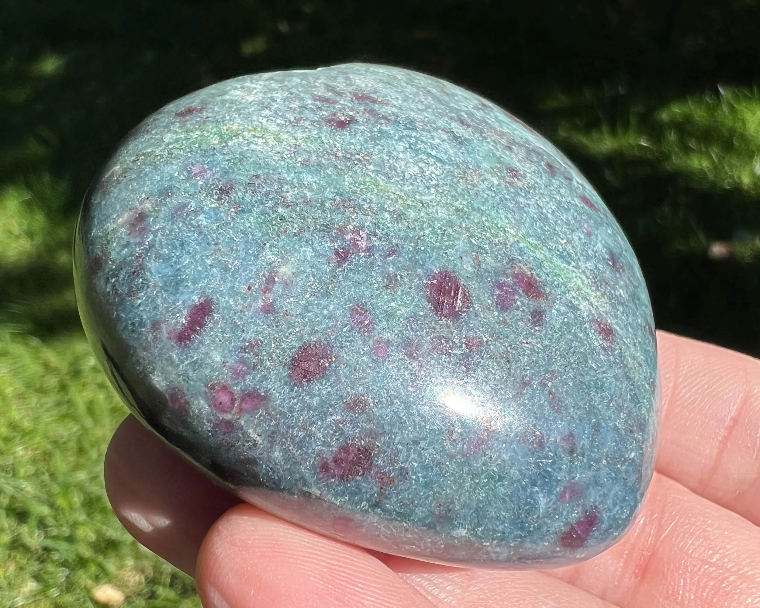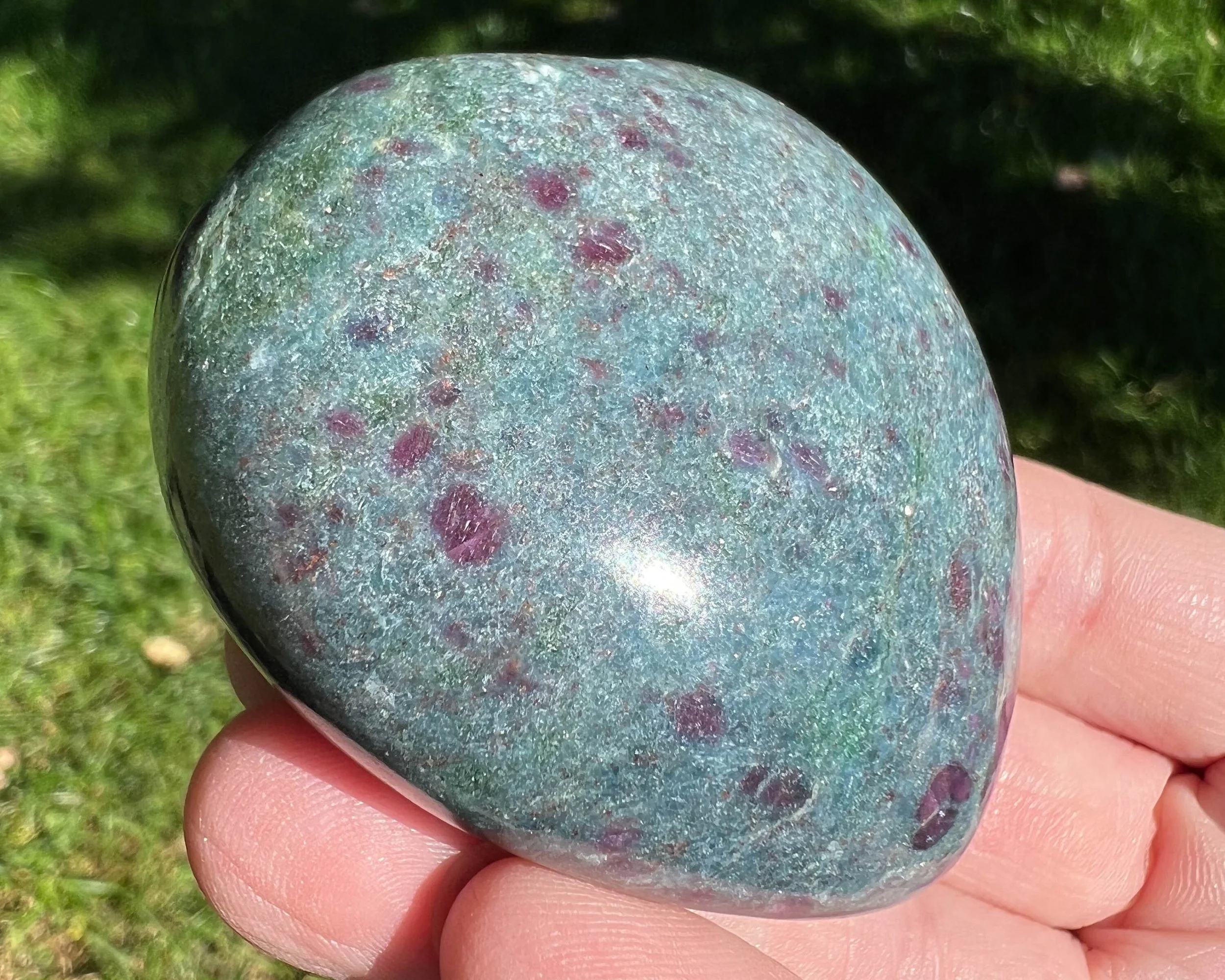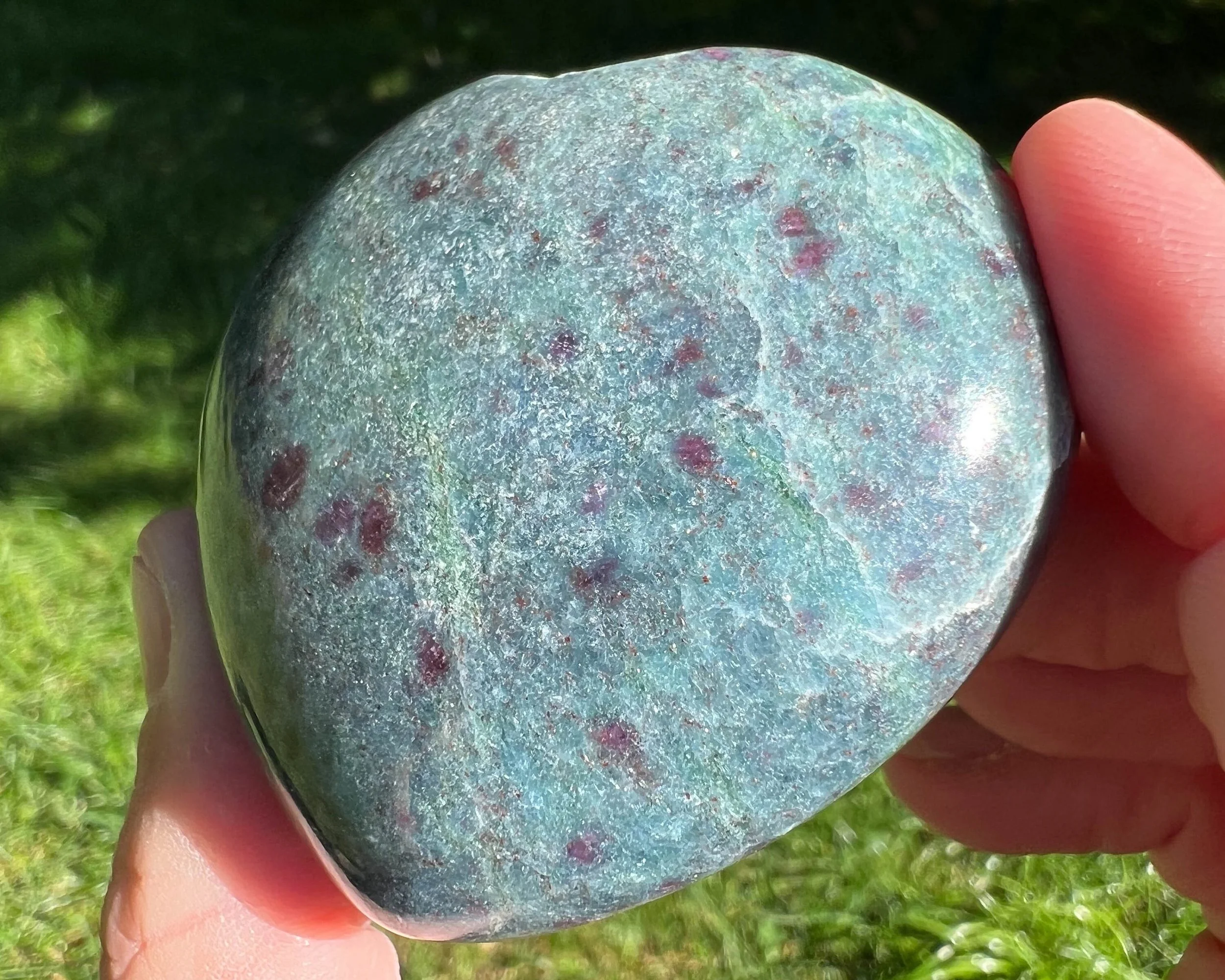 This is a beautiful, vibrant heart of Ruby with Kyanite and Fuchsite. The Kyanite is bright blue and the Ruby is a deep, reddish pink. The Fuchsite is sparkly green. The colors are awesome, the quality is great, and you will not be disappointed in this beauty! :)