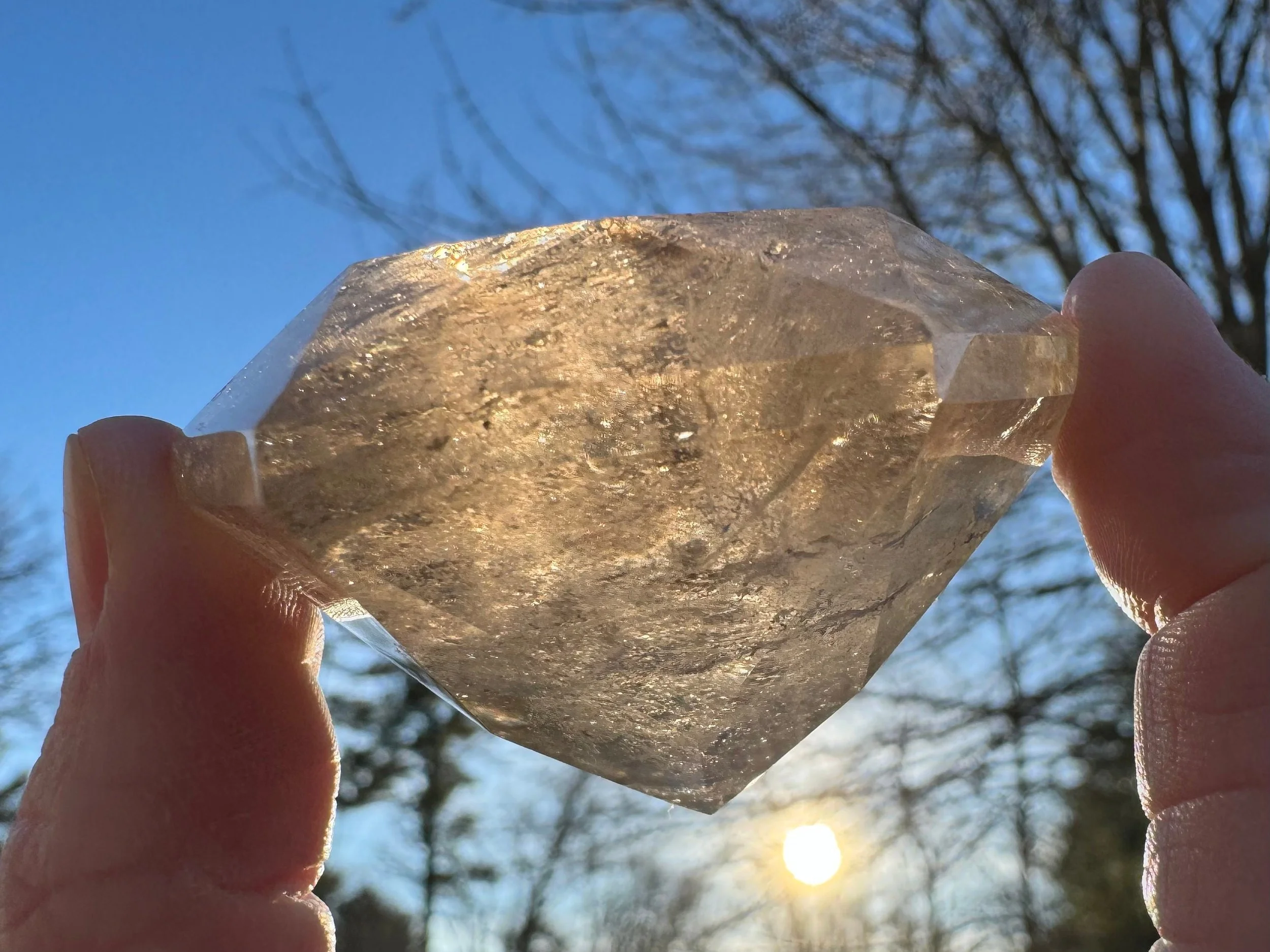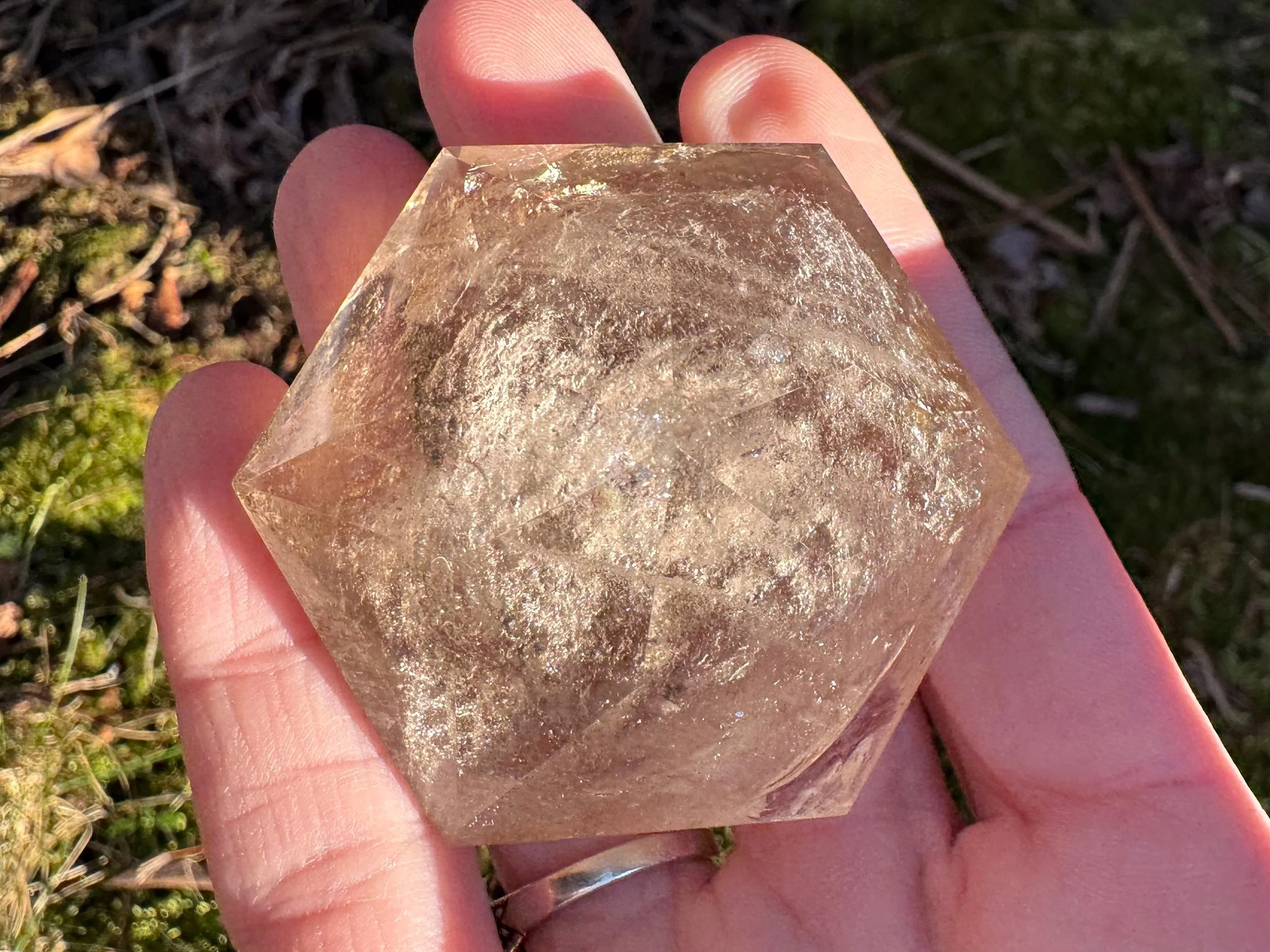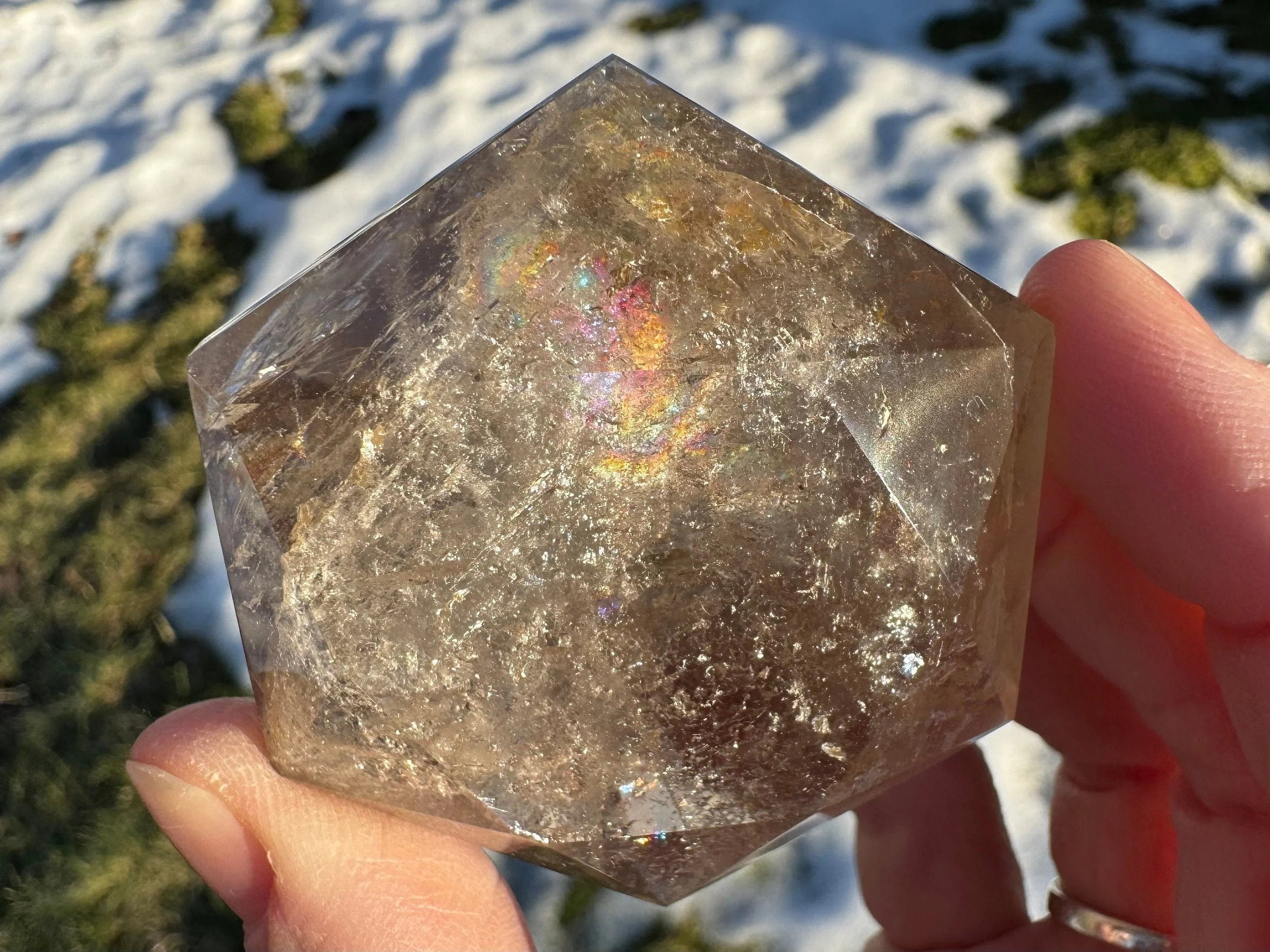 This is a Smoky Quartz crystal with light gray coloring that is very translucent in the light, cut and polished into a diamond, aka Brilliant cut. It has some little rainbows in it too. It is natural Smoky Quartz crystal, cut like a large faceted jewel :) Perfect for anyone who loves crystals, jewels, diamonds, or just likes a little glam in their life!