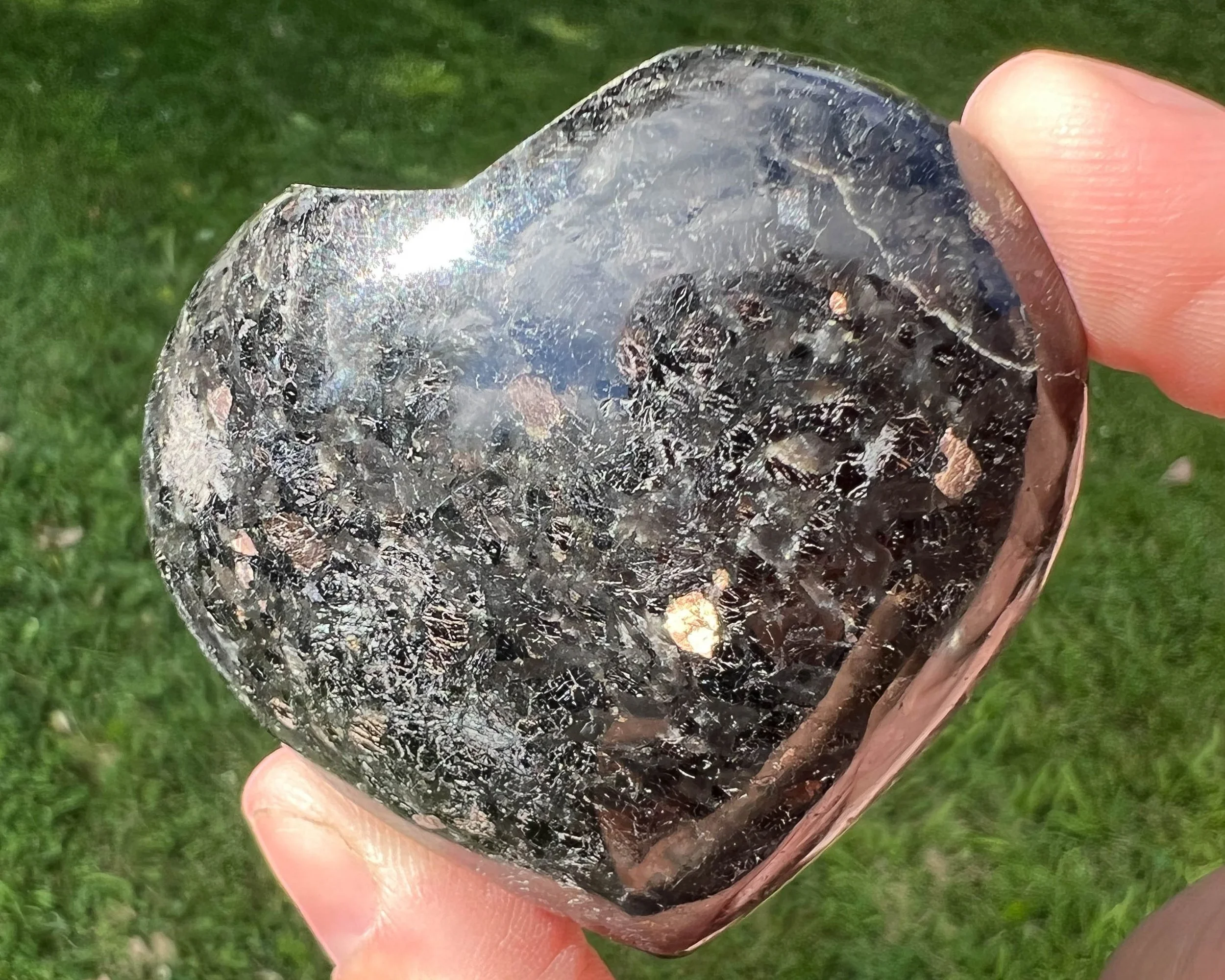This is a lovely heart made of a stone called Norite or Bronzite Gabbro. It is a stone often mislabeled as Nuummite, which has long golden streaks of Anthophyllite and Gedrite in it. This is a black Gabbro stone with shiny copper and gold colored specks of Bronzite all over. It is also mislabeled Coppernite, Galaxy Granite and other names. Very nice with pretty sparkly flakes inside :)