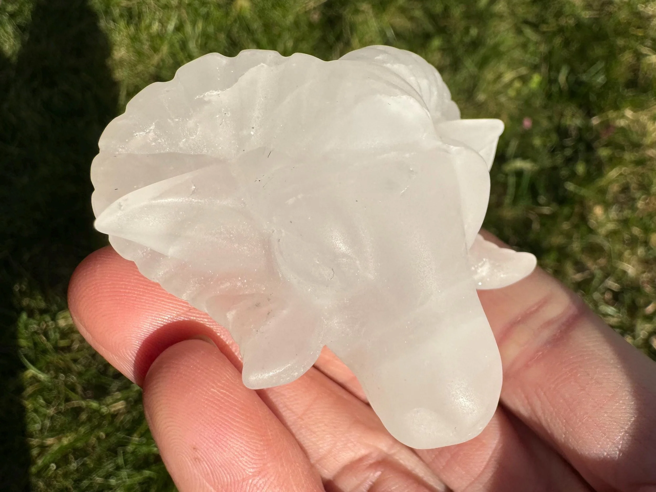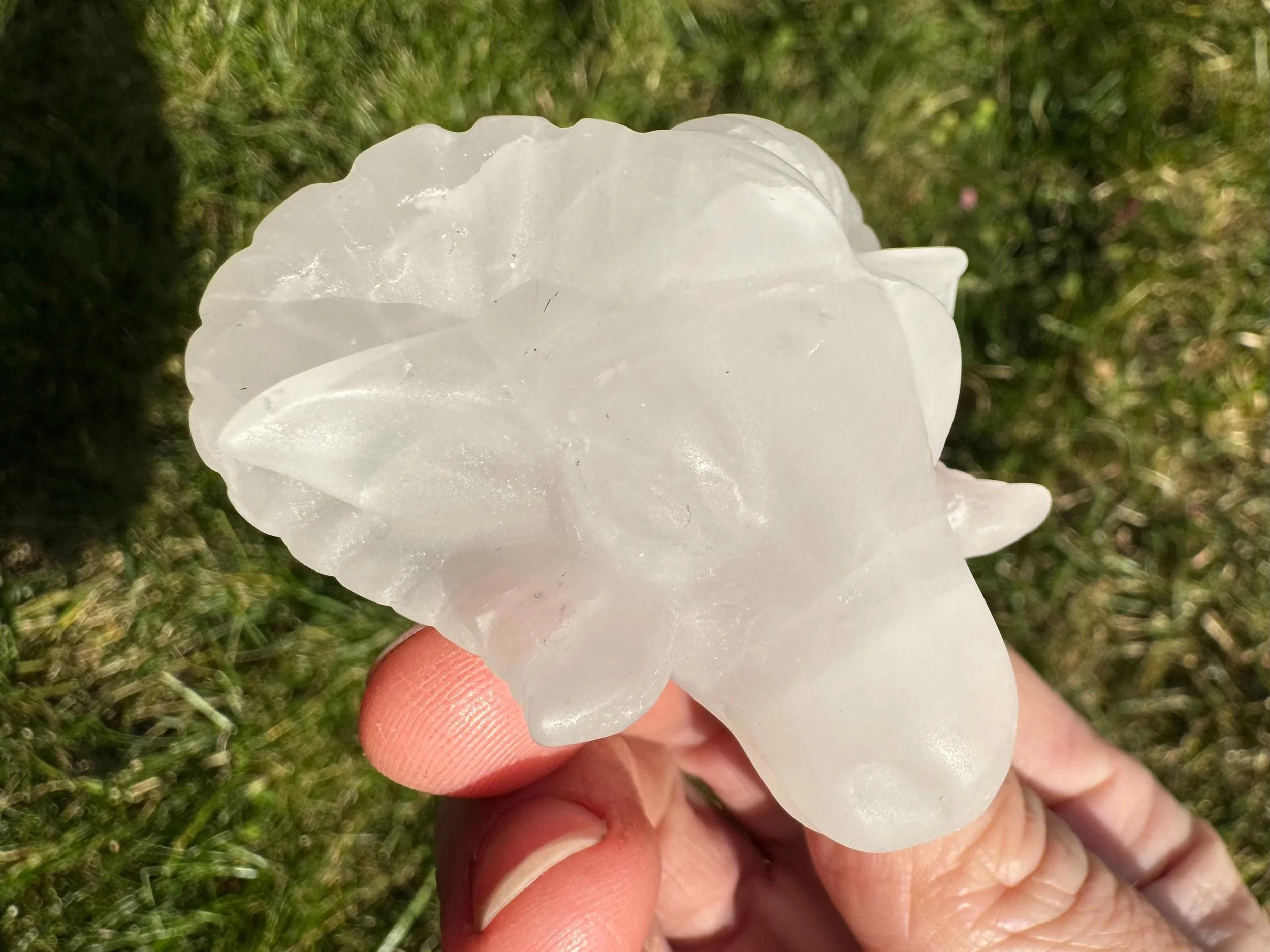 This is a ram head carving made from clear to white Quartz, It is the head with face and ram horns. It has eyes, ears and mouth carved in it. Sits nicely as a display piece. Cool goth / occult vibe decor.
