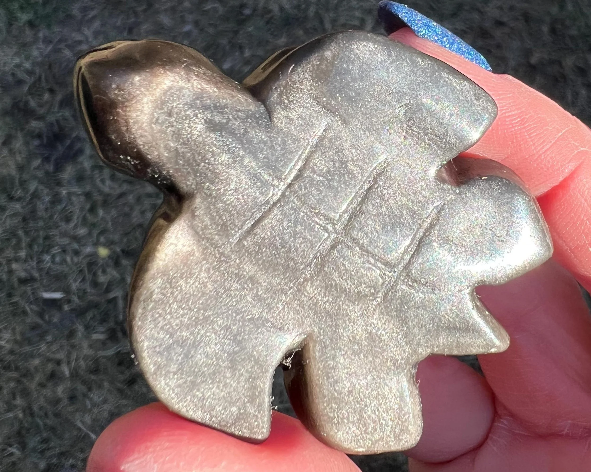 This is a beautiful carving of a sea turtle made from shimmery silver sheen Obsidian from Mexico. In the sunlight (or any light) the black Obsidian shimmers with bright, metallic silver shimmer.