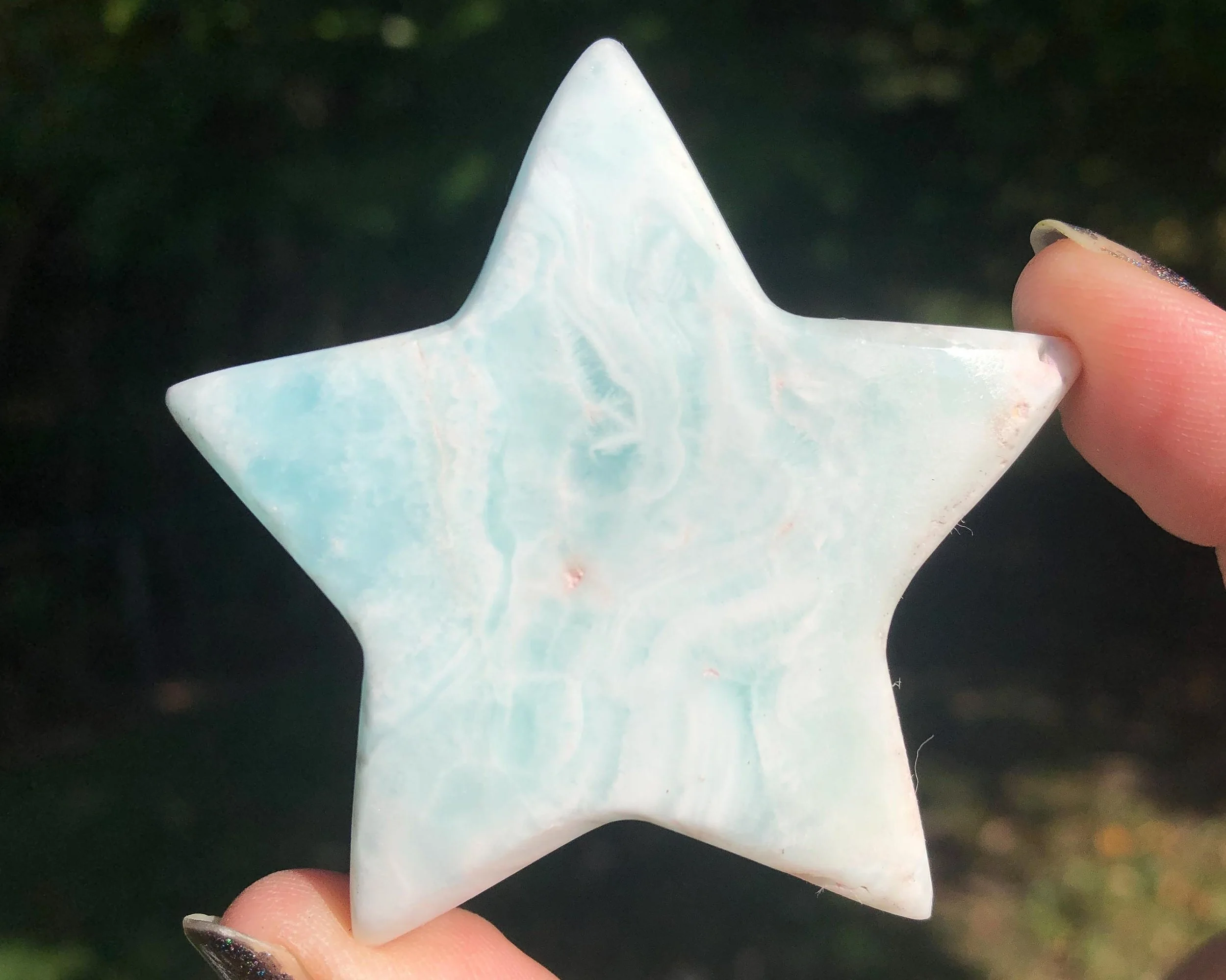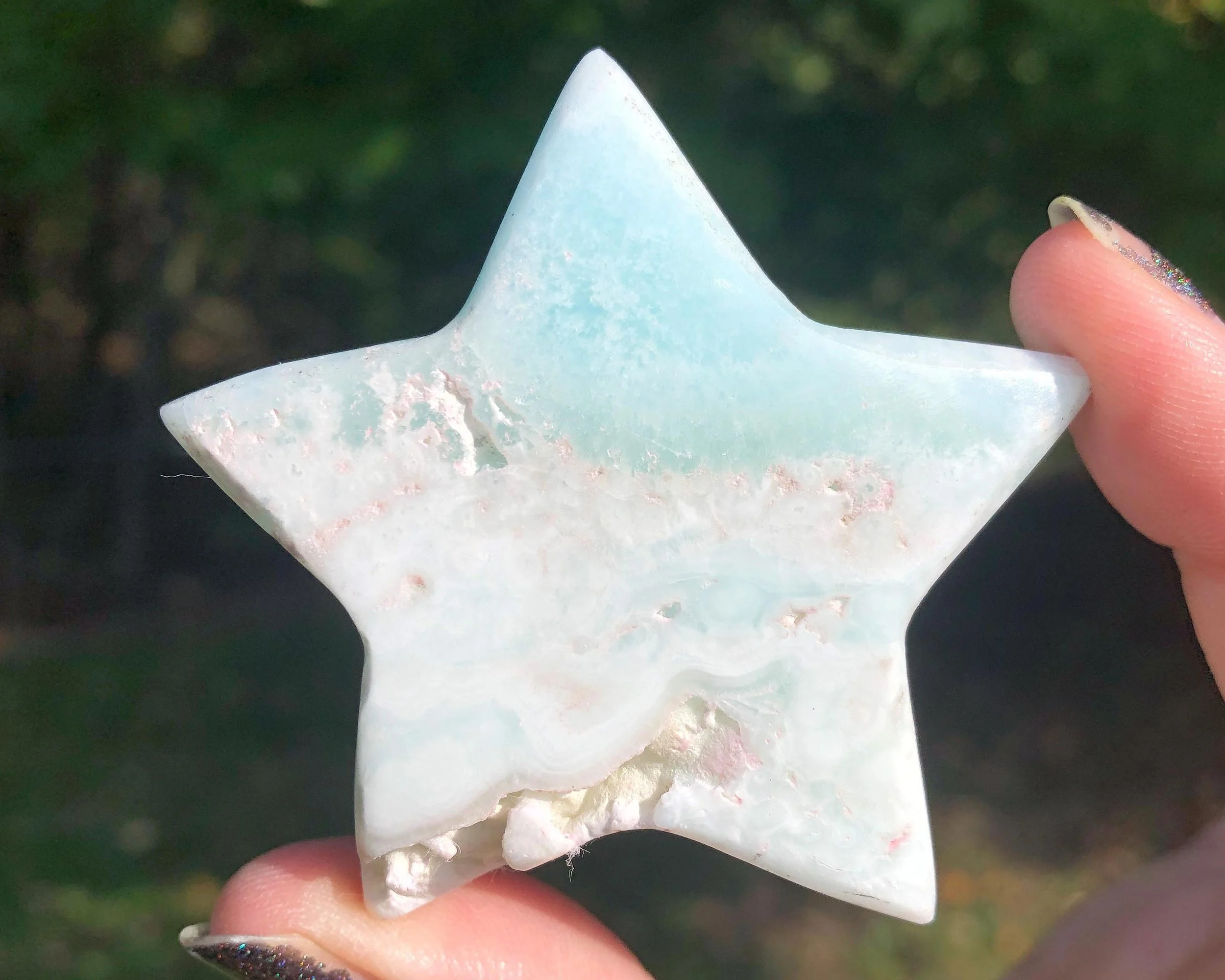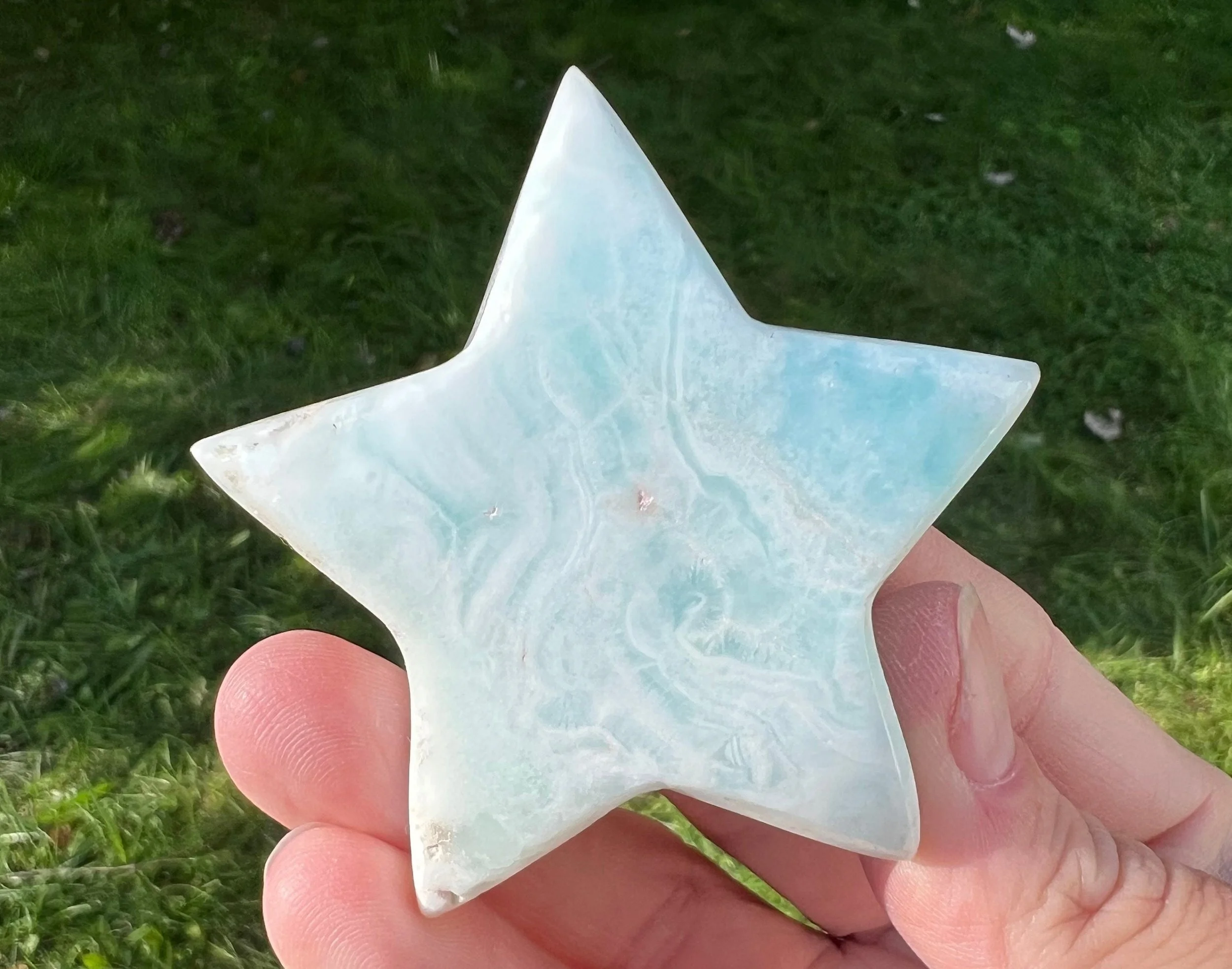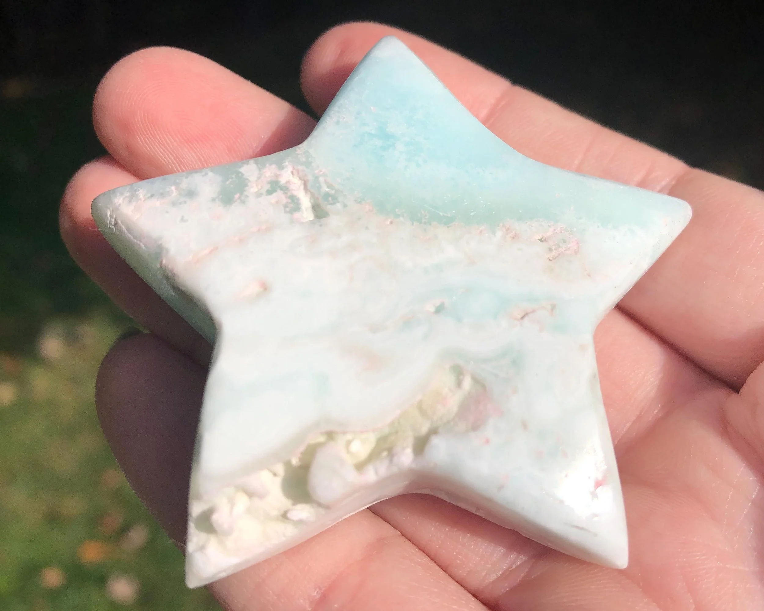 This is a star carved from beautiful blue Aragonite or calcite - it is much debated and I don't know for sure. But it is beautiful bright blue green with sandy tan in a lovely star shape!