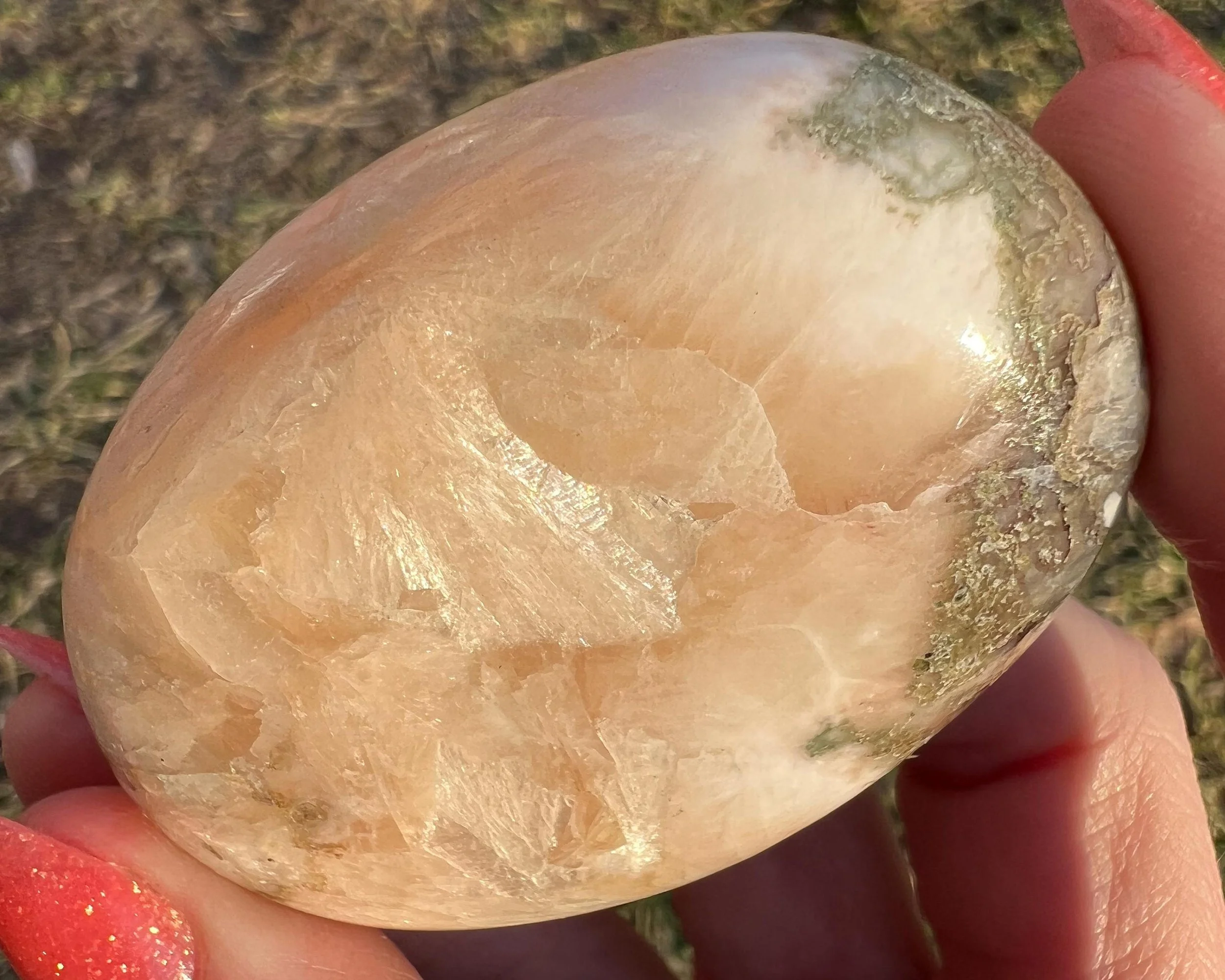 This is a lovely palm stone of peachy pink Stilbite with green Heulandite. It has a lovely chatoyant sheen to it and pretty coloring. These are so hard to come by and I am so happy to have a few to offer for you!