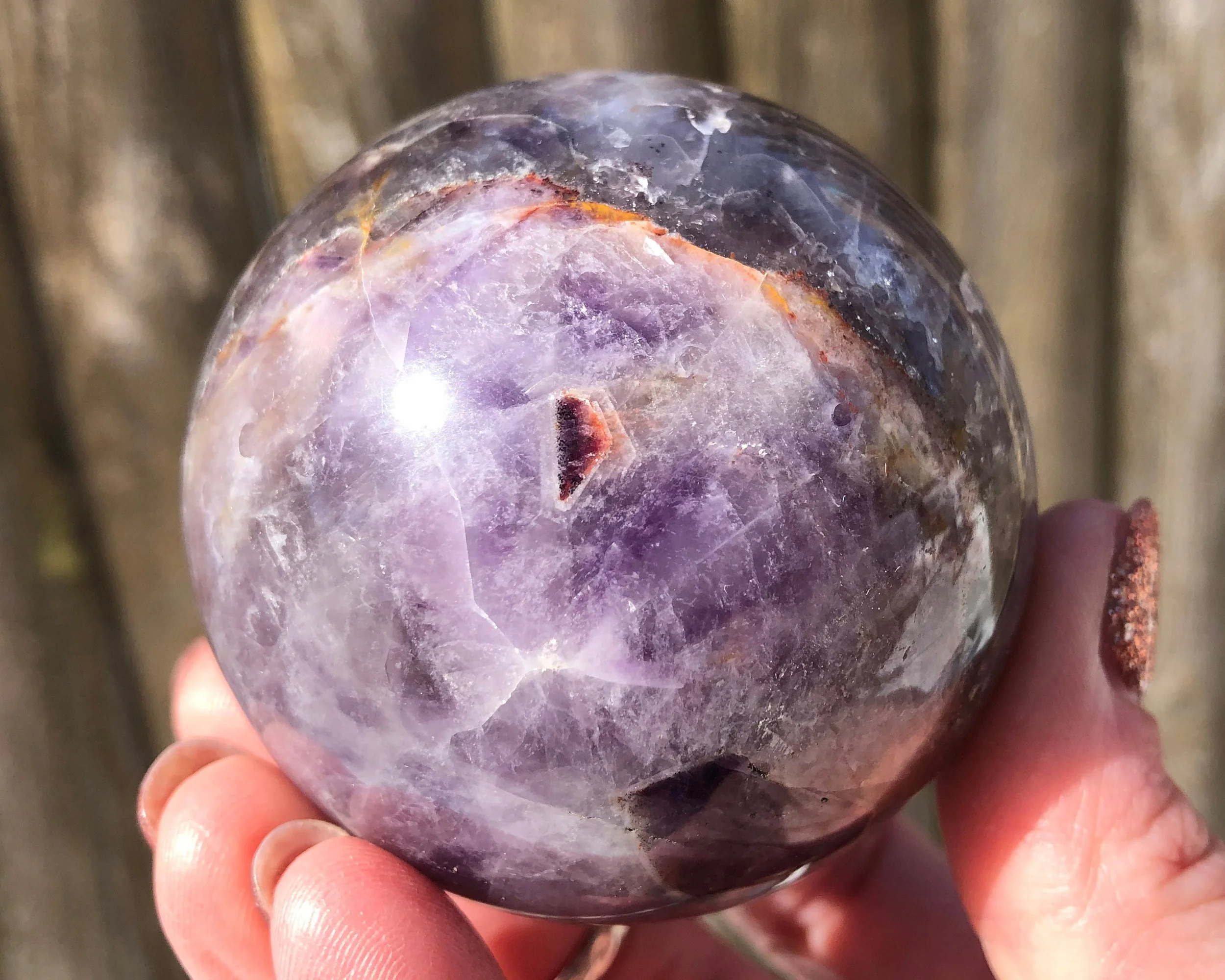 This is a gorgeous Chevron Amethyst sphere with patterns of deep dark smoky purple, deep red and light purple to white from India. This piece has lots of beautiful contrast and nice patterns. Tiny baby rainbows too. Such a beauty!