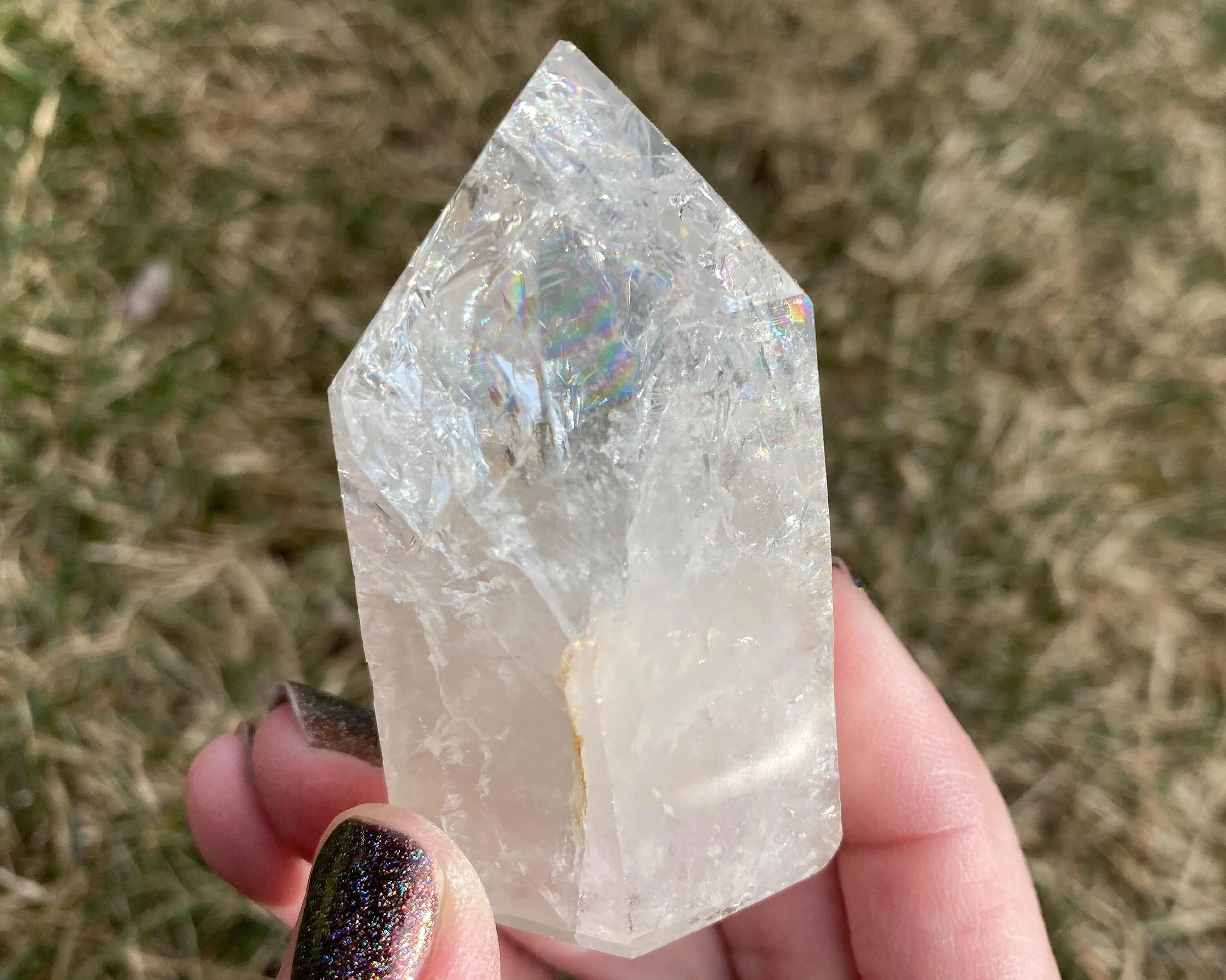 2.4" Rainbow Lemurian Quartz Crystal Tower #6 Semi Polished Fire & Ice Point, Clear Crackle, Natural Sides, Healing Crystal Gift for Her