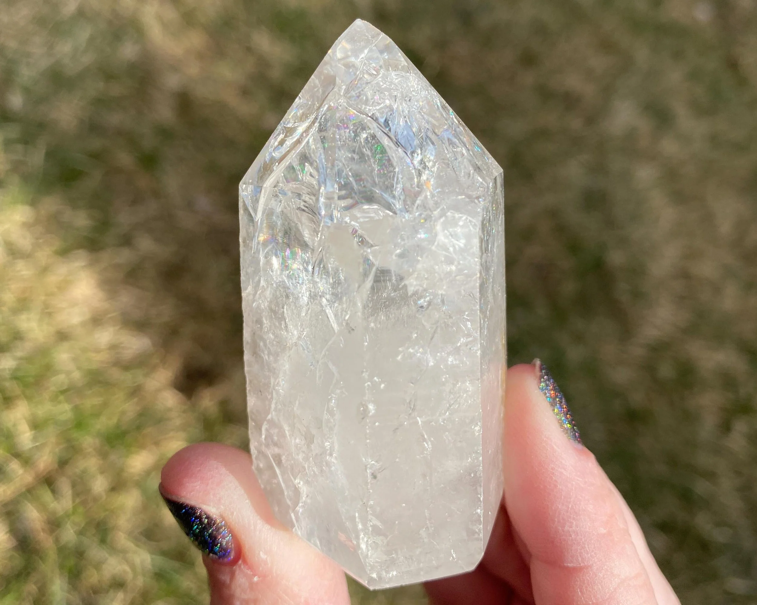 This is a Lemurian Quartz crystal with internal fractures caused by heating and cooling (by man), which reflect light in a way that makes rainbows- much like a prism. It is not coated or painted, it is a clear Quartz point full of rainbows! This is a Lemurian Quartz point with good clarity classic to Lemurian Quartz.