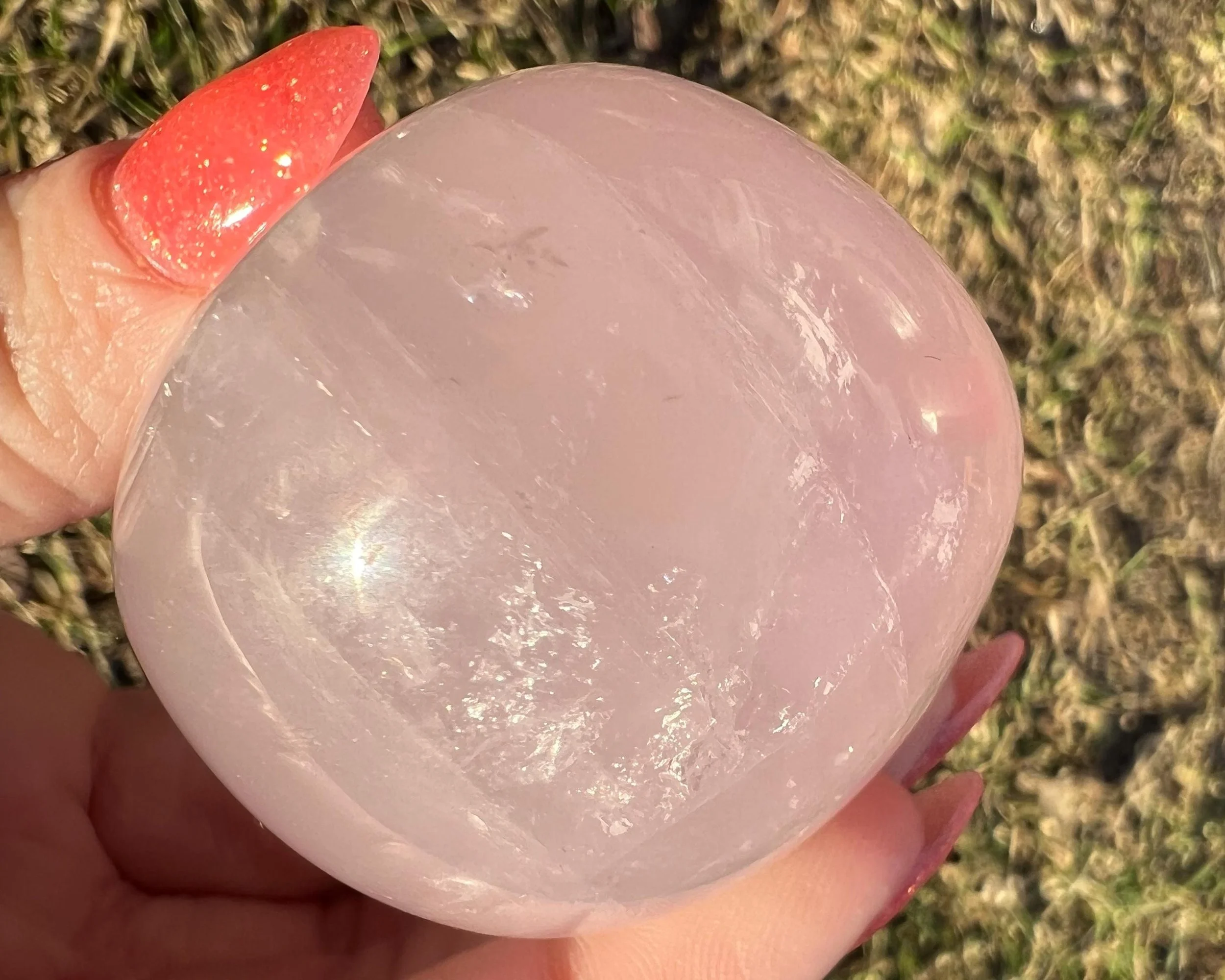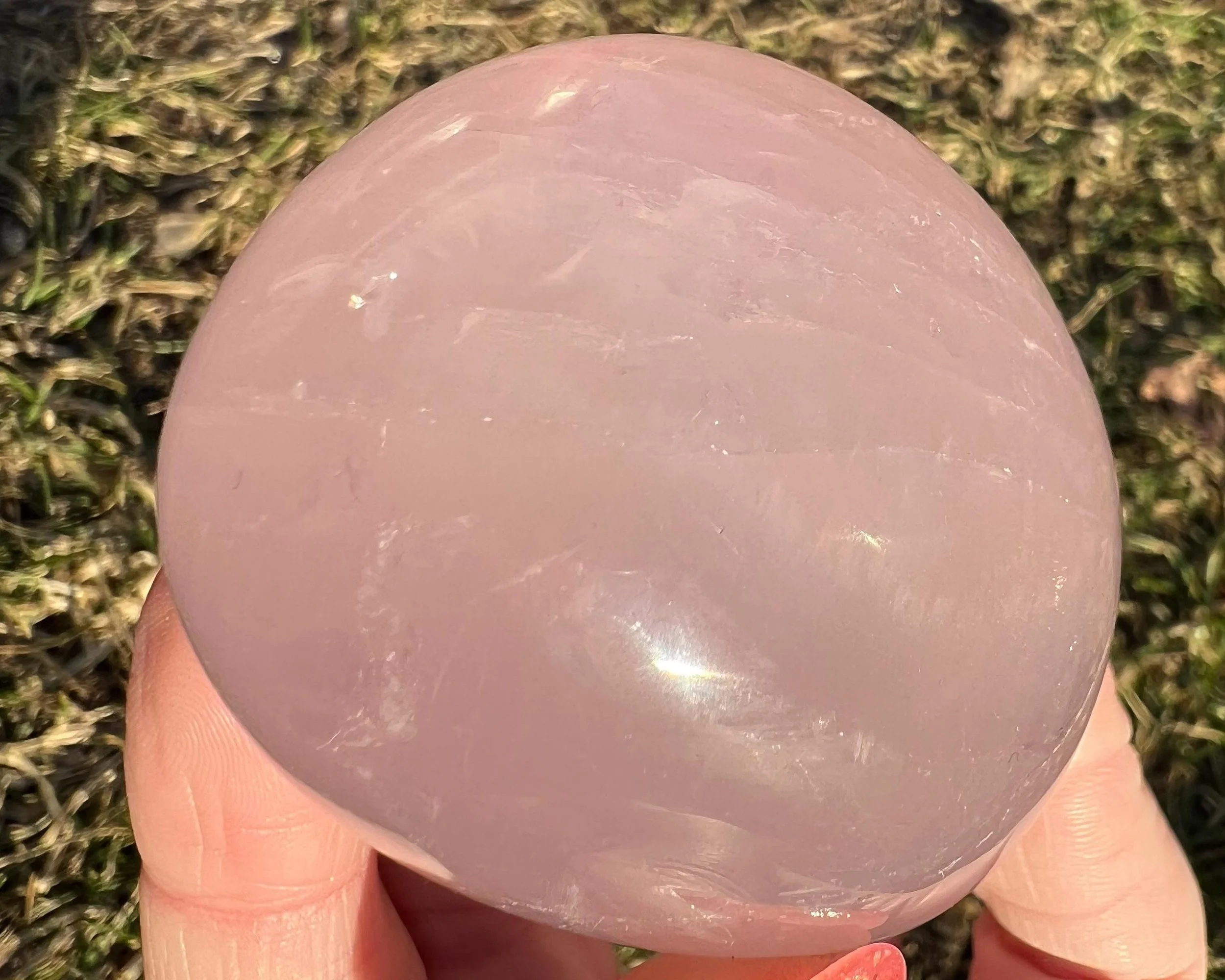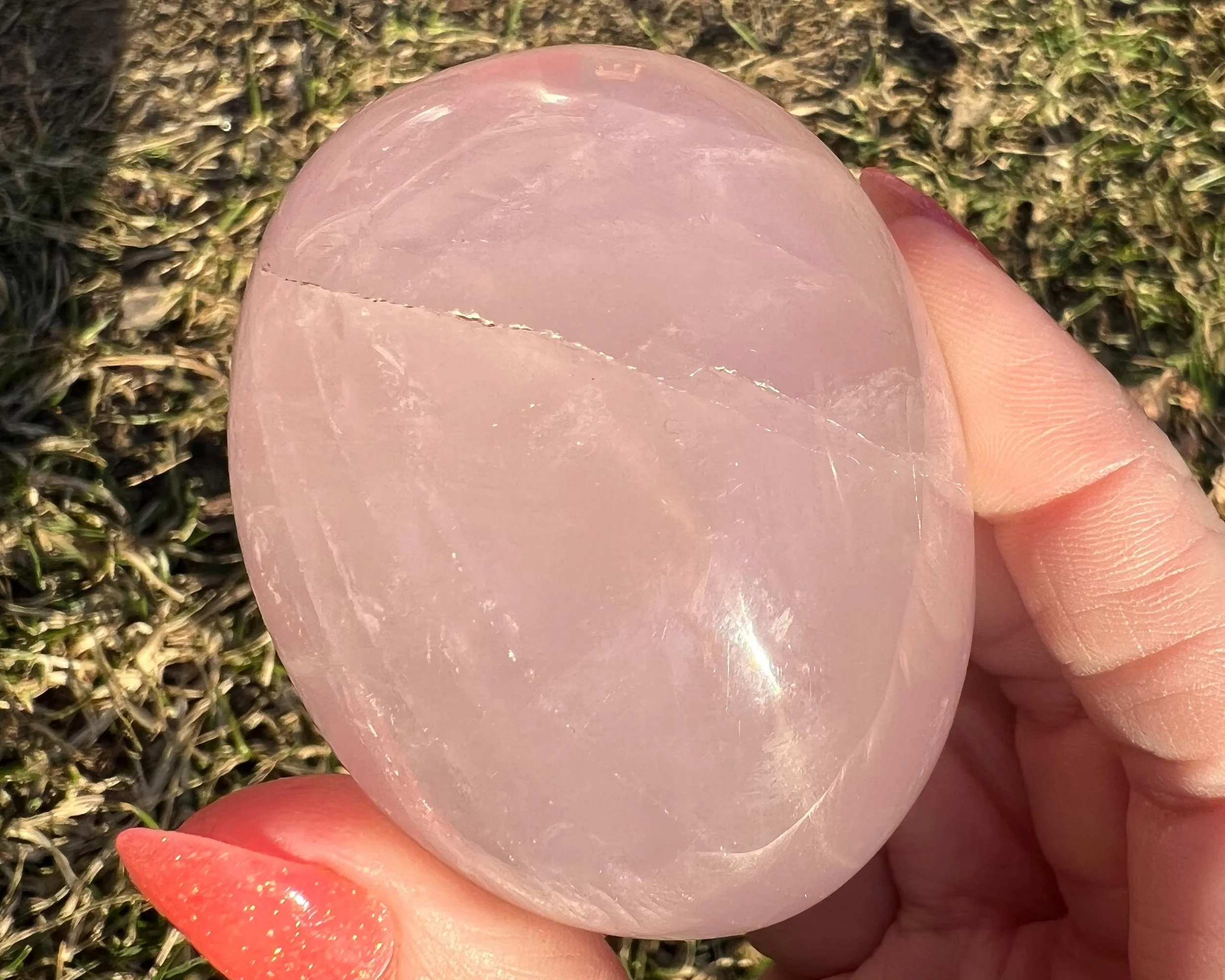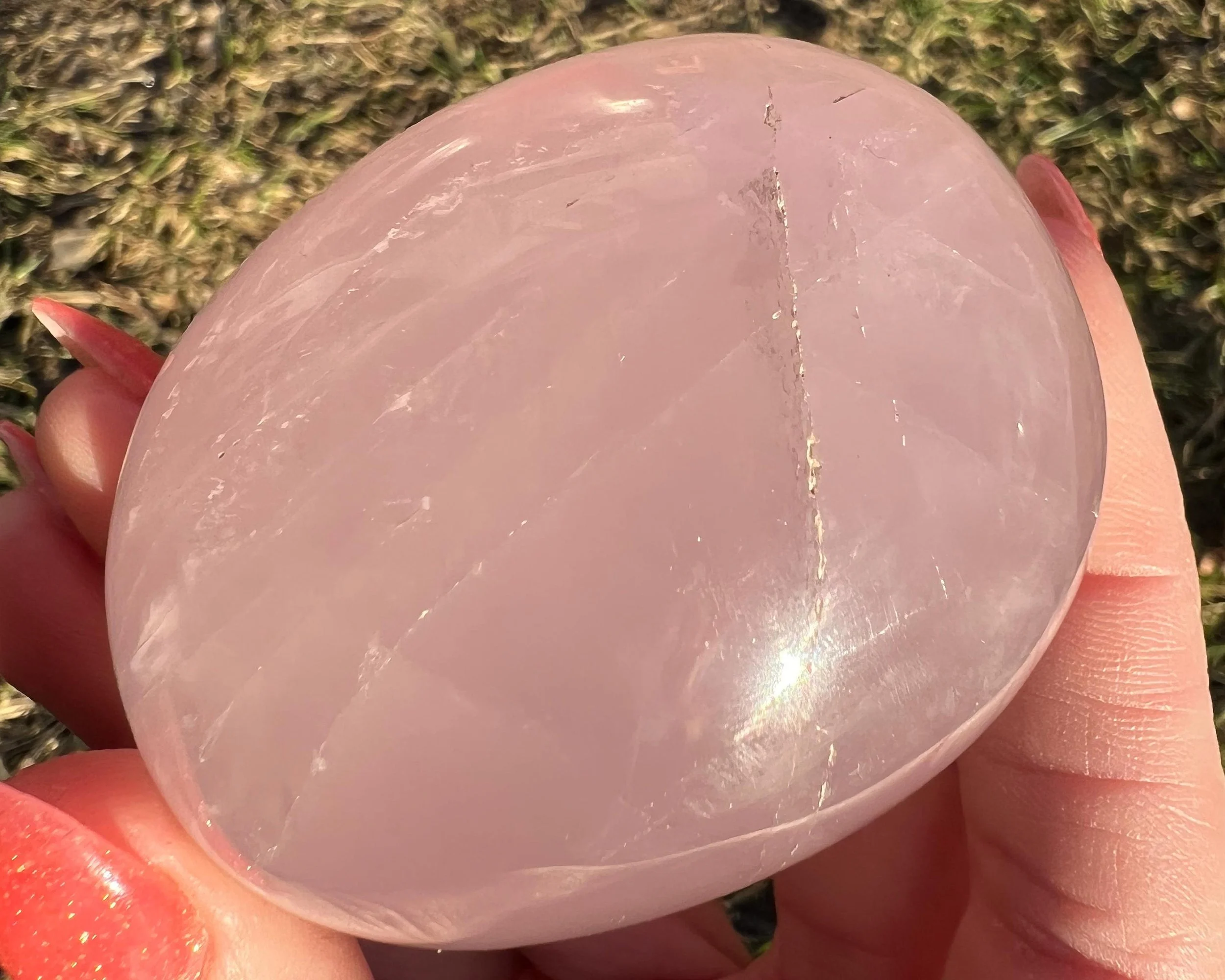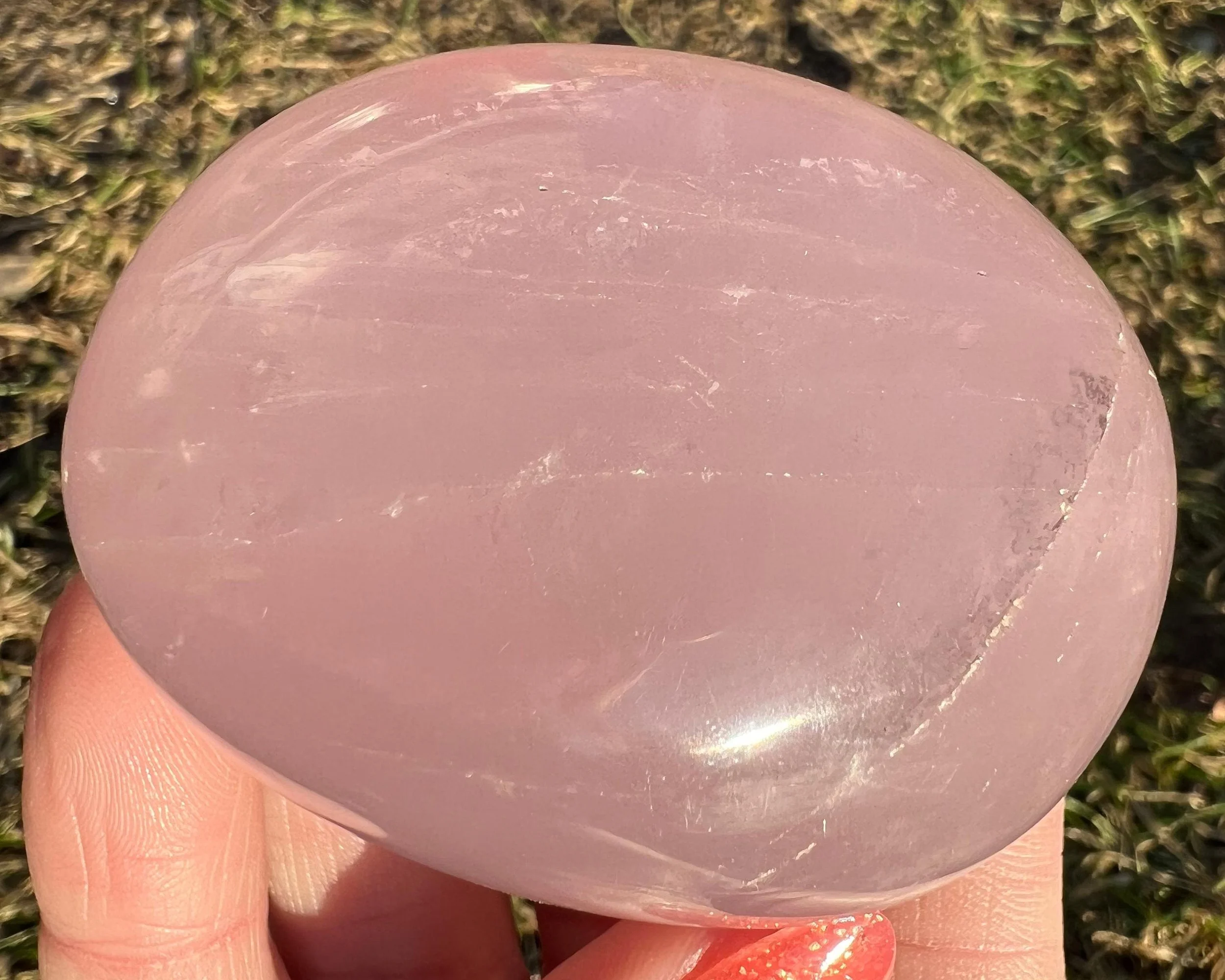 This is a big beautiful palm stone of Star Rose Quartz <3 It has asterism, meaning it has lines that move through it and meet up to make 6 line stars -or asterisks. The stronger the light the stronger the lines. It has some nice rainbows too. This one is really thick, a funky shape :)