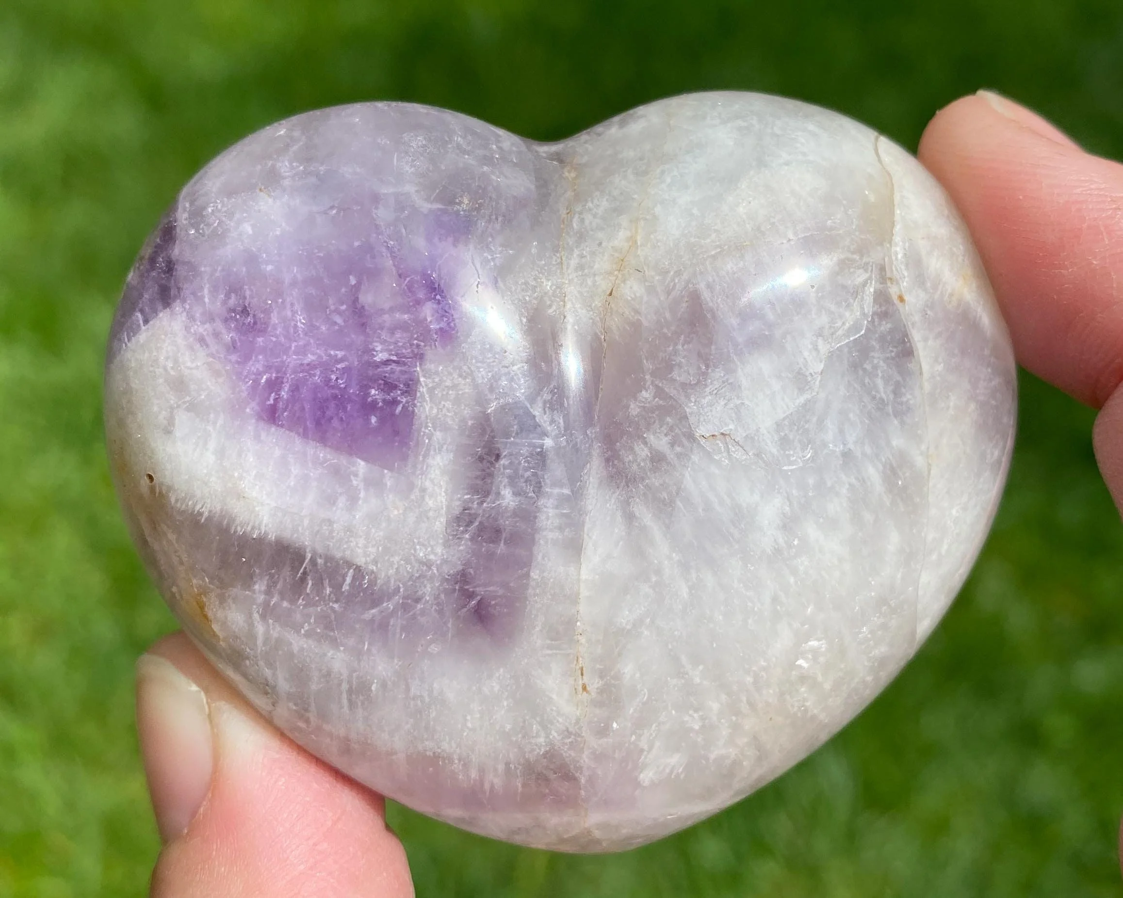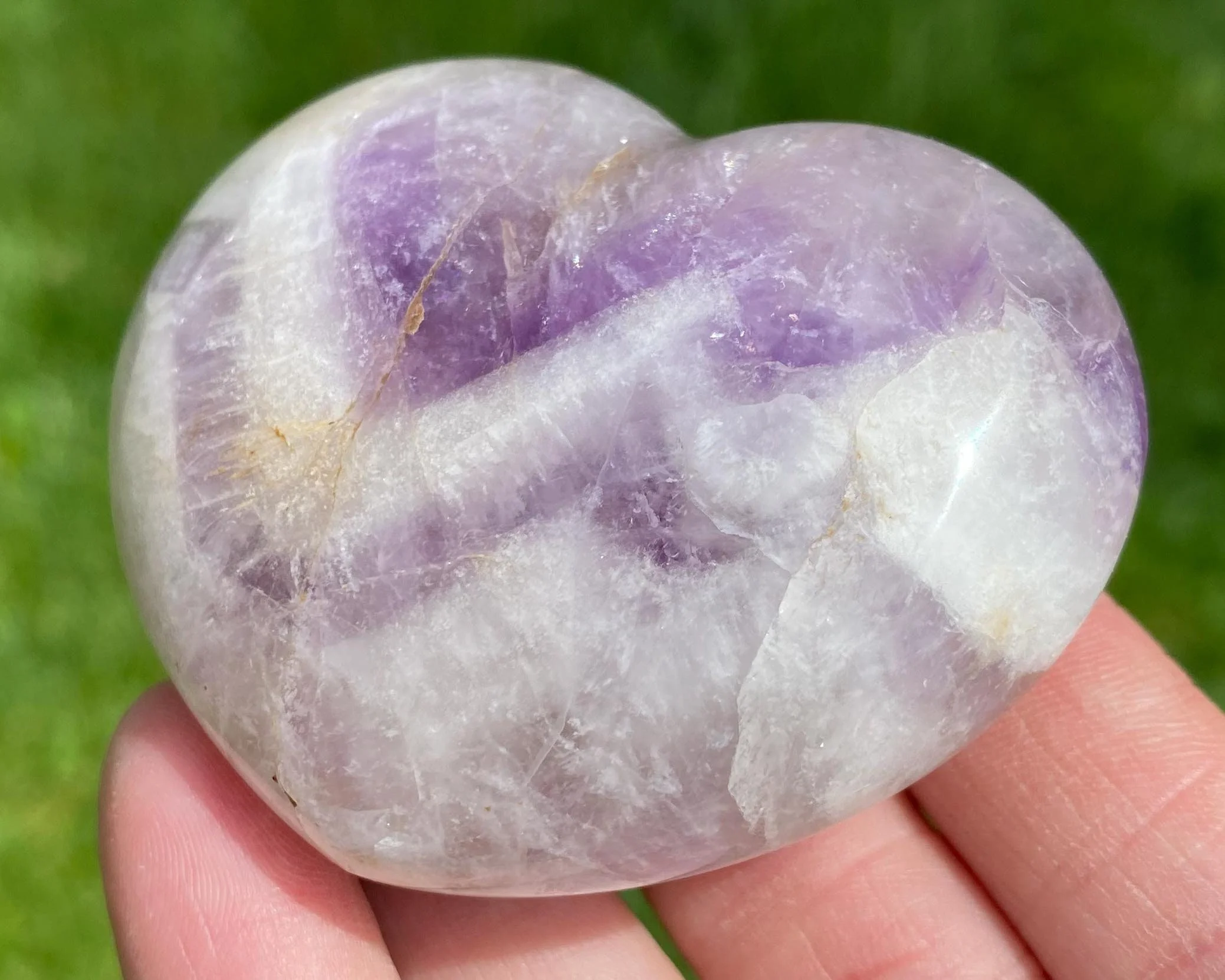 This is a pretty purple and white Chevron Amethyst heart. White and clear Quartz forms between Amethyst layers forming chevron patterns, giving us Chevron Amethyst. This one has bright purple coloring and nice white contrast :)