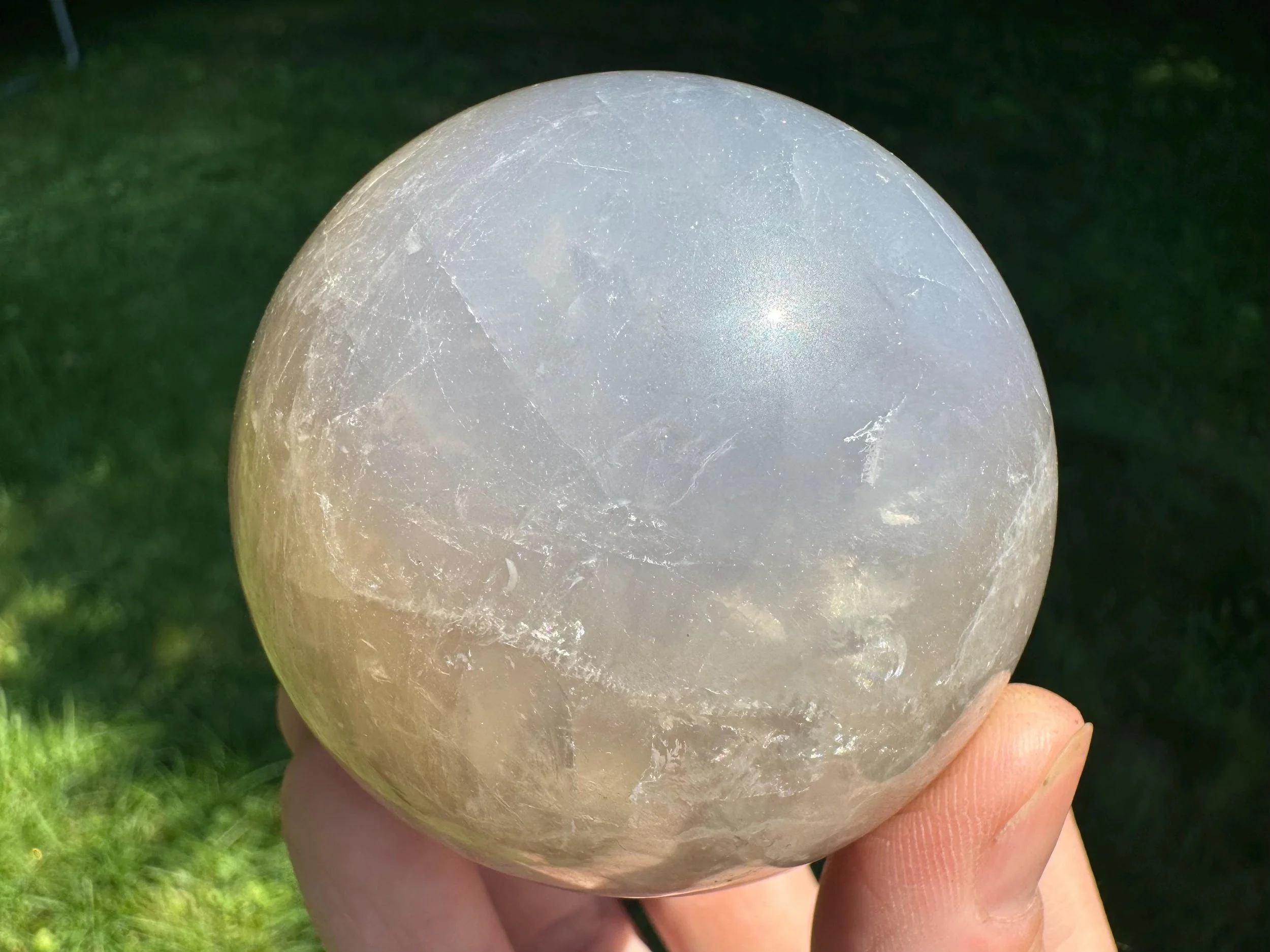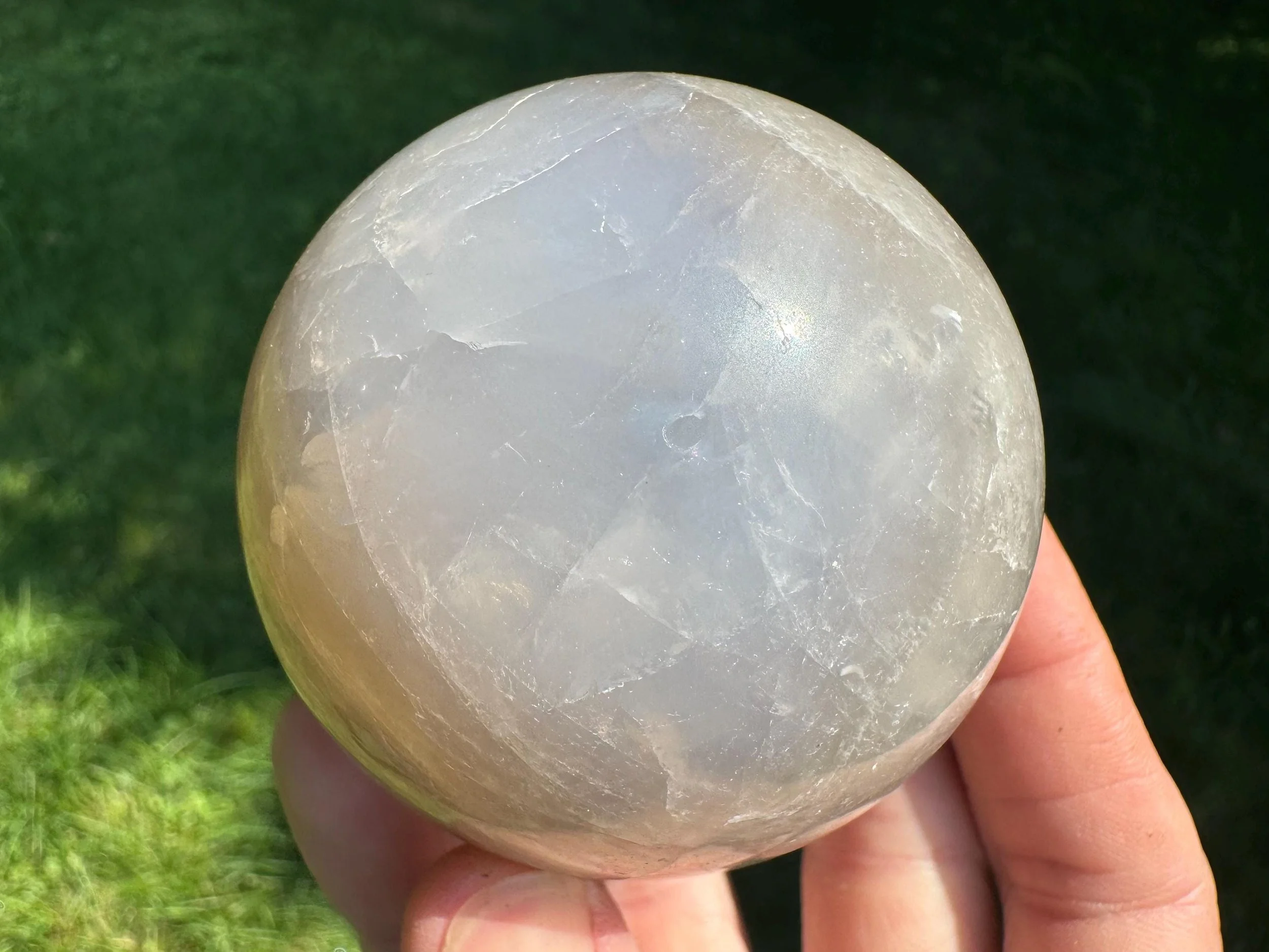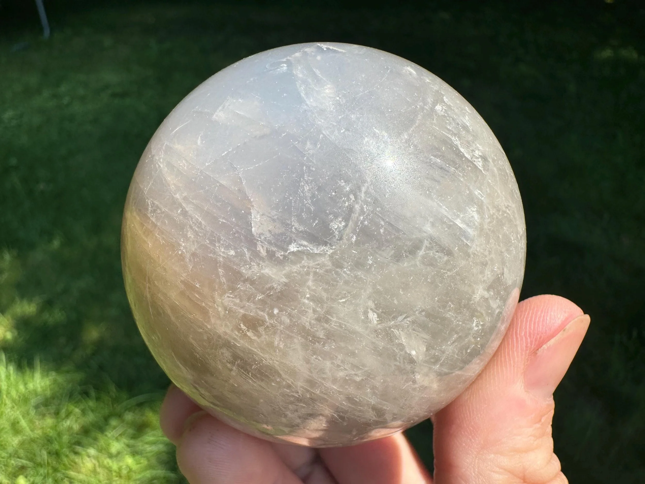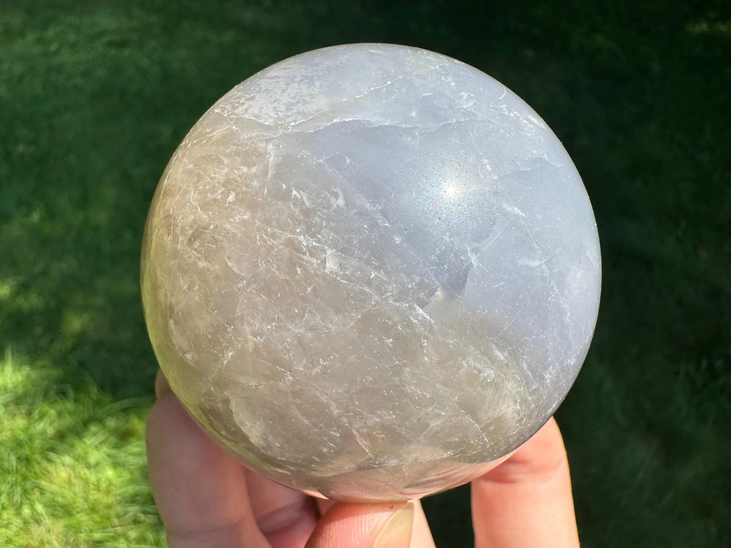This is a lovely gemstone sphere made of natural Blue Rose Quartz, which has a blue glow to it, especially in the light. This one has a lovely glow in sunlight, with gray around the blue which may be considered Smoky Quartz along with the Blue Rose Quartz. Very pretty. You'll receive the exact one shown.