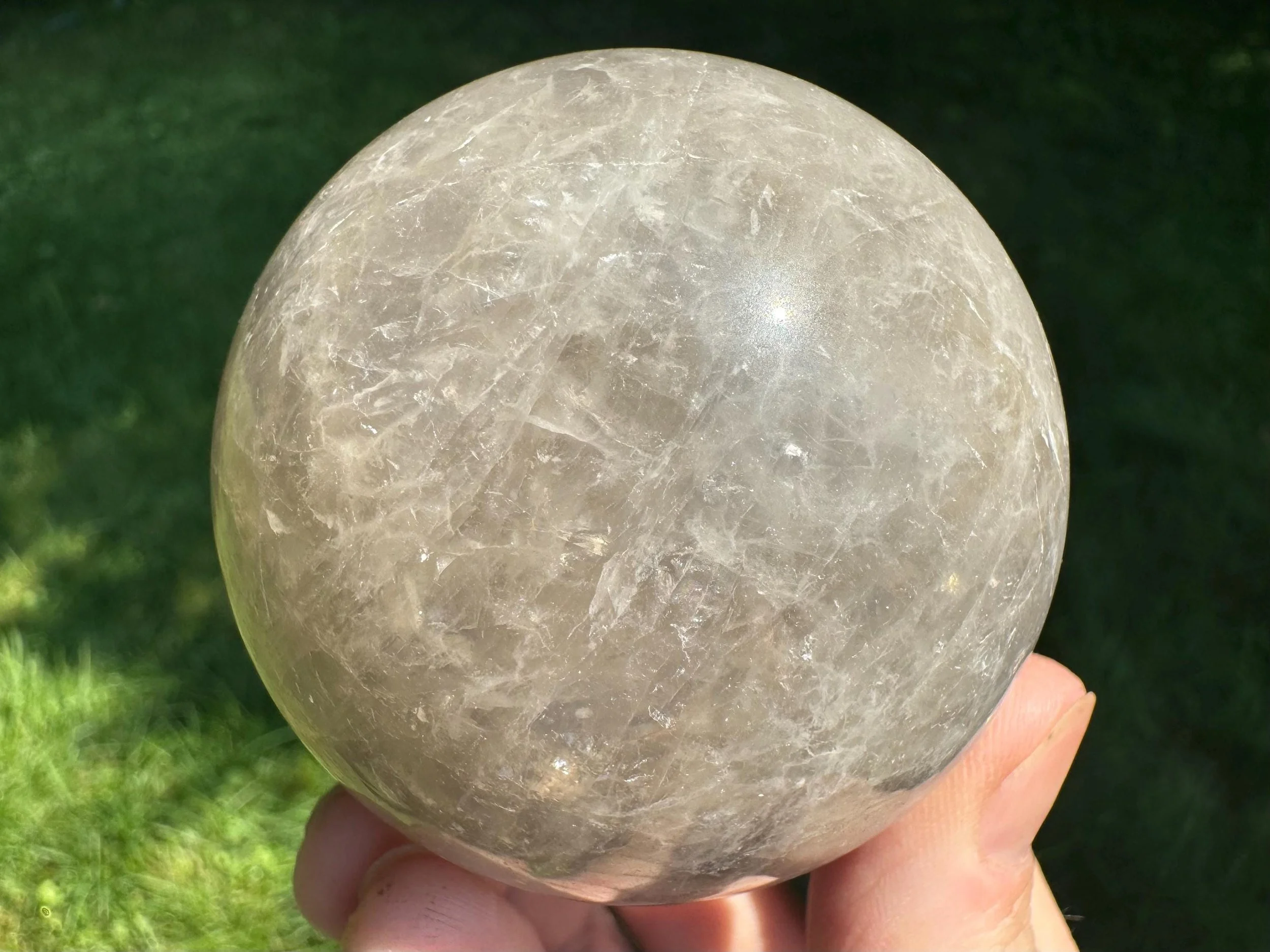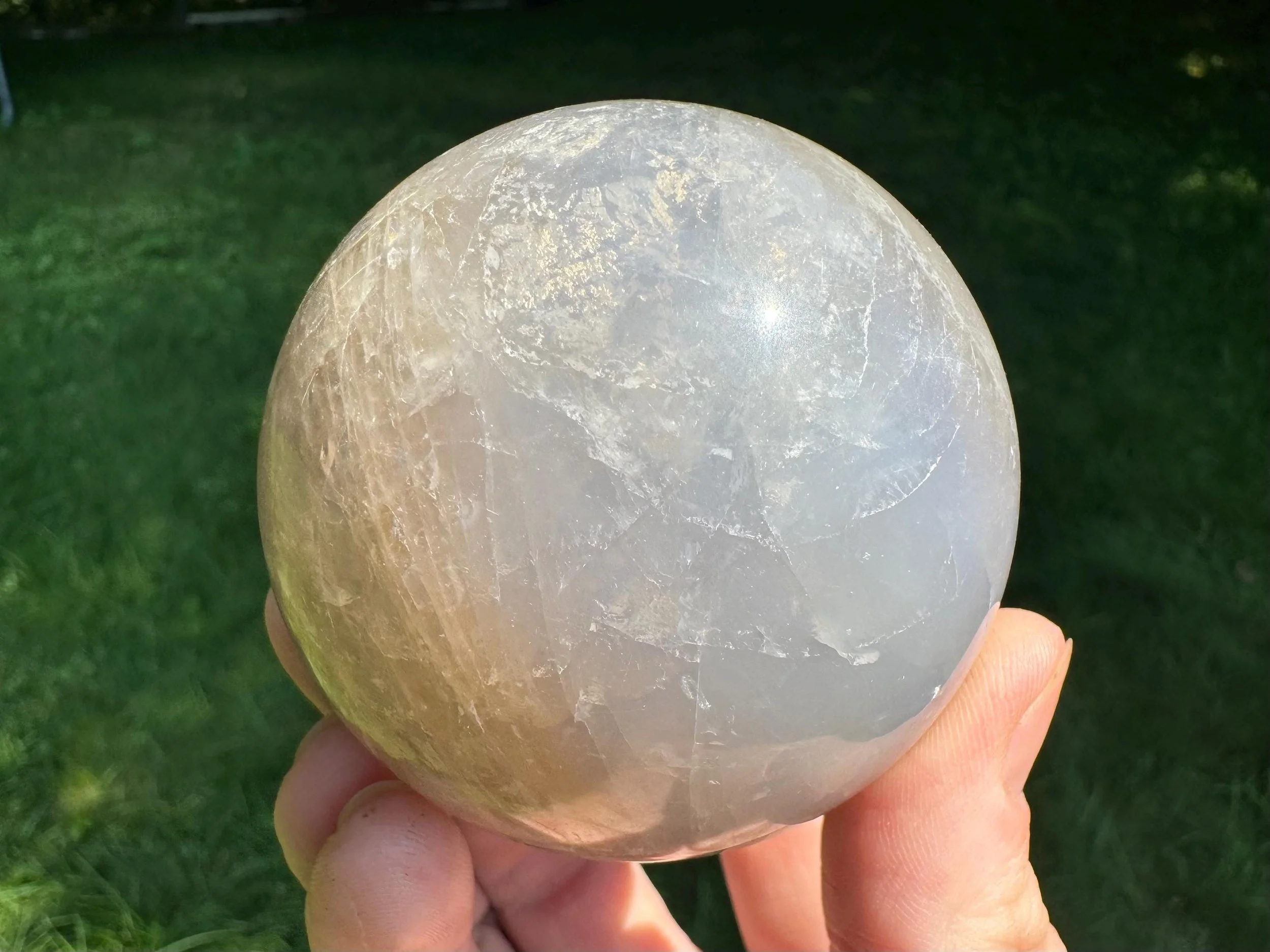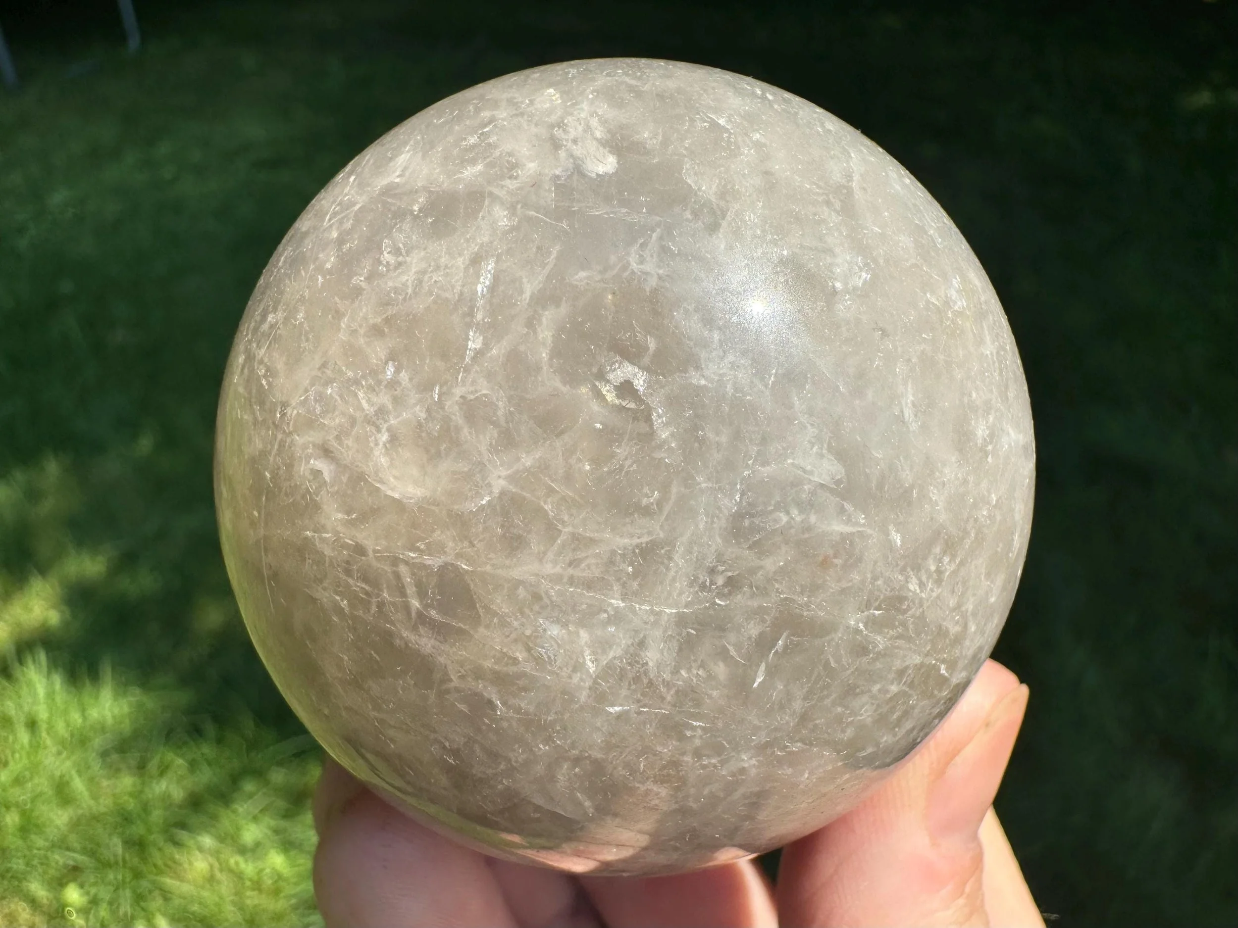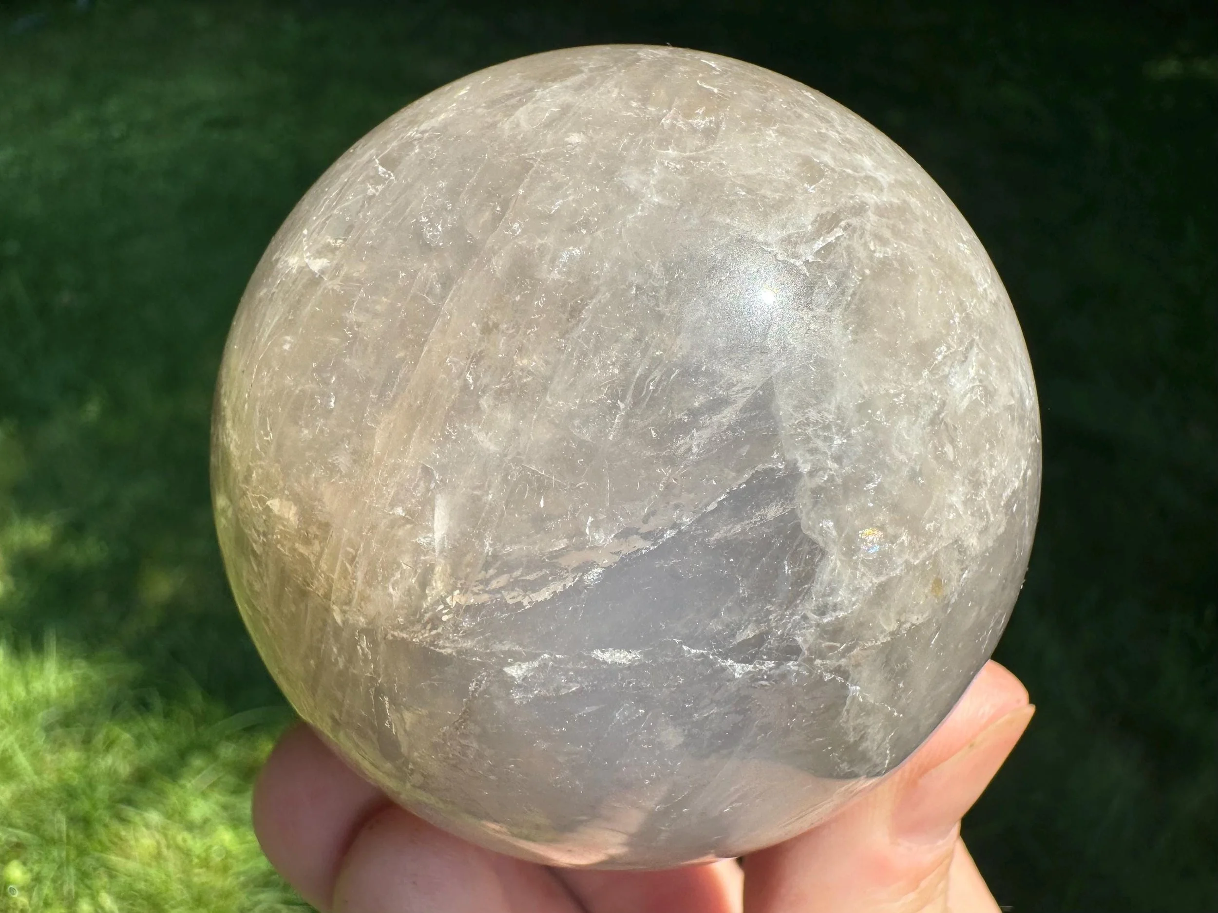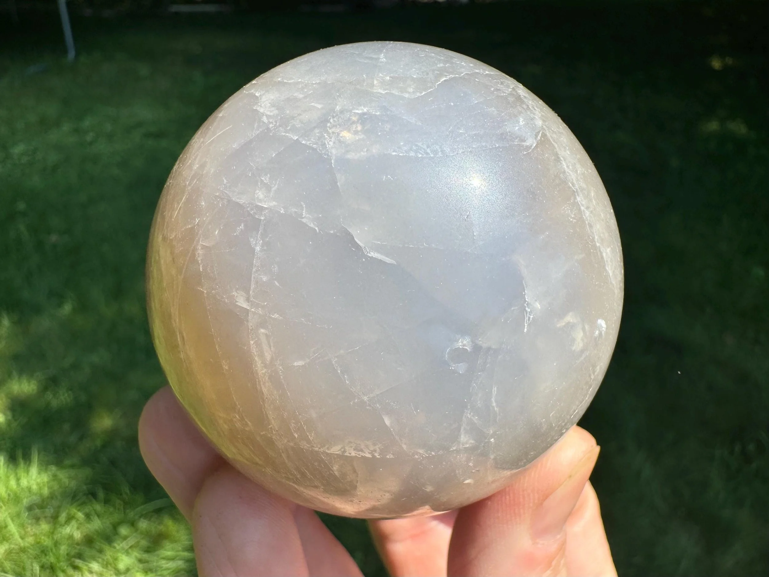 This is a lovely gemstone sphere made of natural Blue Rose Quartz, which has a blue glow to it, especially in the light. This one has a lovely glow in sunlight, with gray around the blue which may be considered Smoky Quartz along with the Blue Rose Quartz. Very pretty. You'll receive the exact one shown.