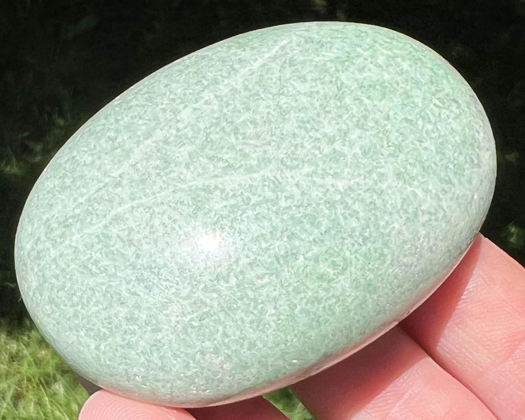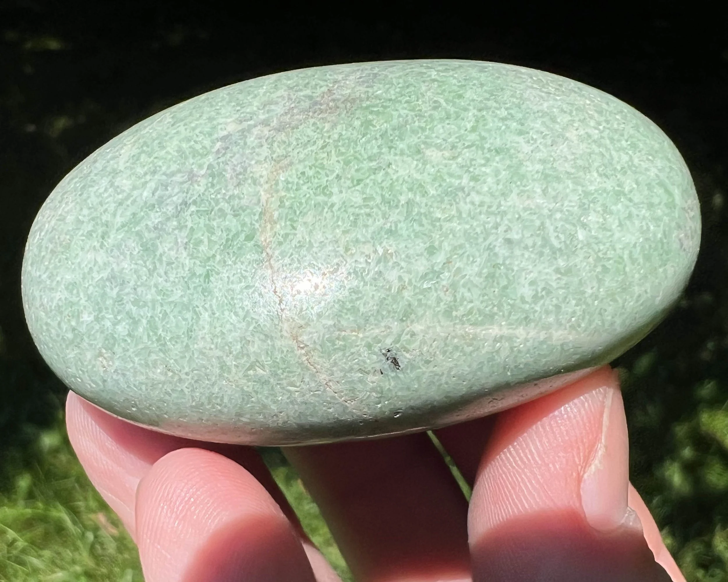 This is a crystal palm stone of rare natural Kammererite from India. It is a variation of Clinochlore and its beautiful natural purple and green colors are from Chromium. This is a smooth polished oval palm stone with bright greens and pretty purples.
