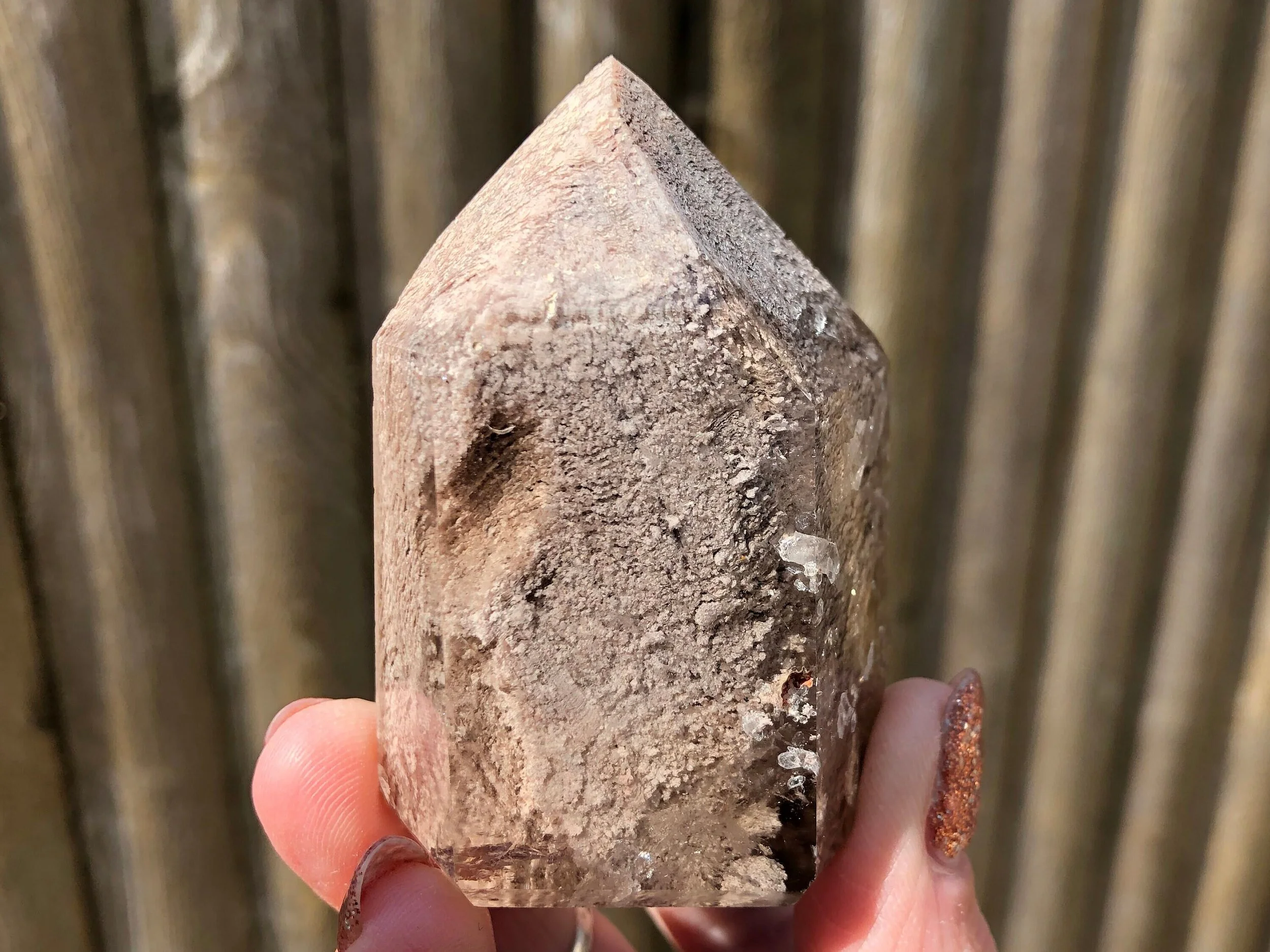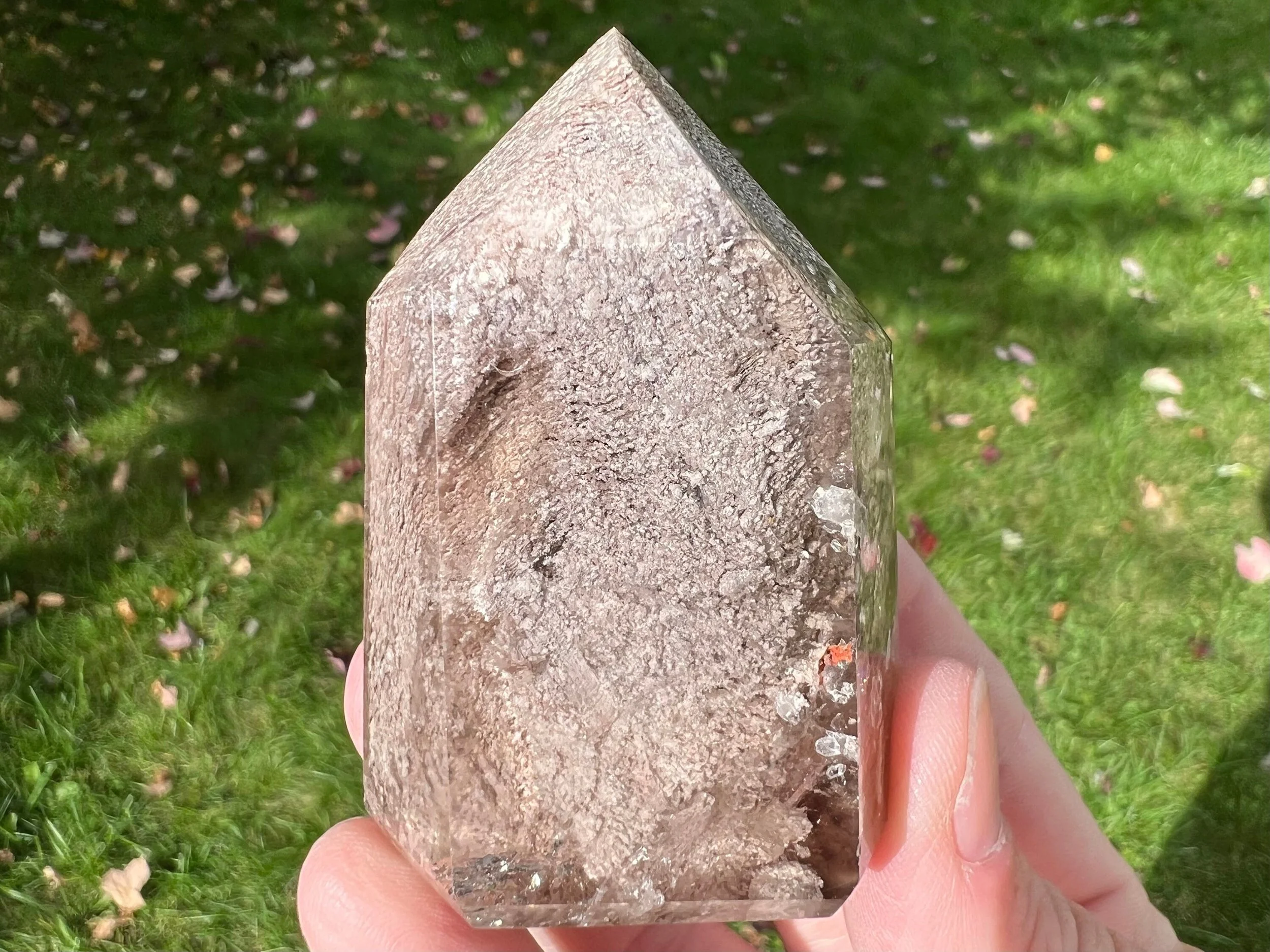 2.5" Lodolite Quartz Point #6 Polished Crystal Tower, Rutilated Quartz & Pink White Inclusion, Gold Rutile, Gemstone Home Decor Gift for Her