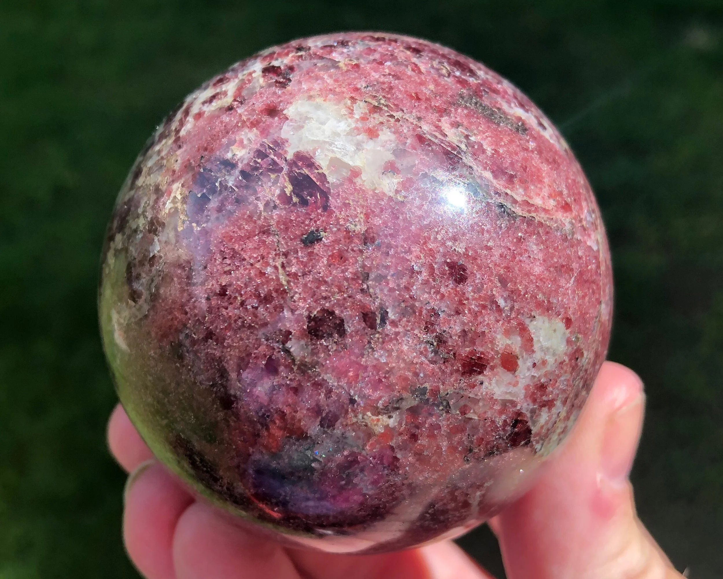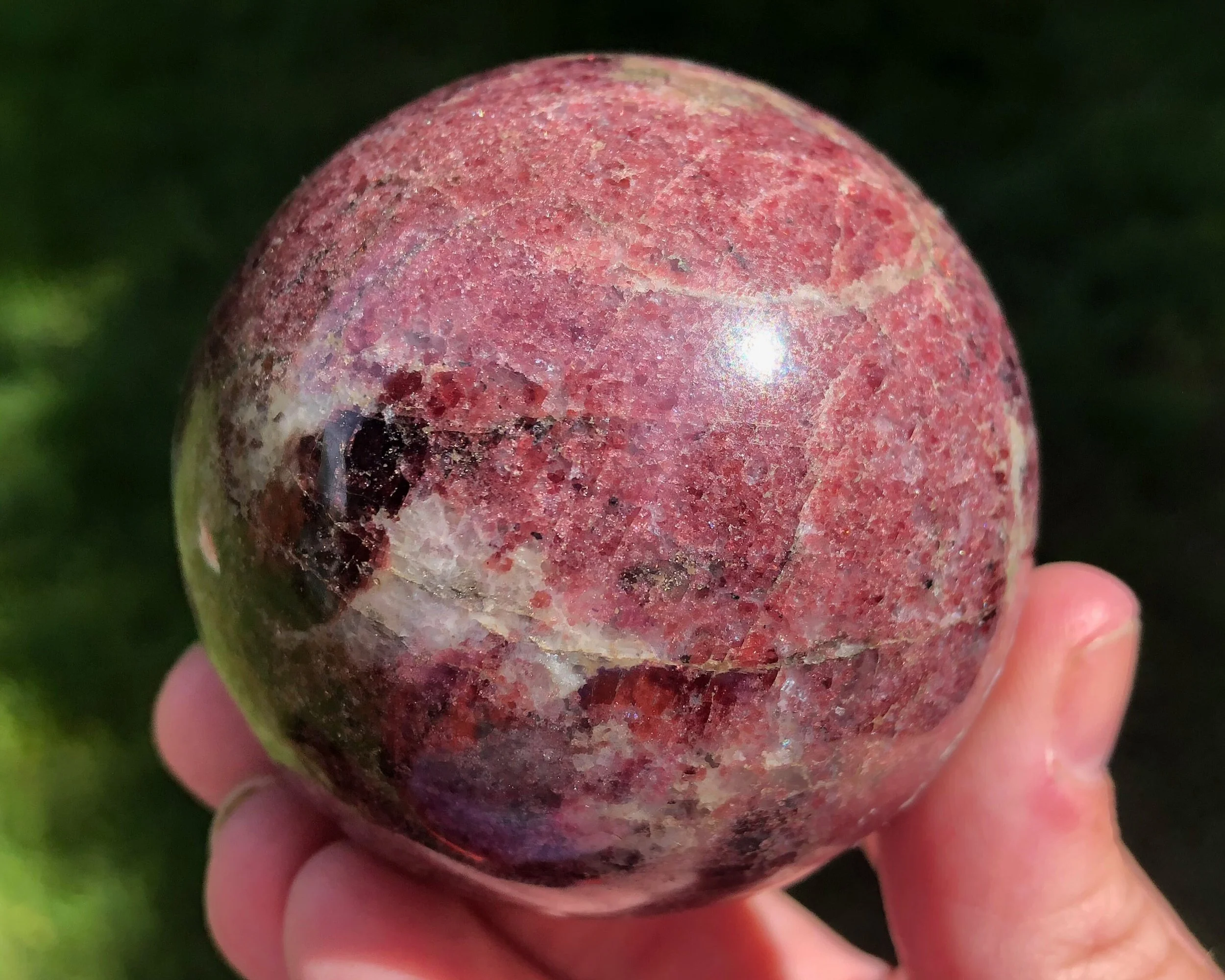 These is a beautiful, deep reddish pink Garnet sphere. It is sparkly and has color of more bright pink against deeper darker red parts. A gorgeous piece!