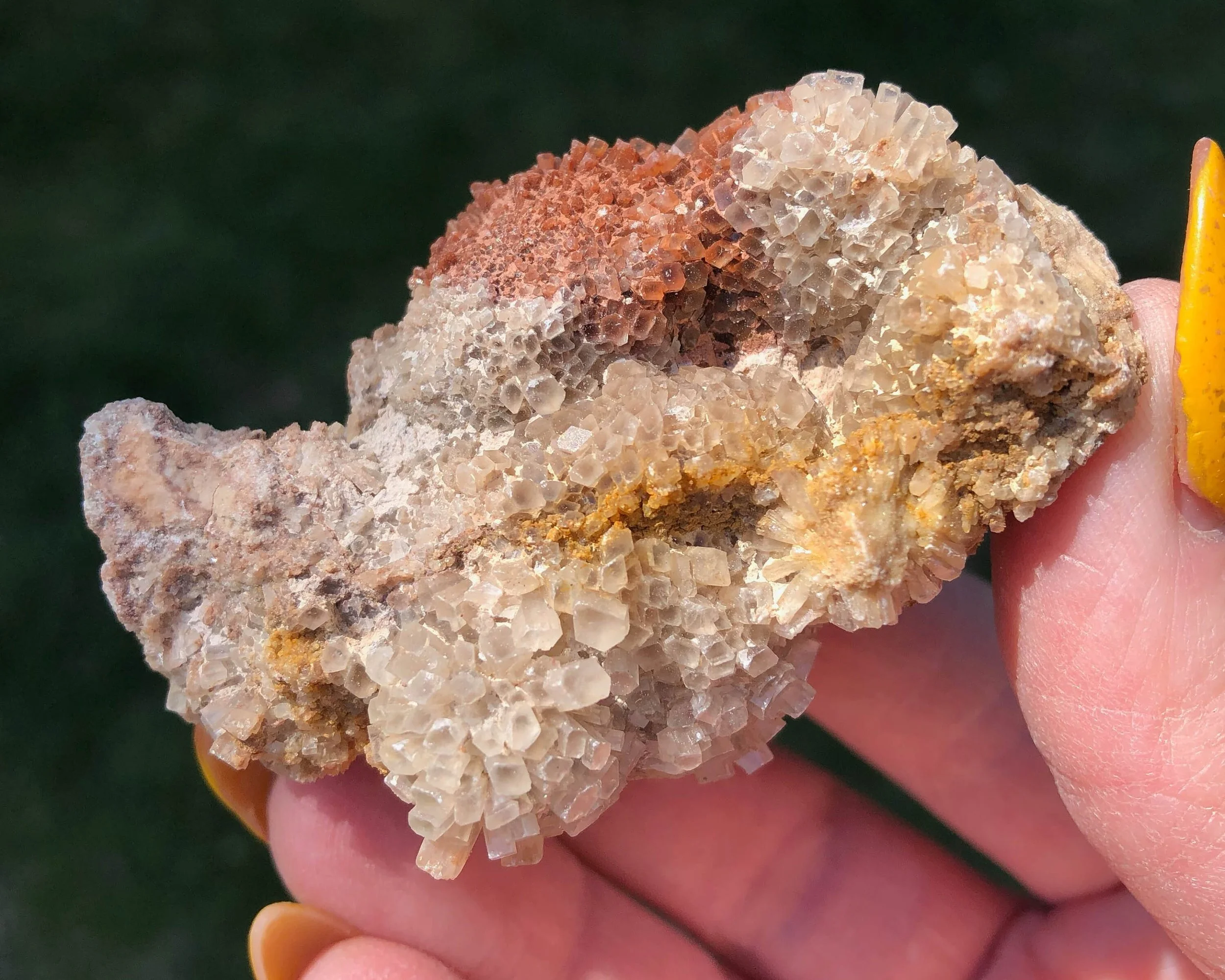 This is a beautiful, bicolor Aragonite druzy cluster from Morocco. It has nice luster, a warm reddish orange coloring mixed with clear/white crystals and the smaller crystals make it look extra sparkly! This one is in really great shape and makes for an excellent piece for your collection or display!