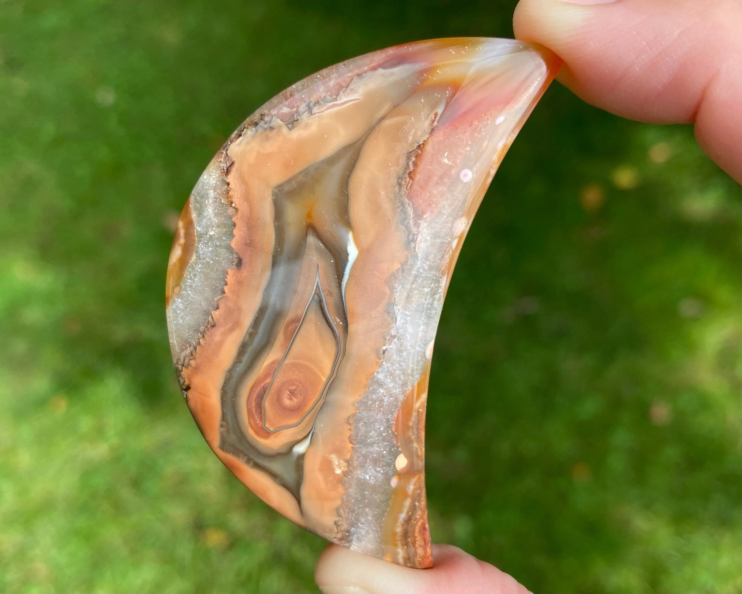 A lovely Carnelian Agate crescent moon with beautiful red orange and white / clear coloring. It is a cabochon, or flat on the back so that it can be used in jewelry.