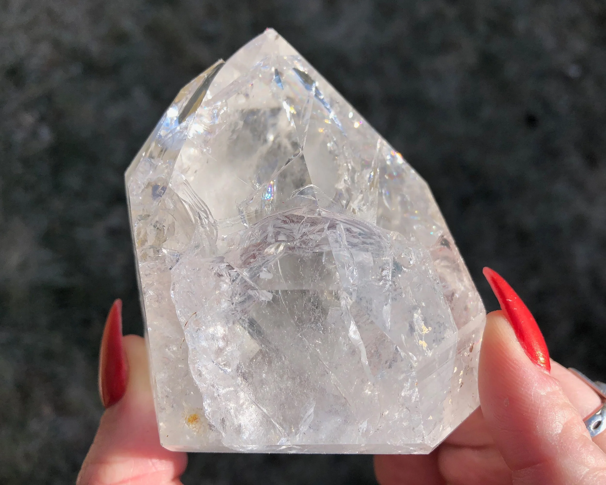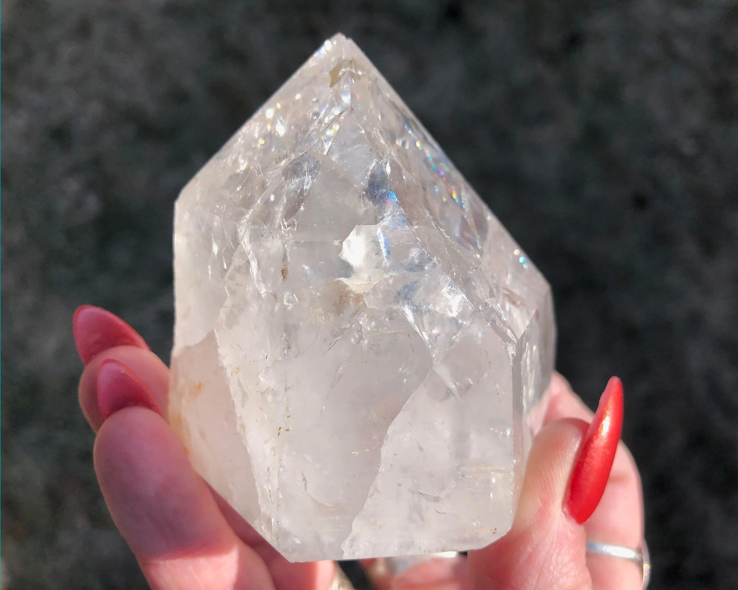 This is a semi-polished Rainbow Lemurian Quartz Tower. These have internal fractures caused by heating and cooling, which reflect light in a way that makes rainbows- much like a prism. It is not coated or treated or painted, it is a clear Quartz point full of rainbows! This is a Lemurian Quartz point with good clarity classic to Lemurian Quartz.