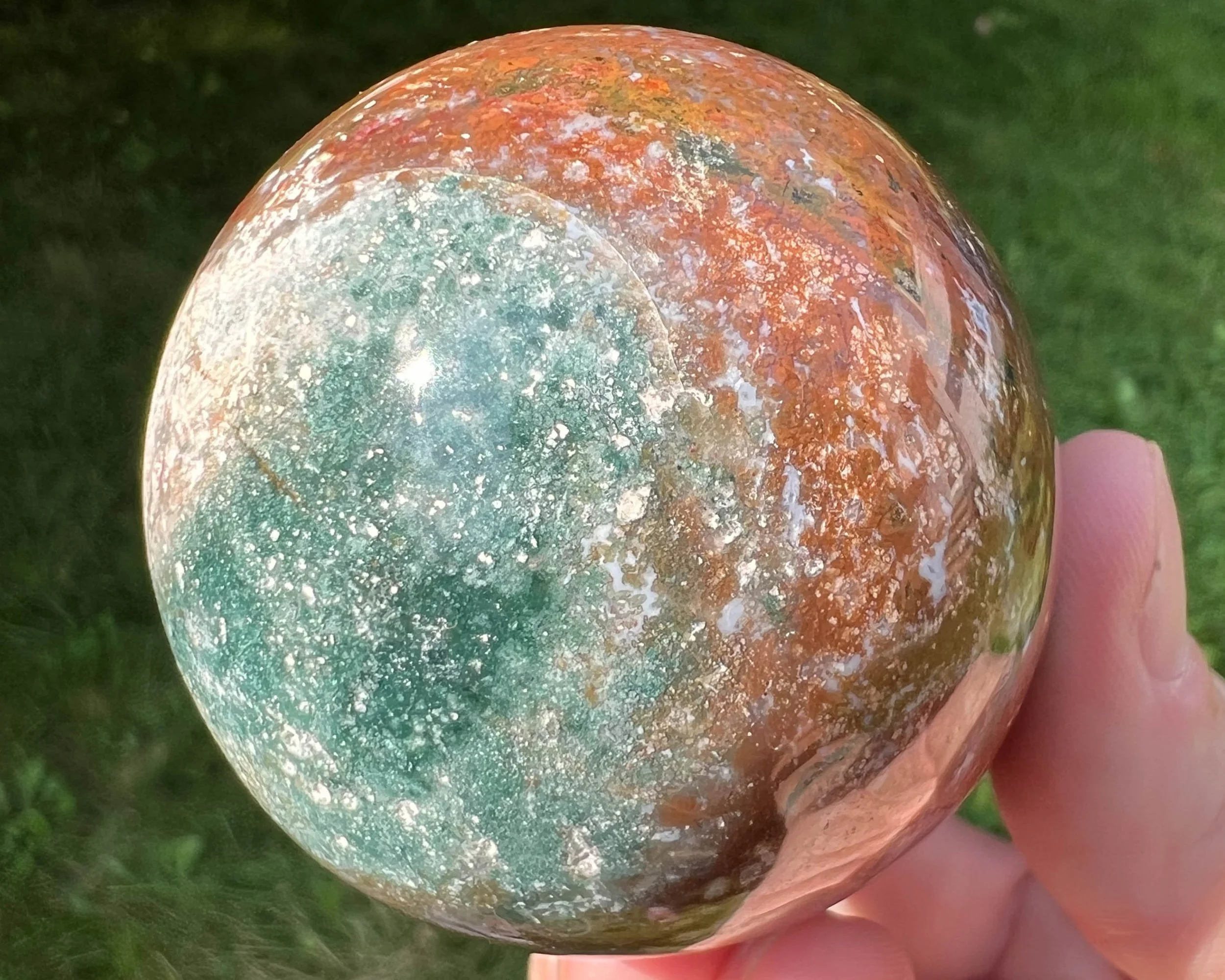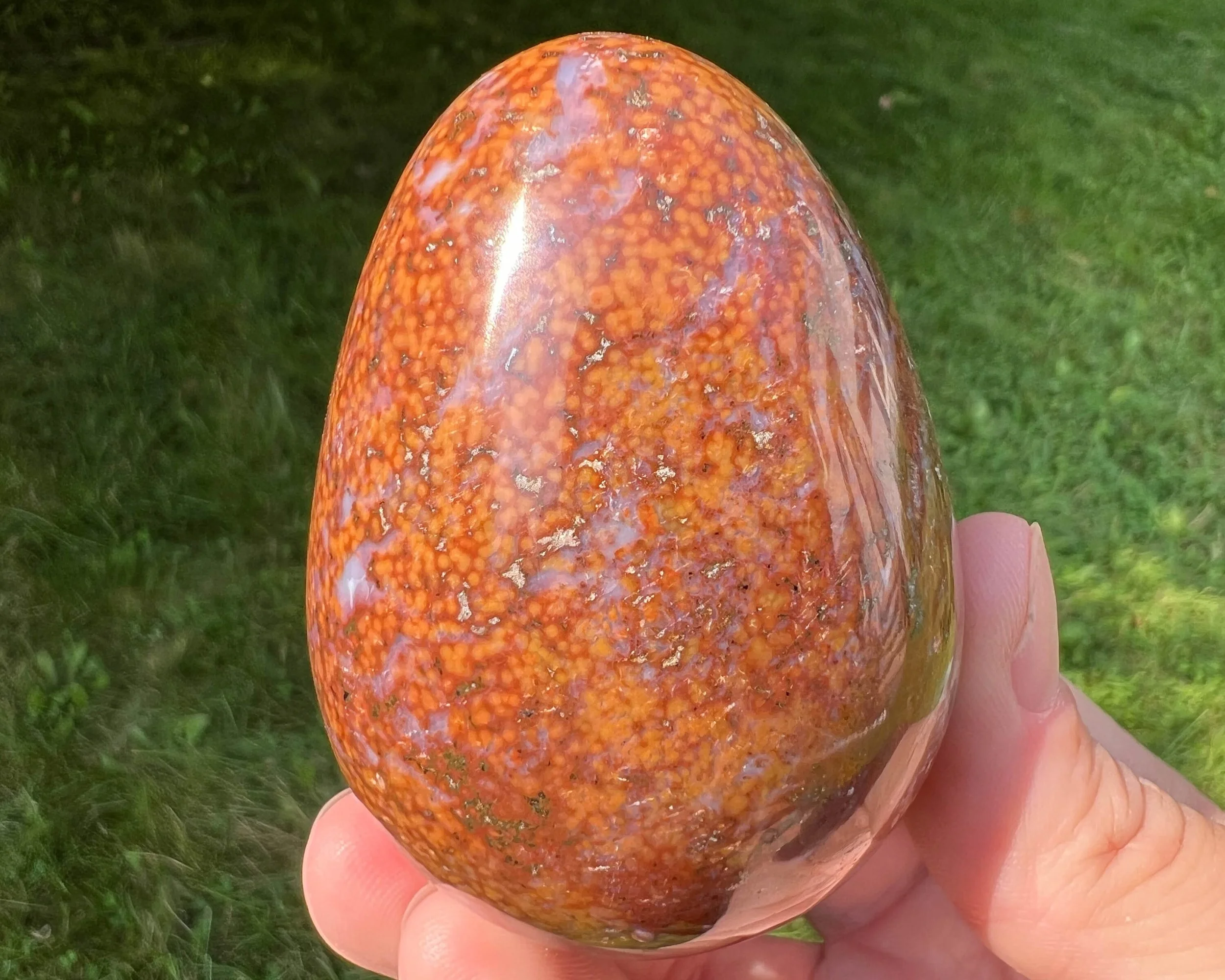 This is an Ocean Jasper crystal egg with mostly red, orange and green color. The orange is mostly in the orbicular pattern over a more reddish color. A pretty, natural stone cut and polished into an egg shape.
