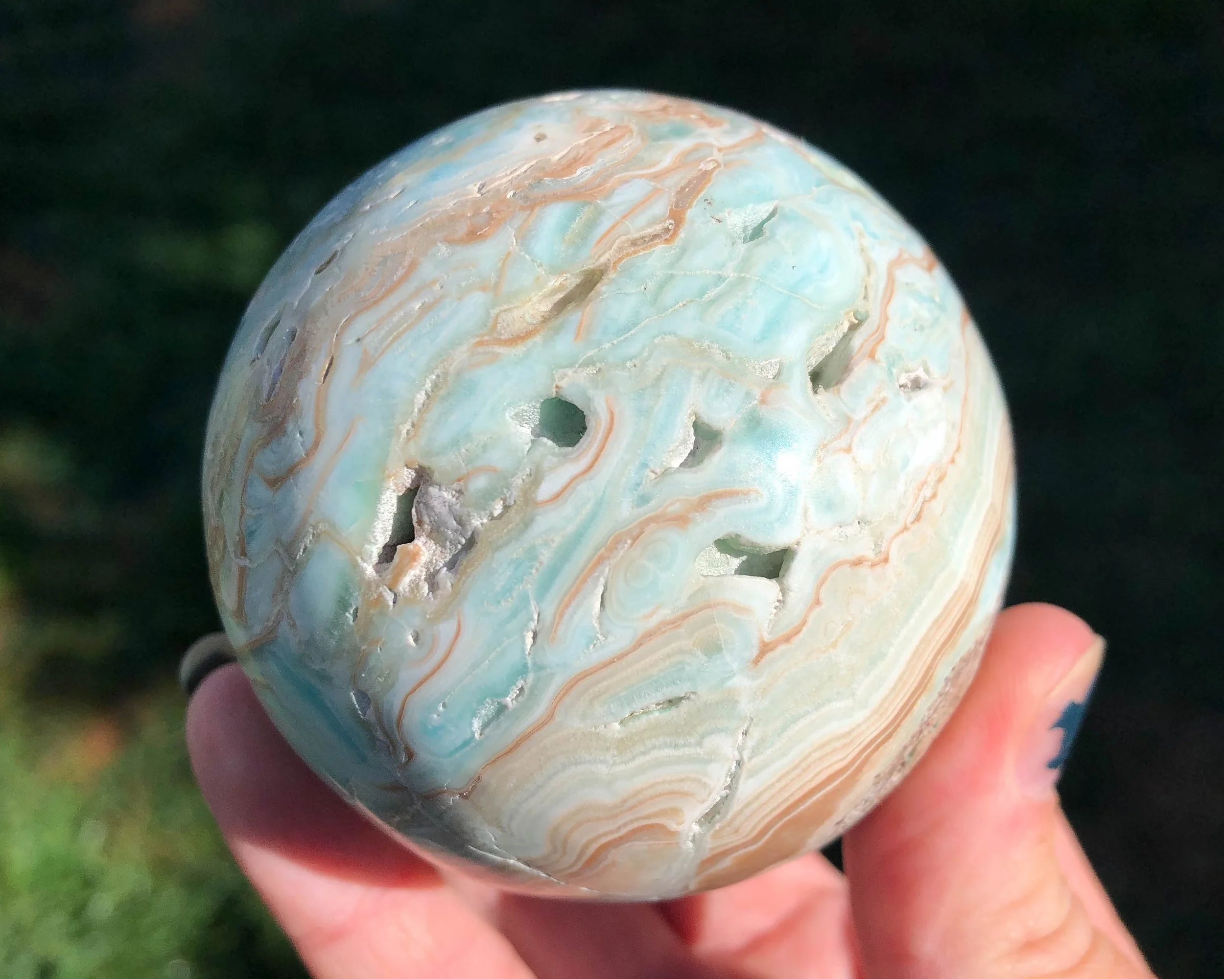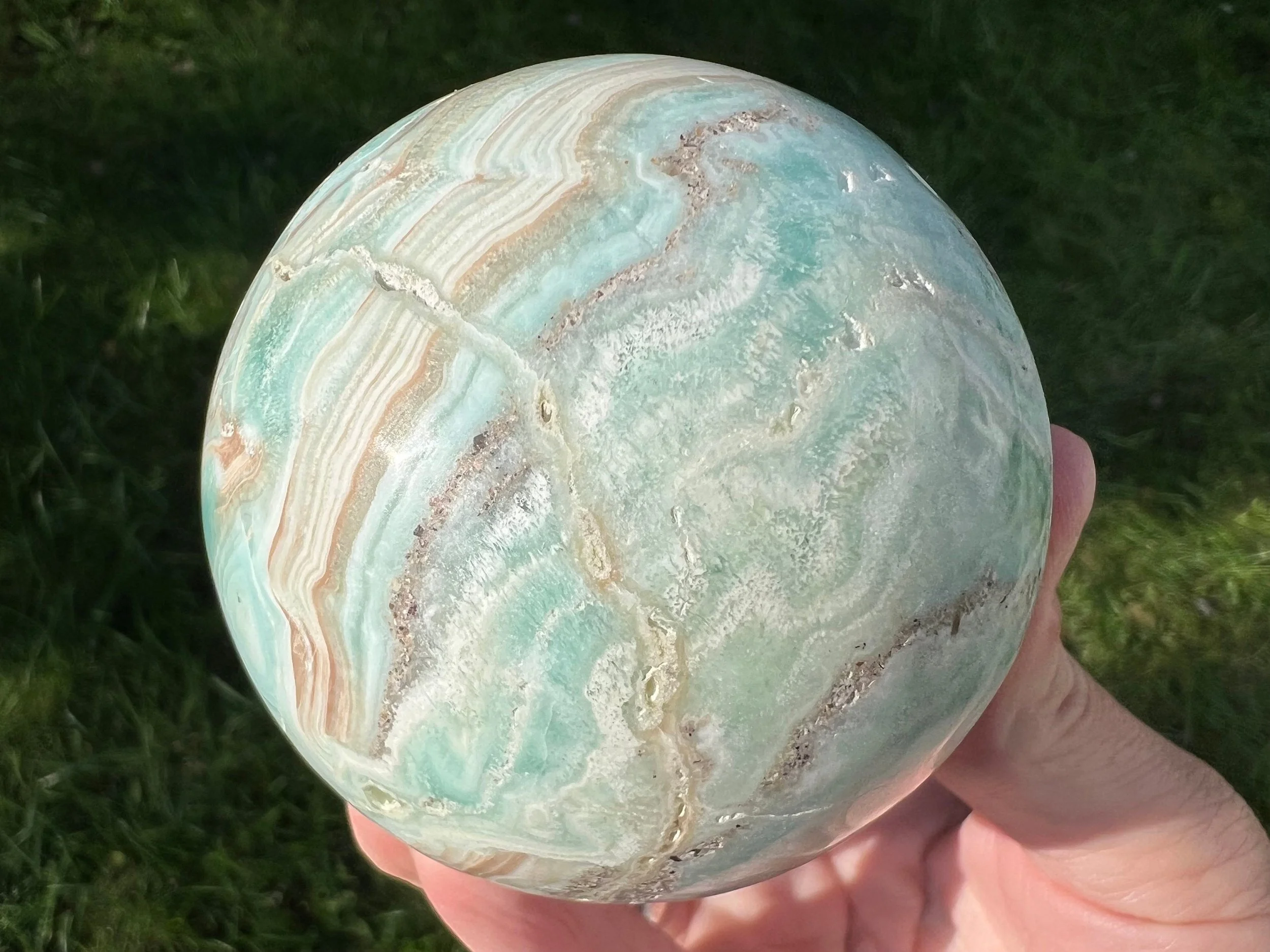 This is natural, beautifully banded aqua blue Aragonite carved and polished into a crystal sphere. It has little open pockets of tiny crystals too. It has lovely bands of aqua blue, white and light brown resembling the Caribbean and is sometimes called Caribbean Calcite. A gorgeous sphere of wonderful material.