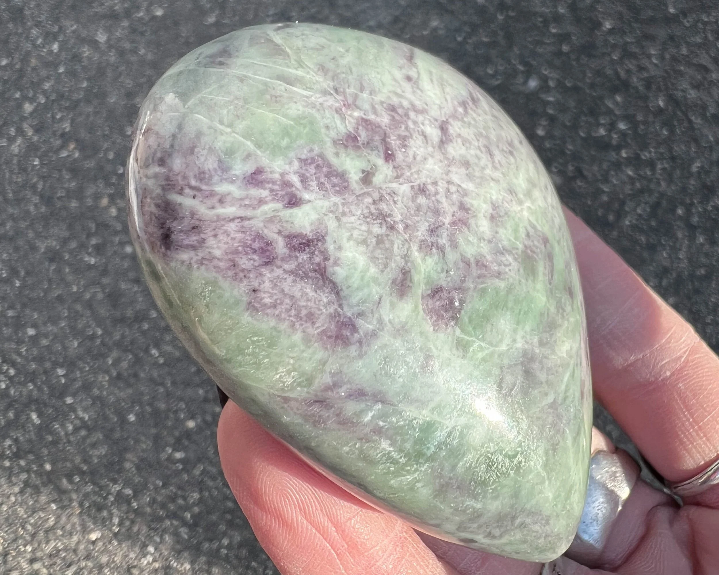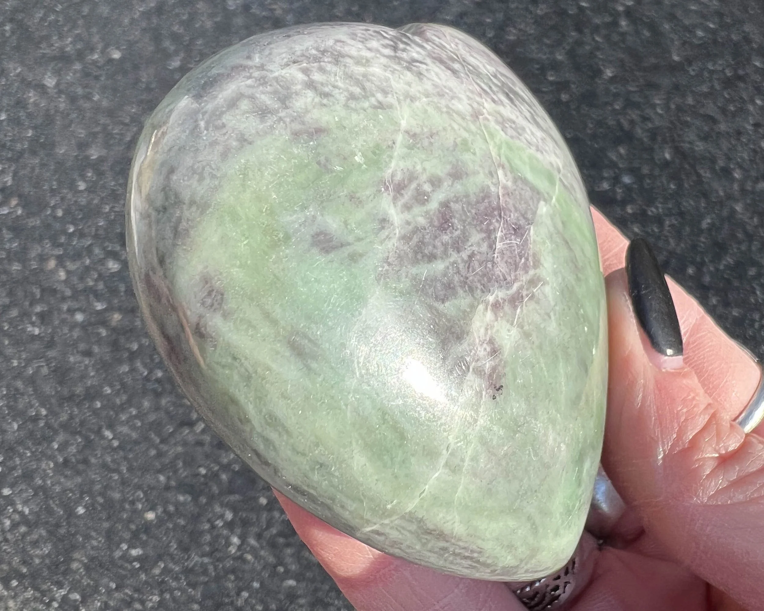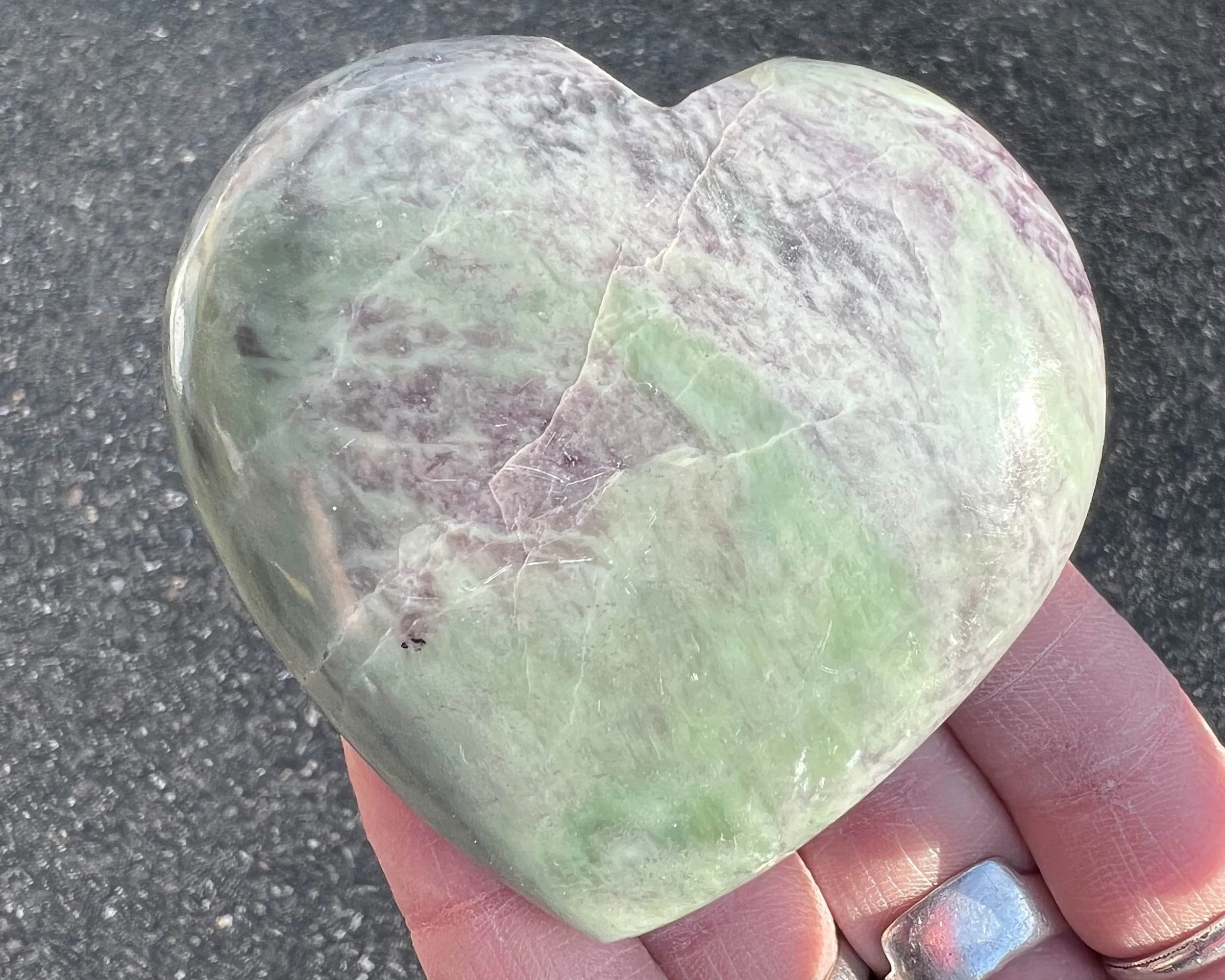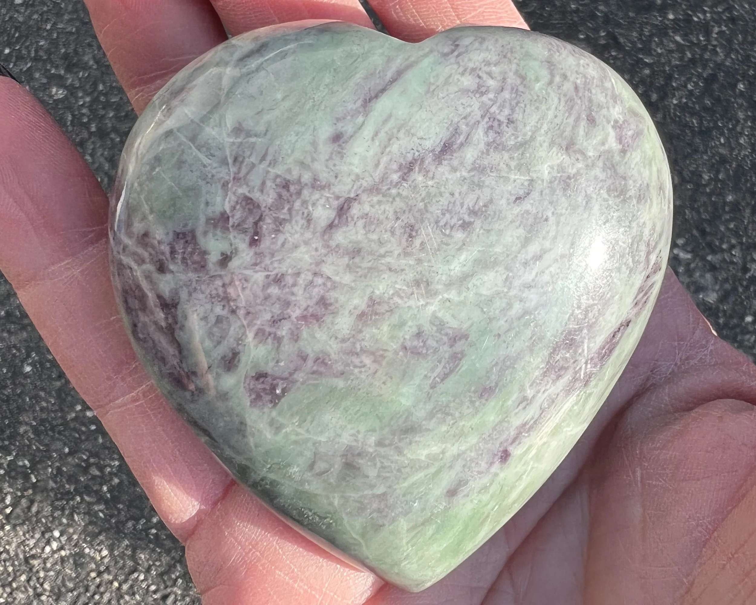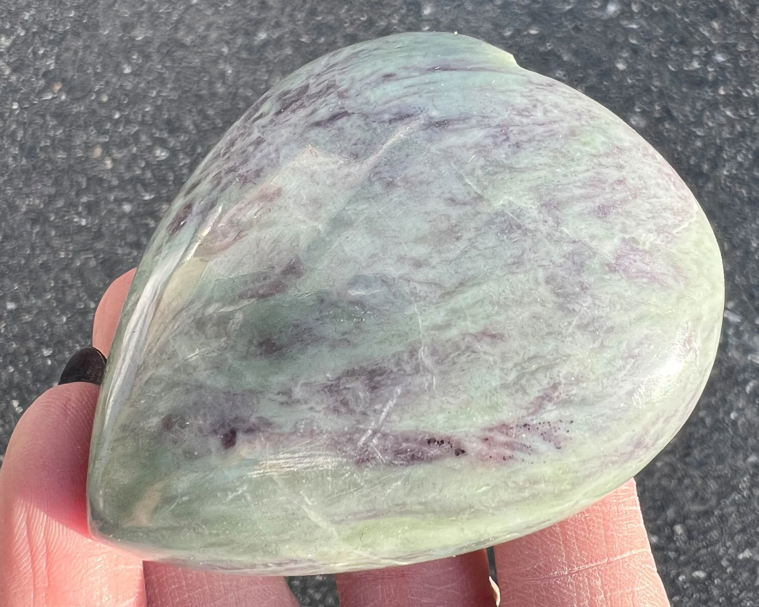 This is a heart made of rare Kammererite from India. It is a variation of Clinochlore and its beautiful natural color is from Chromium. This is a polished heart with soft mint greens and pretty purples.