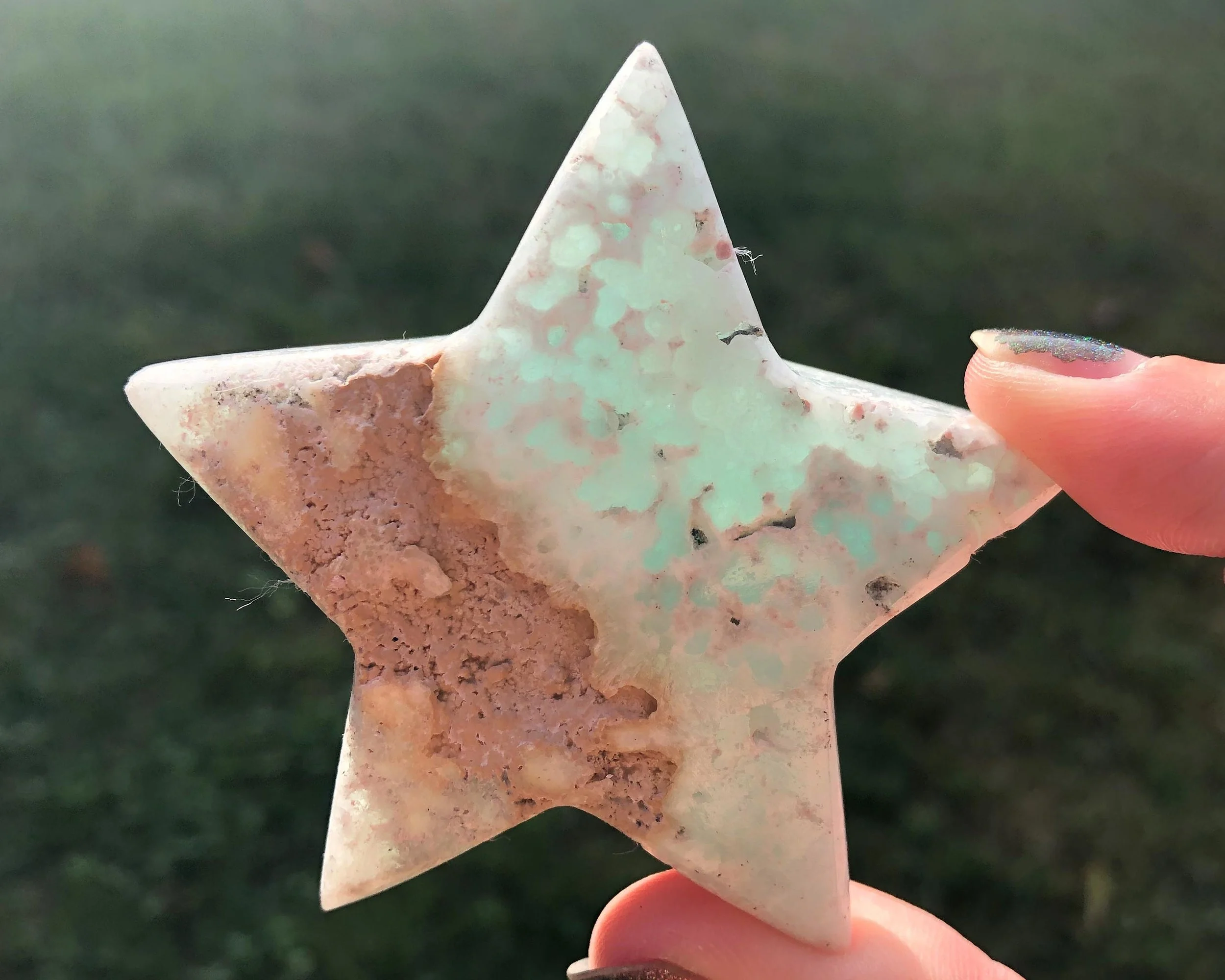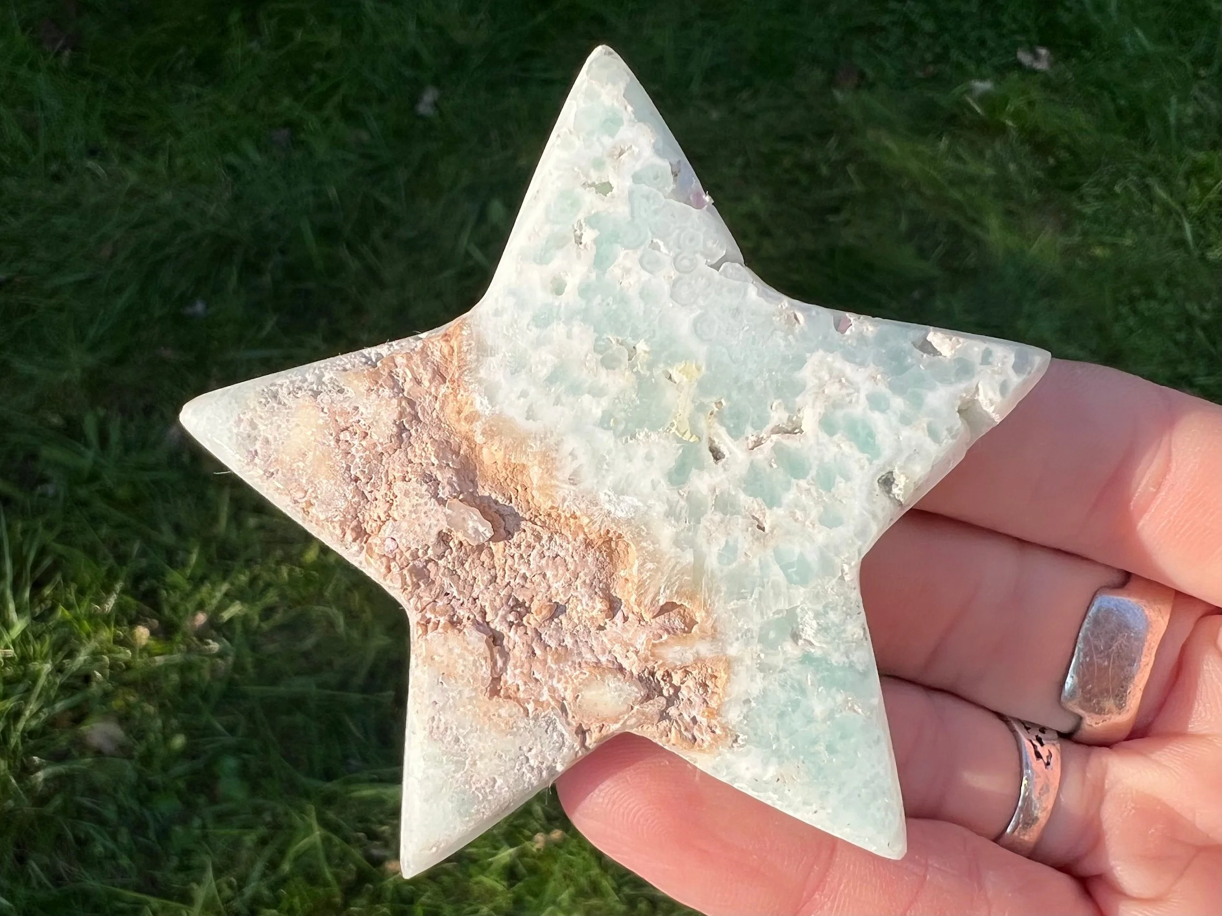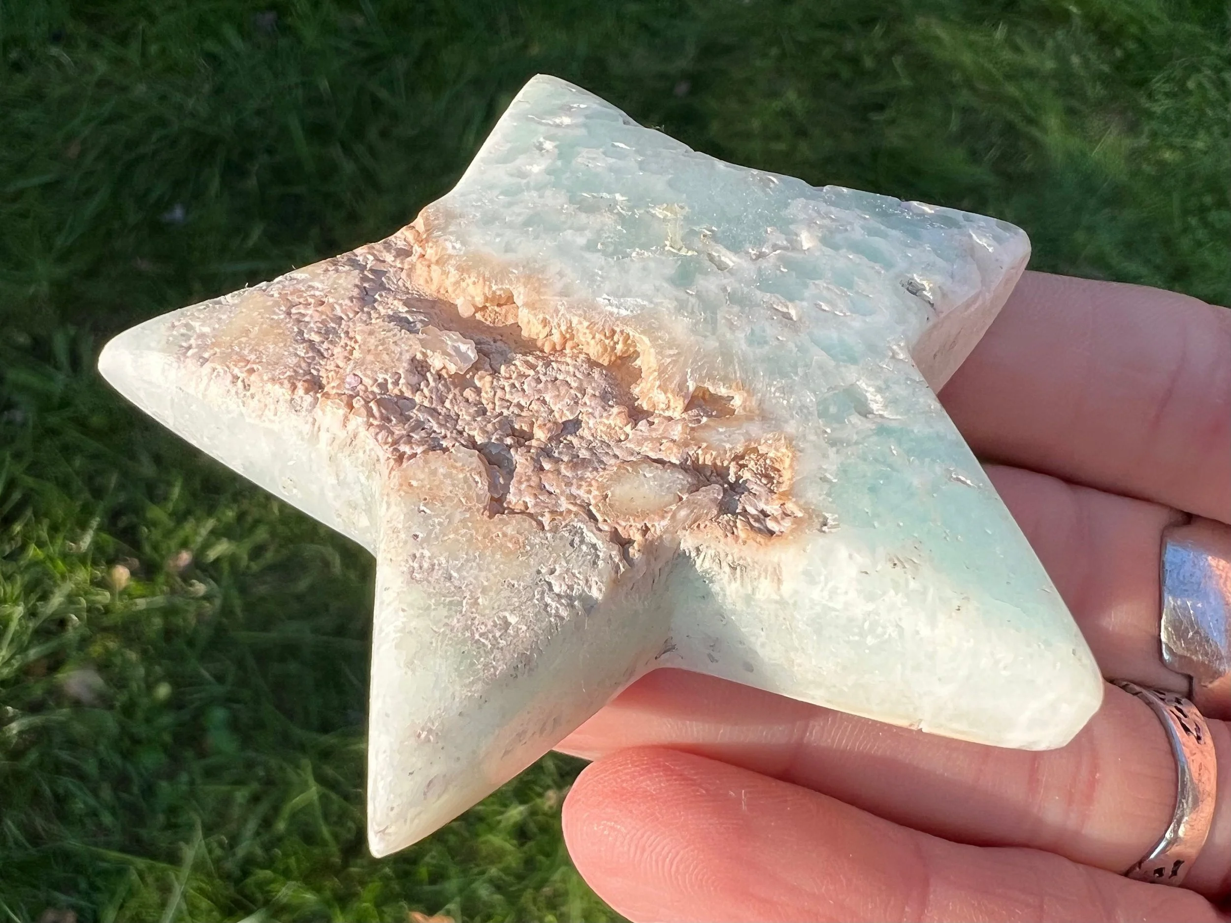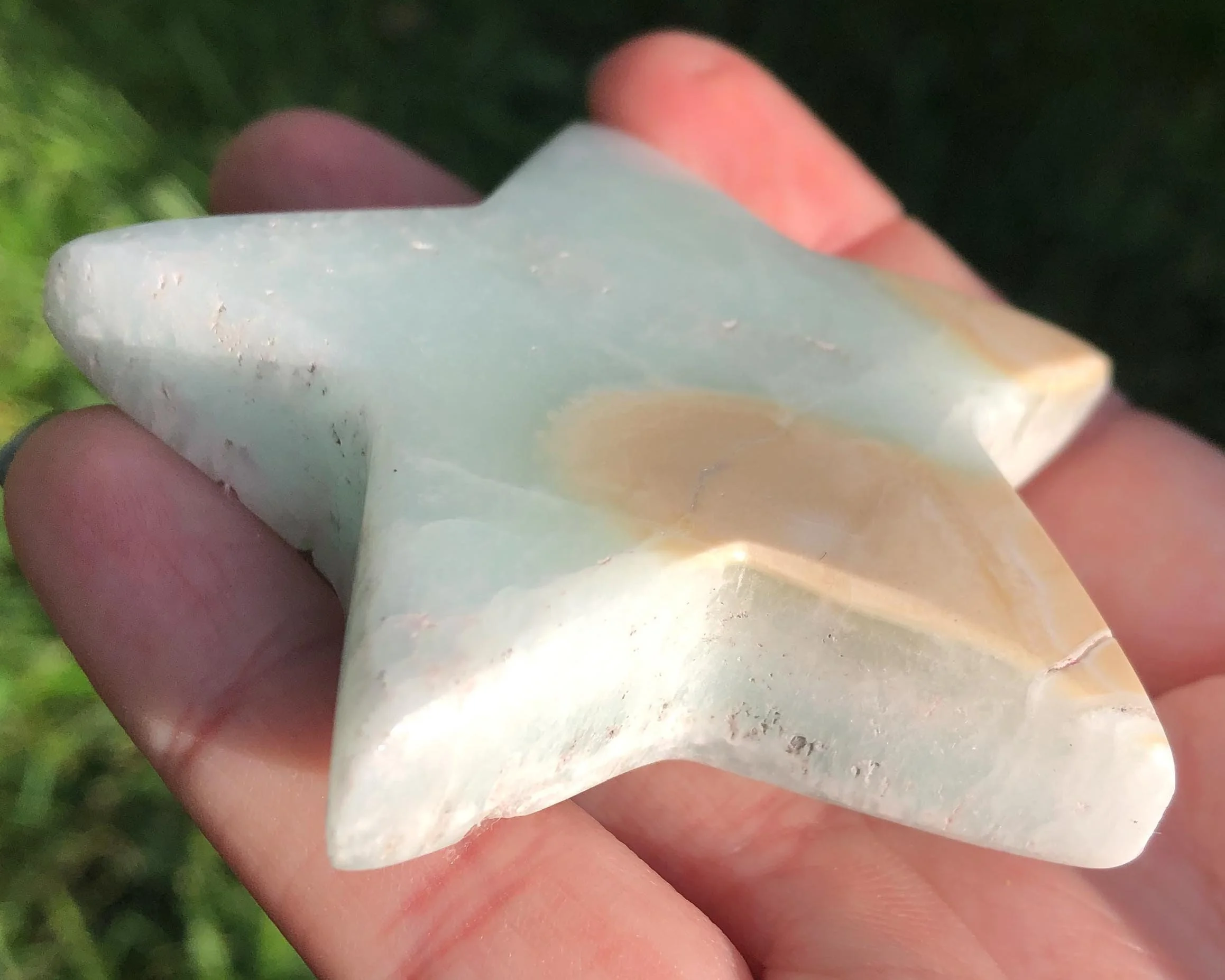 This is a crystal star made of natural Caribbean Calcite. It is cut and polished from natural stone. It is a beautiful aqua blue color with some light tan and white, reminiscent of the Caribbean Sea. Very pretty gemstone star carving.